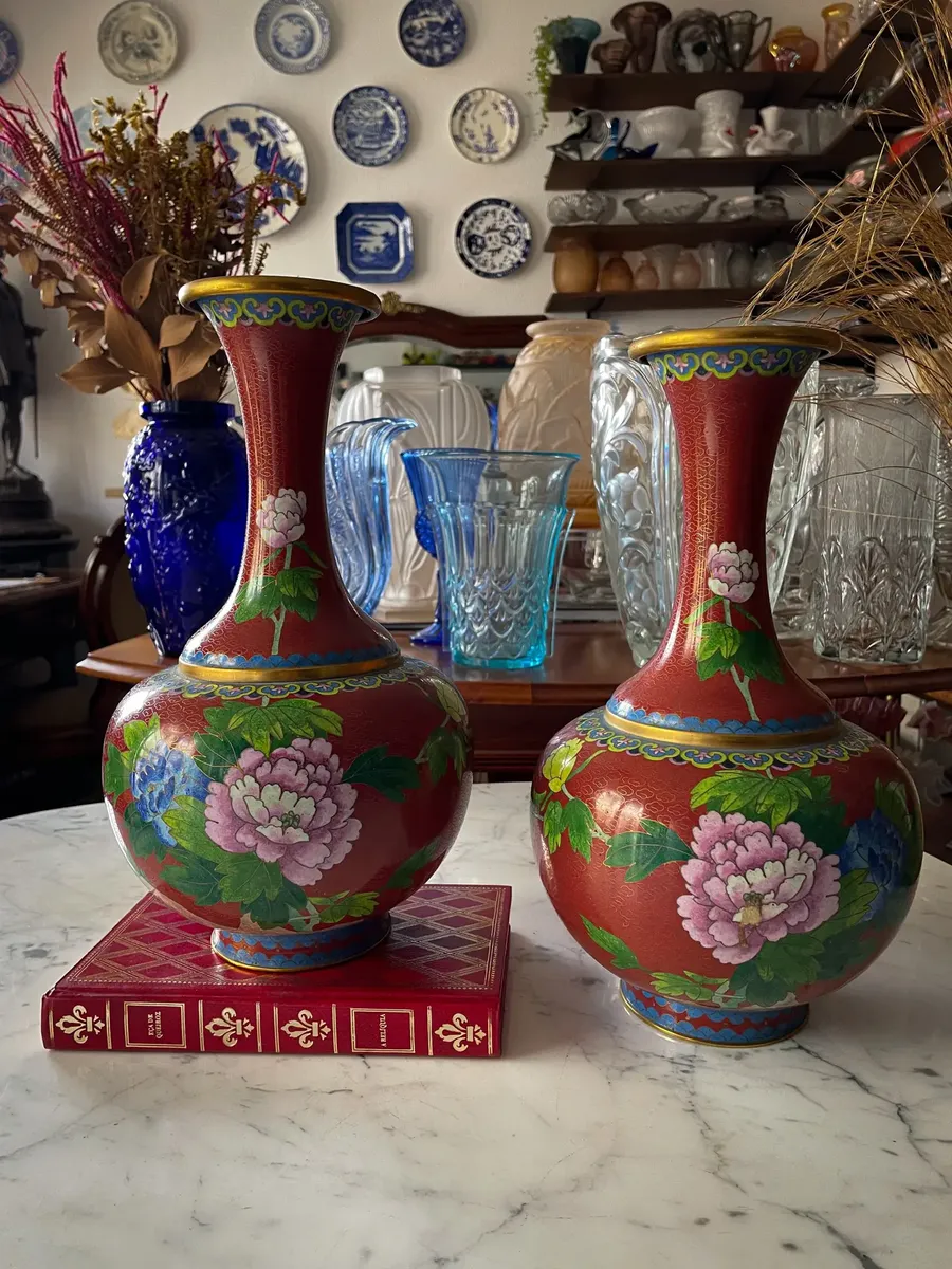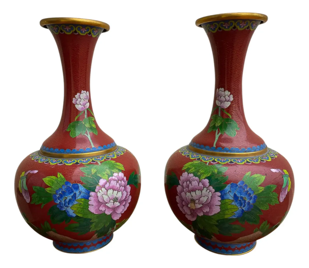 ~ Cloisonné ~Antigo e belíssimo par de vasos decorativos em bronze esmaltados à mão.