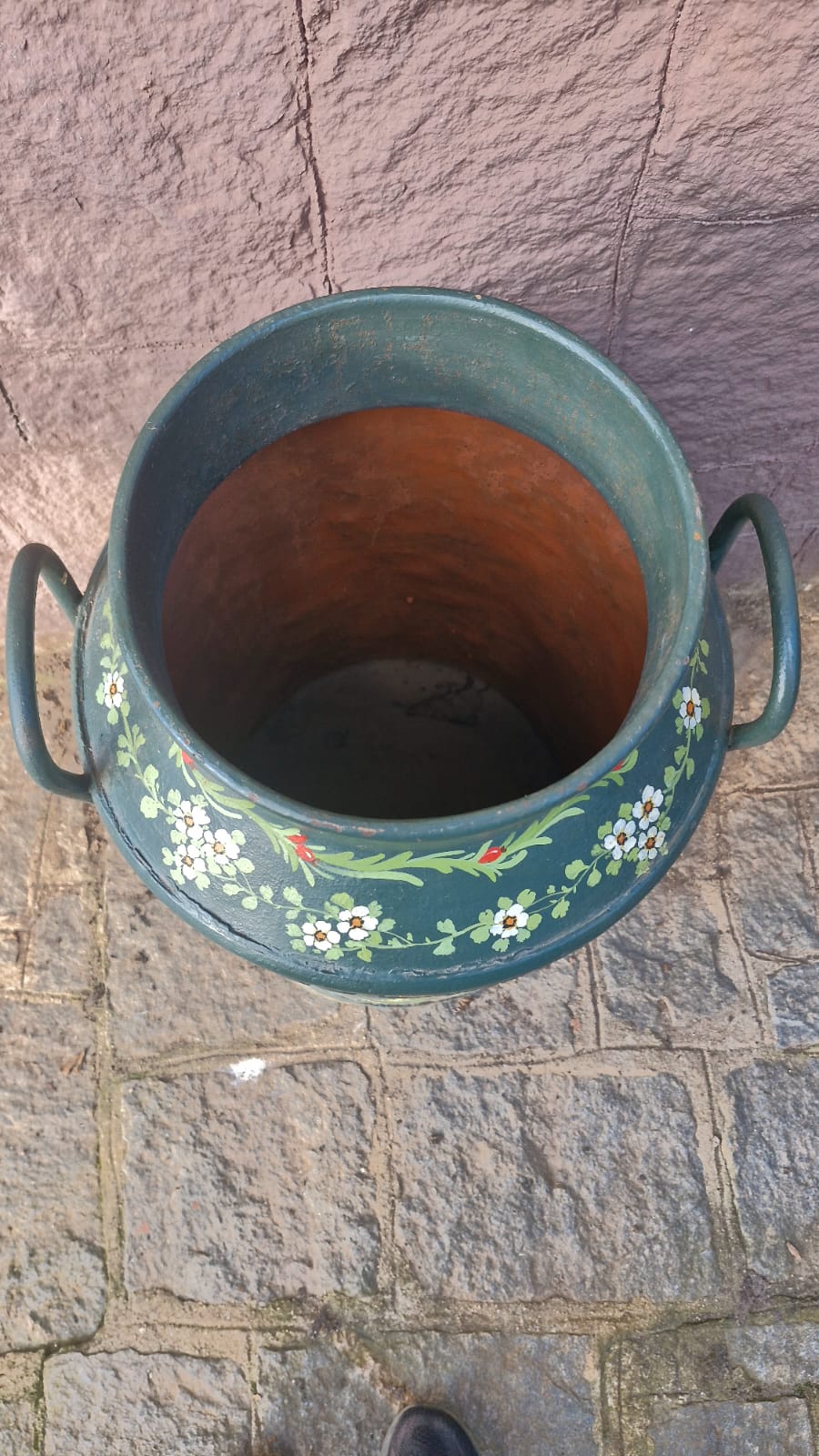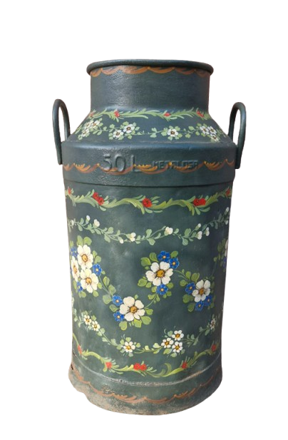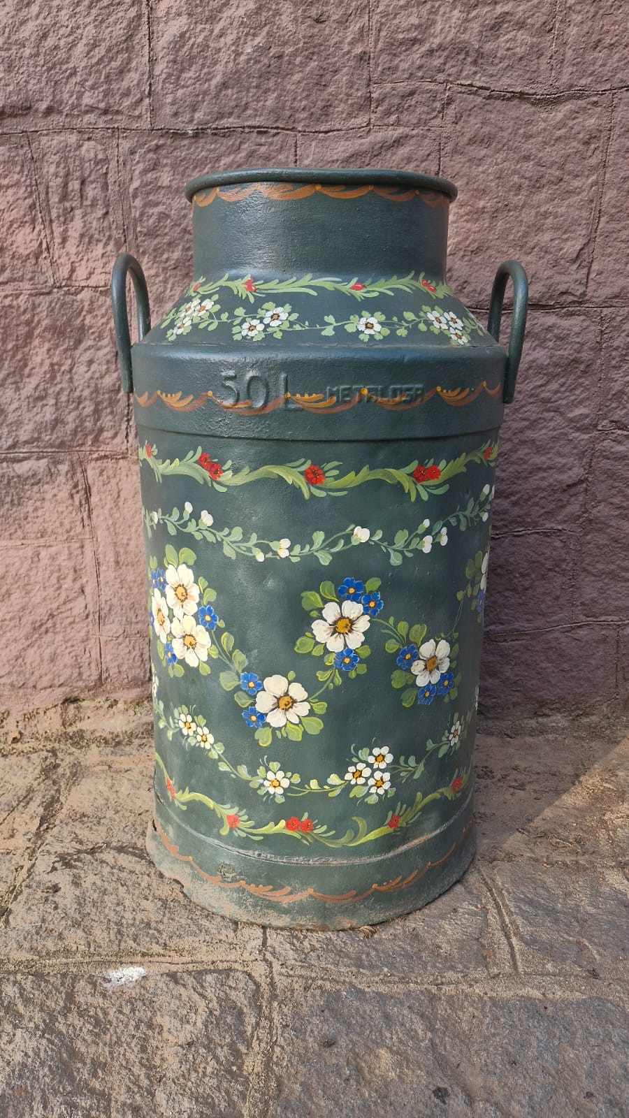 Lindo latão de leite antigo, que foi transformado em um objeto decorativo através de uma técnica de pintura artesanal que segue uma estética de arte camponesa ou Bauernmalerei, muito comum em regiões de colonização europeia e em cidades de montanha.