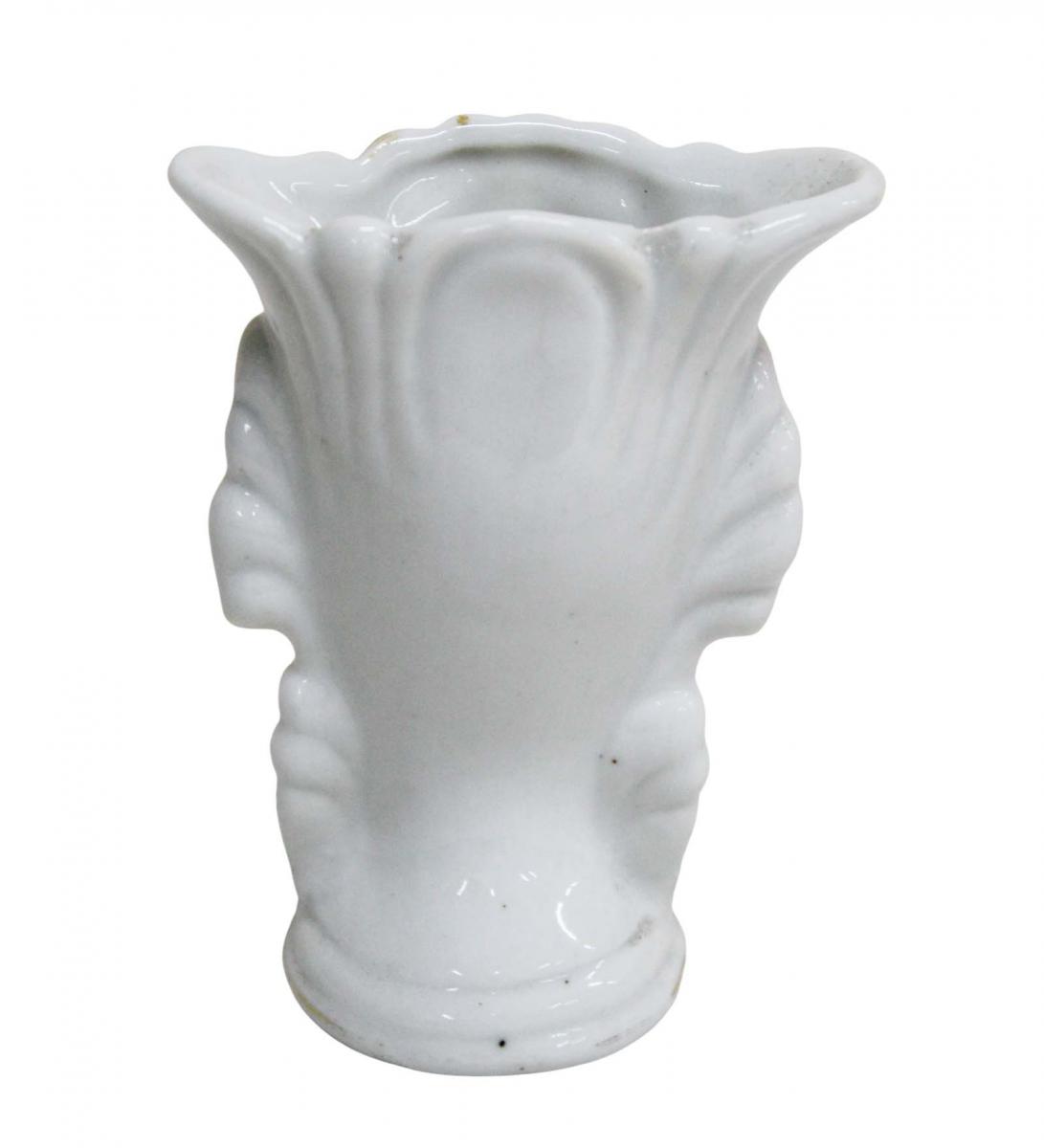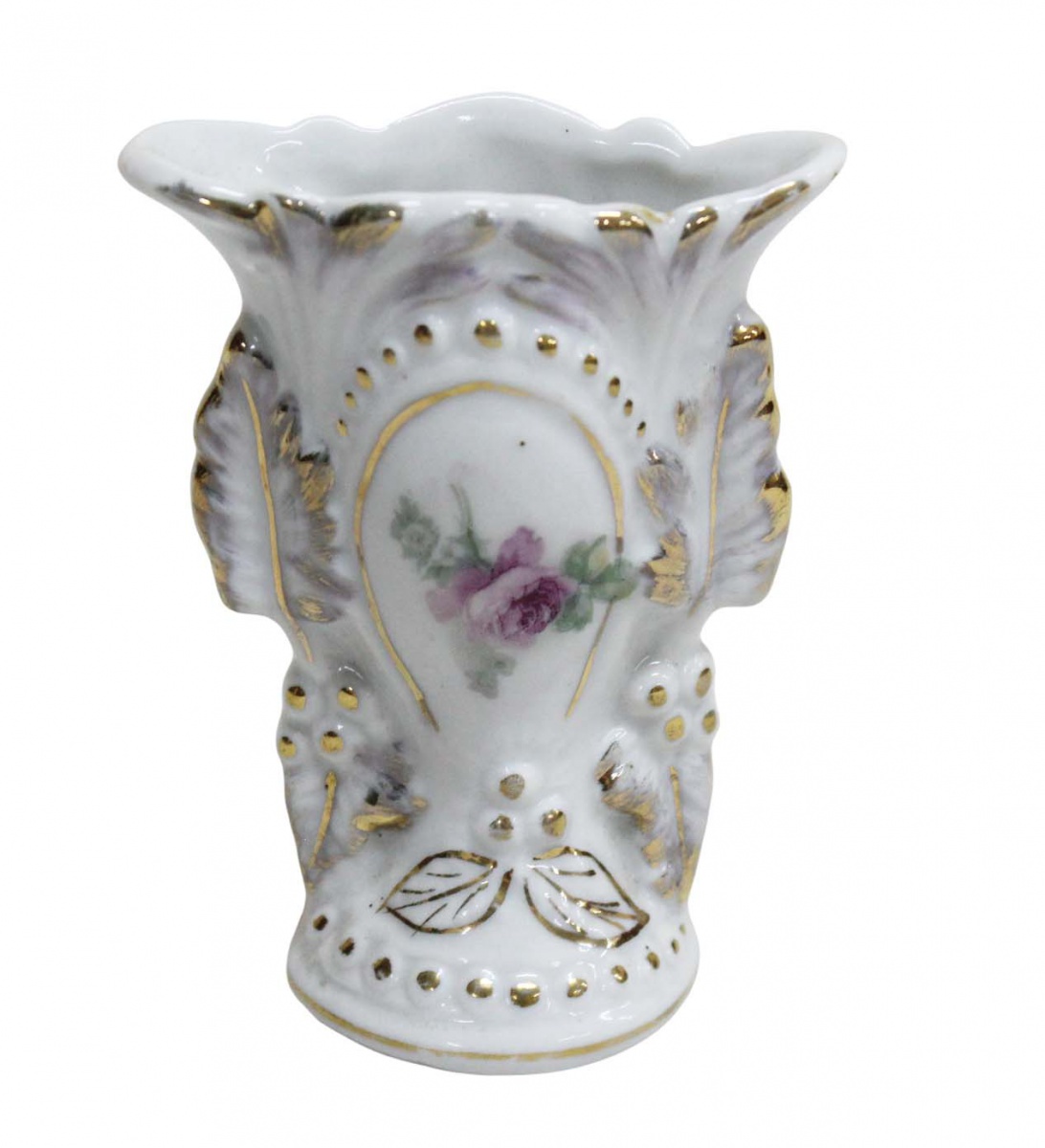 Pequeno e antigo floreiro, em porcelana branca, com decoração em relevos de folhas e flores em policromia com douração.