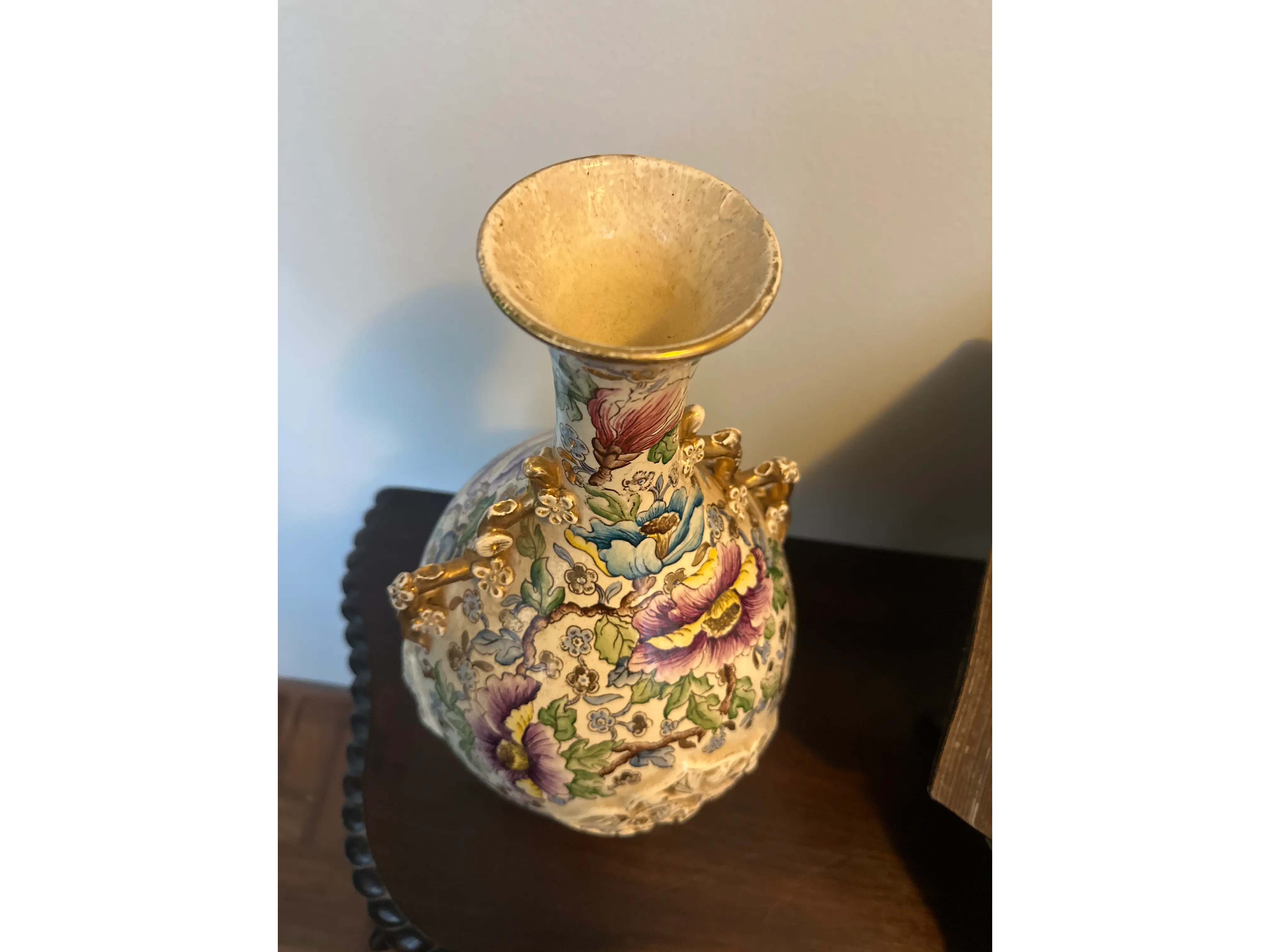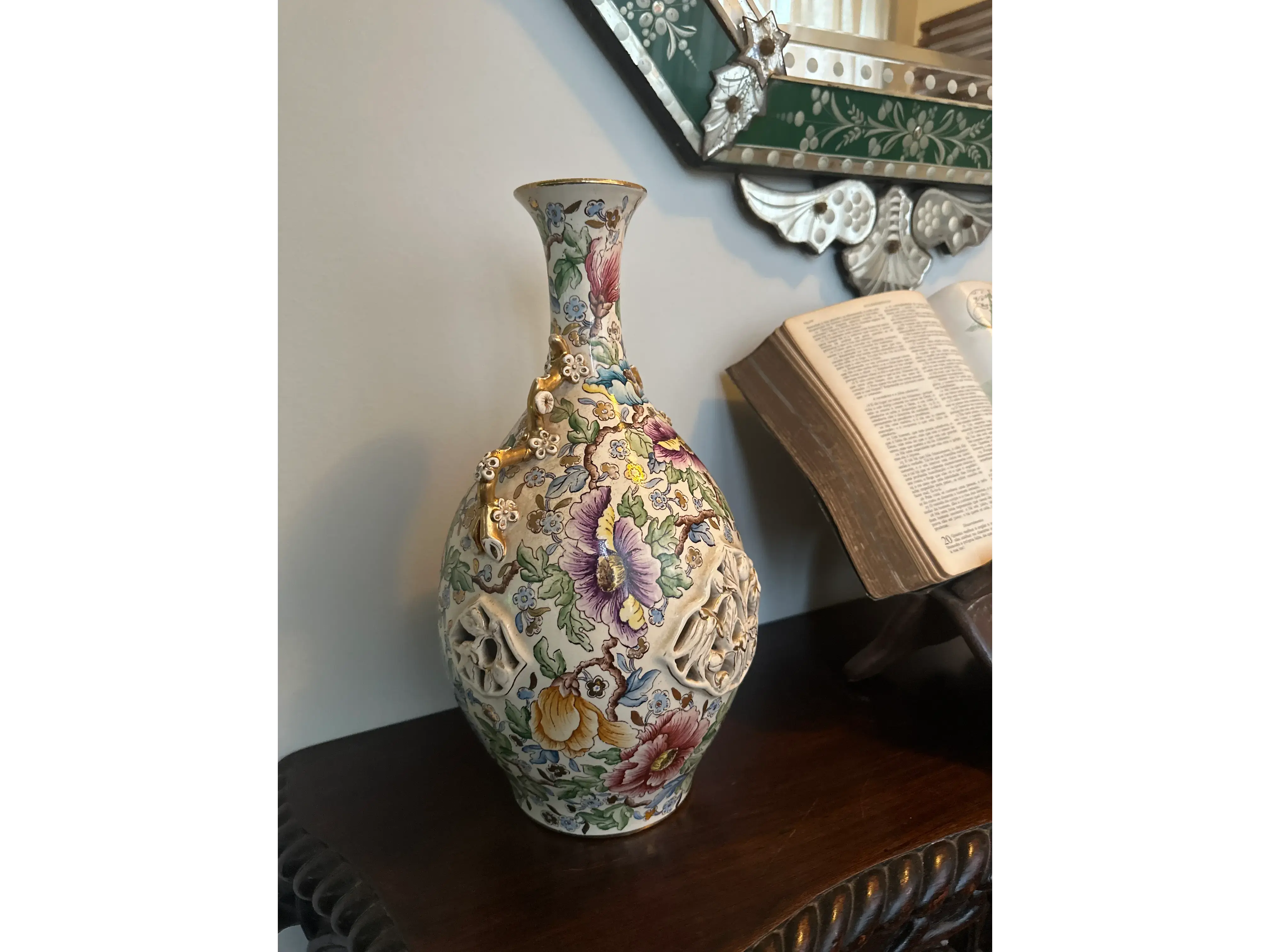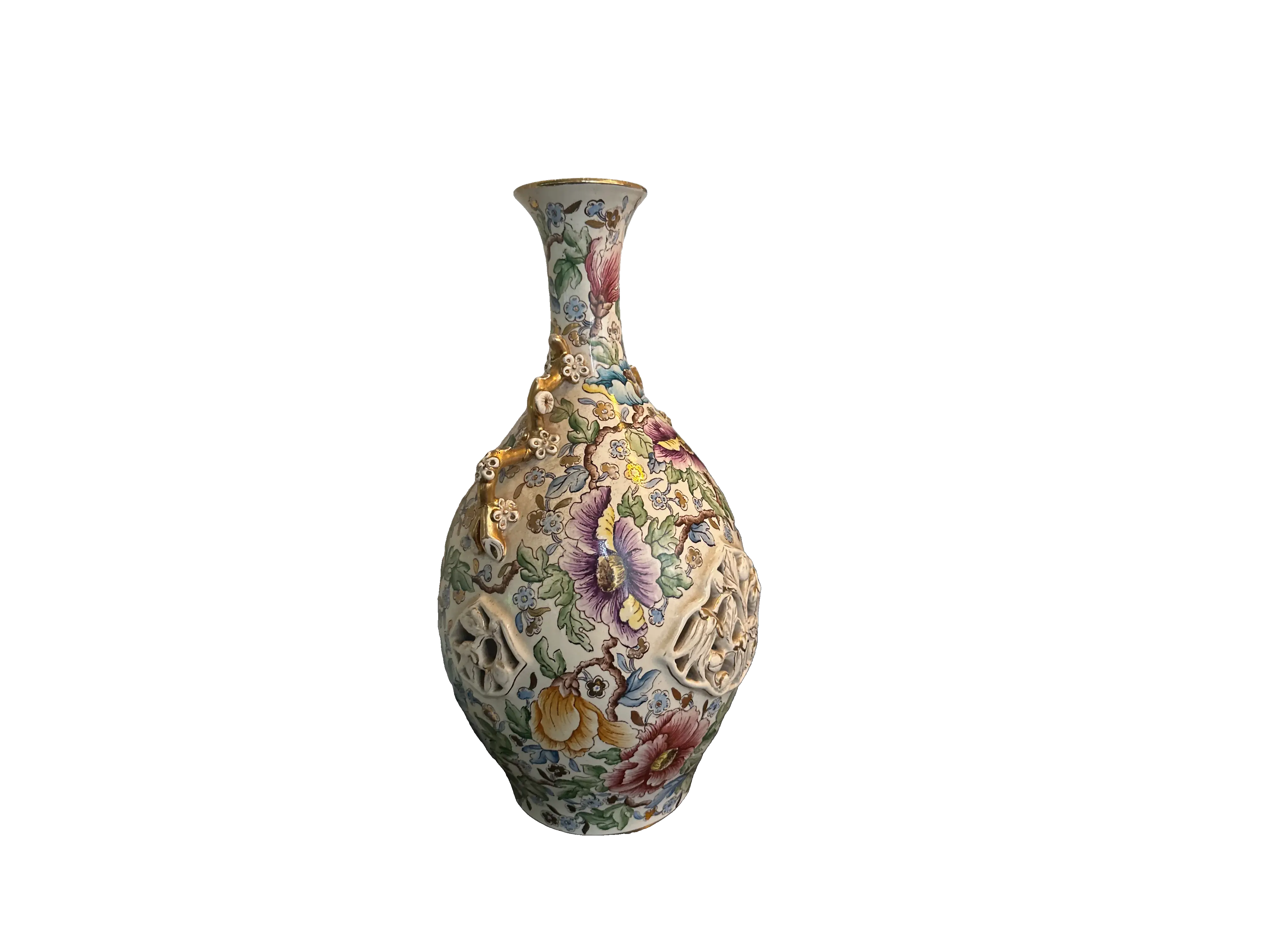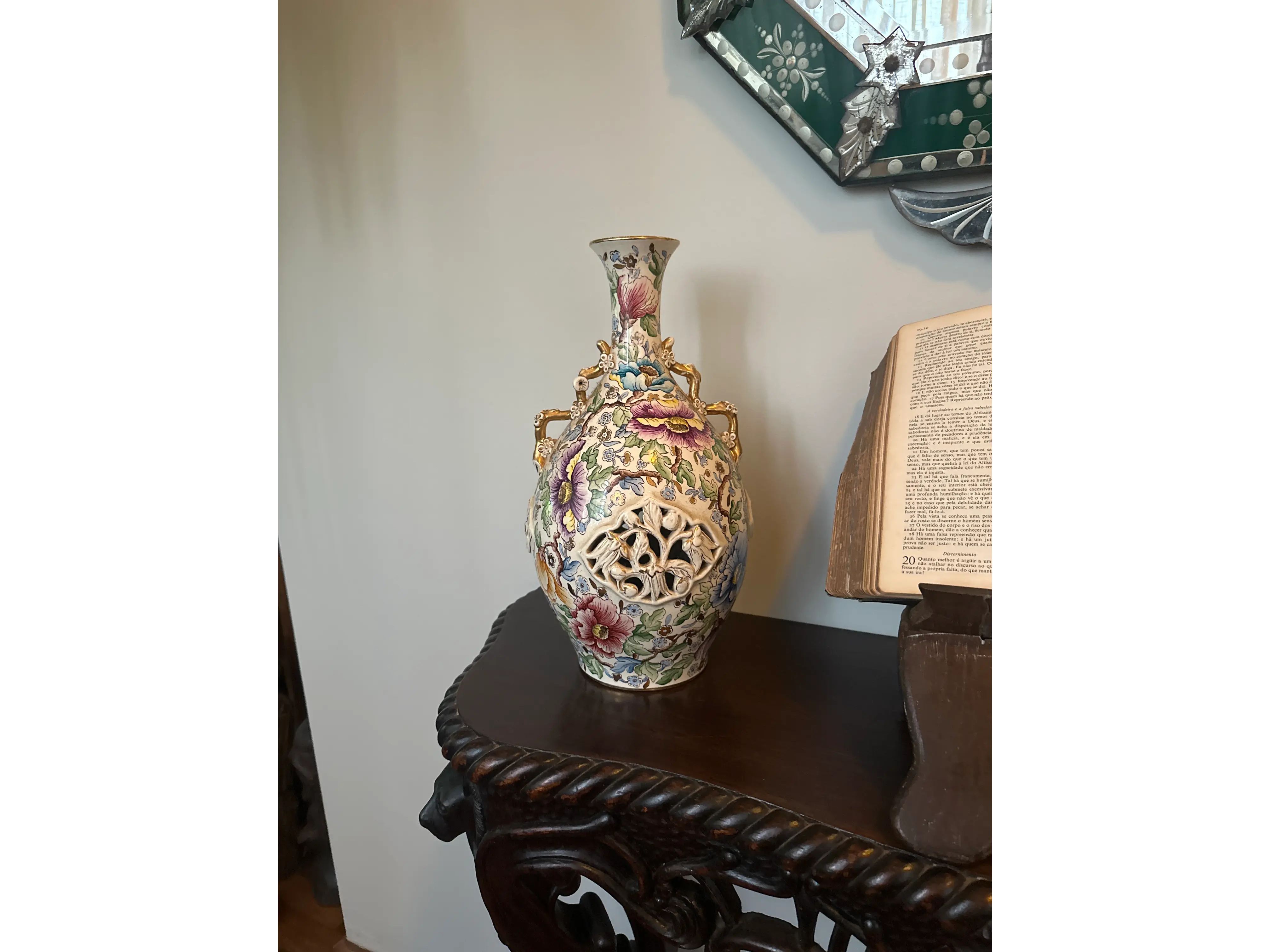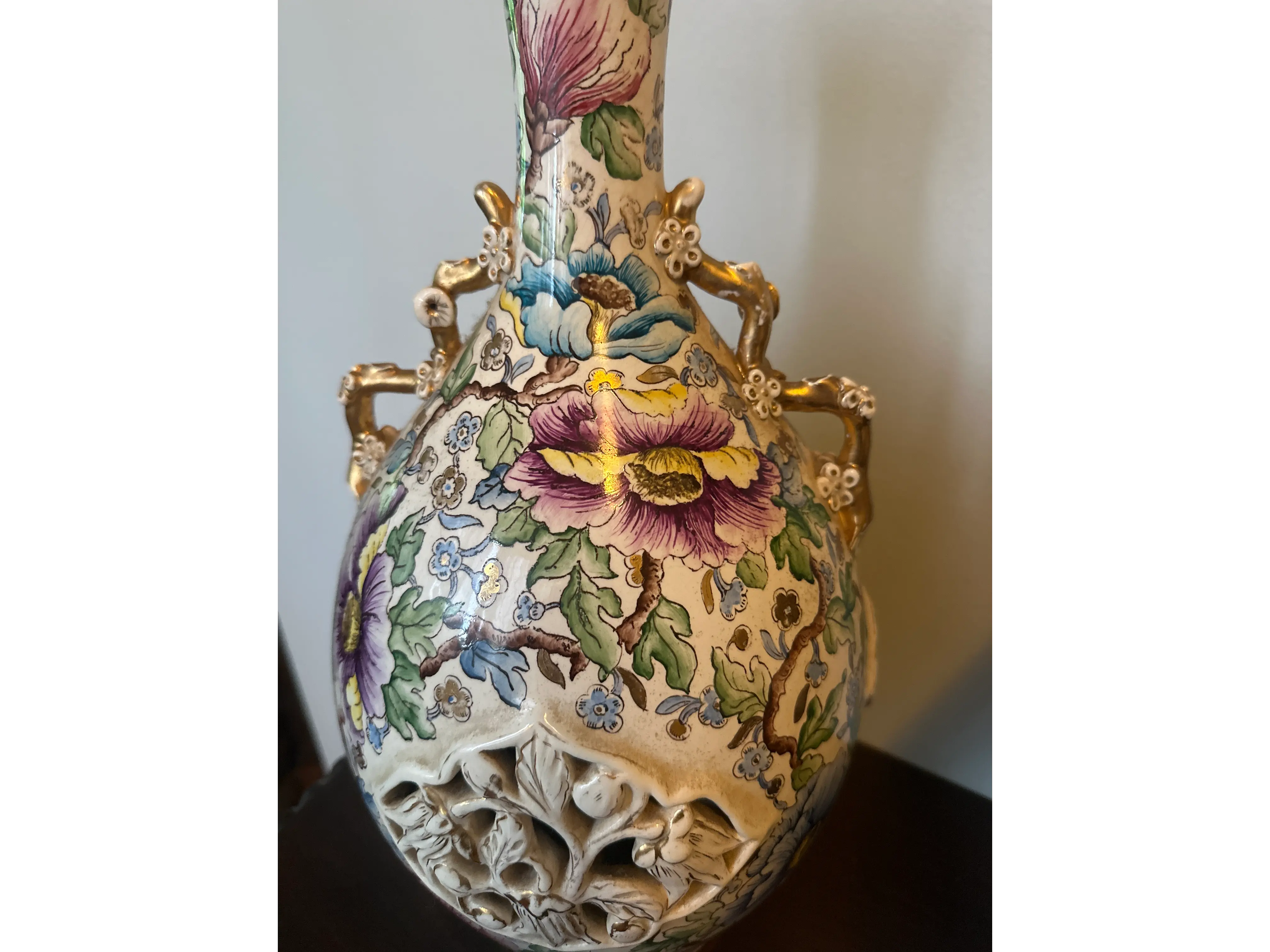 A peça apresenta rica decoração floral policromada, executada à mão em tons vivos de rosa, azul, verde e amarelo, com delicados realces em douração. Destaca-se o trabalho vazado no corpo, em relevo, com motivos florais entrelaçados, recurso estético pouco comum que confere maior sofisticação à peça.