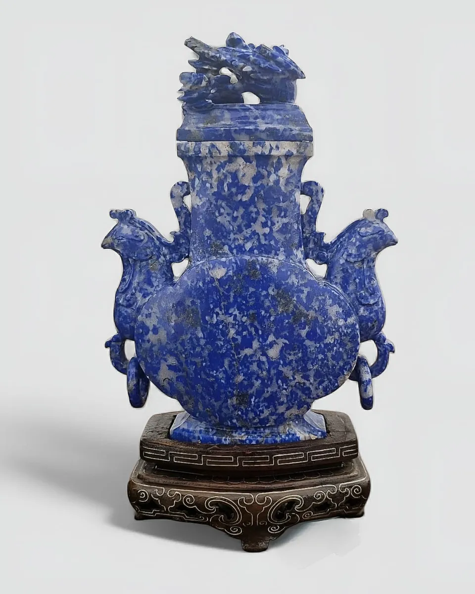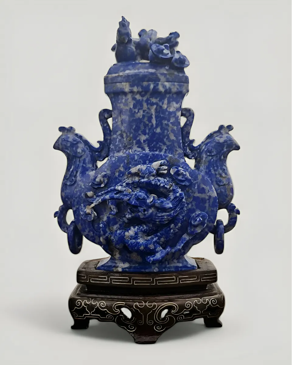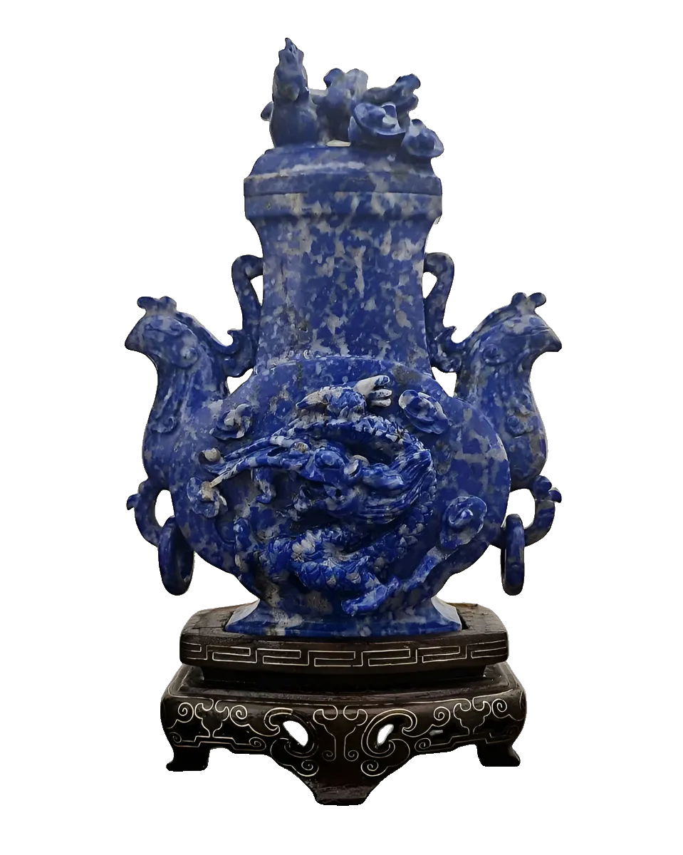 Lindo vaso balustre em lápis-lazúli com dragão esculpido ao centro, alças em forma de pássaros com argolas soltas e tampa esculpida.