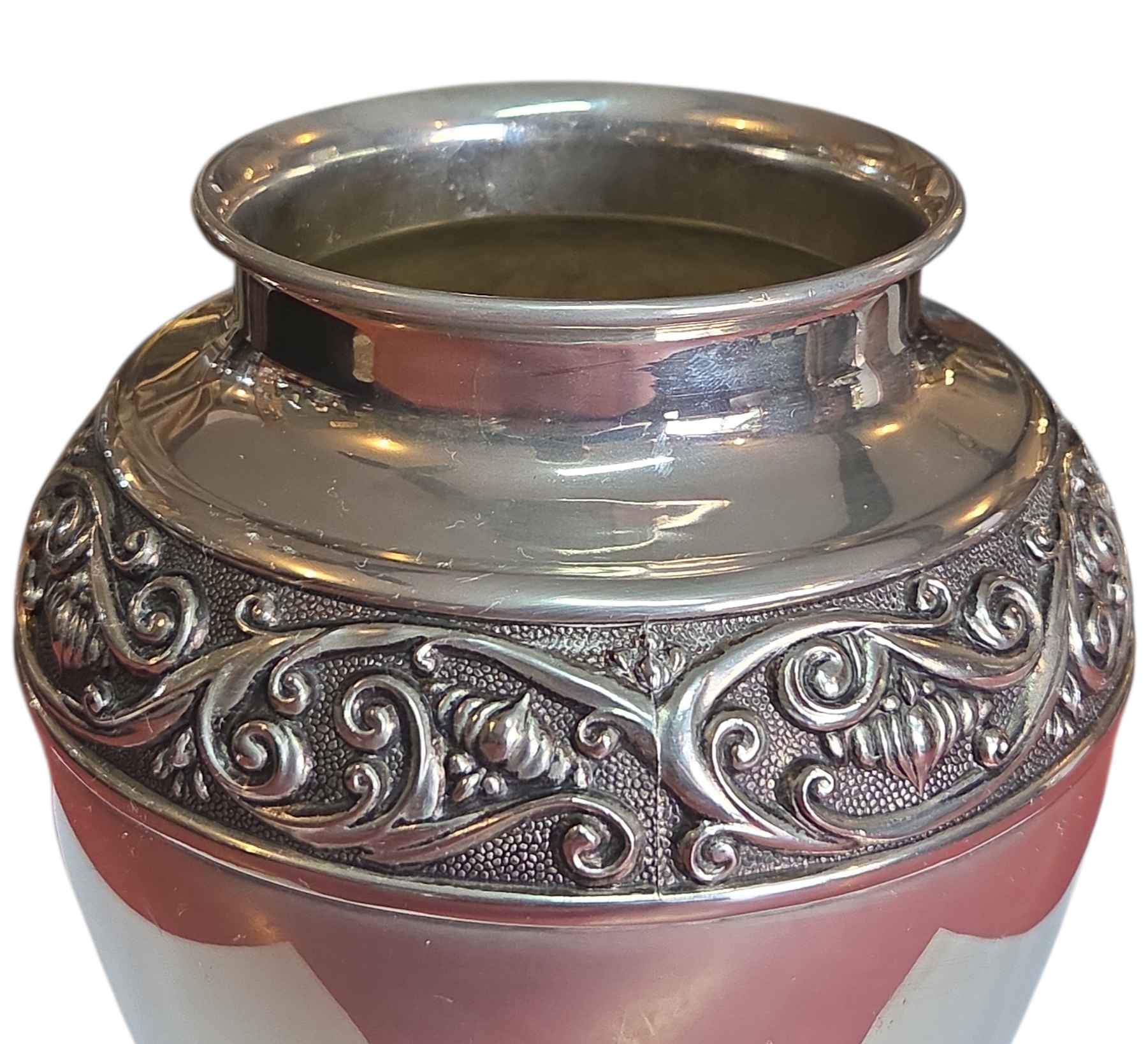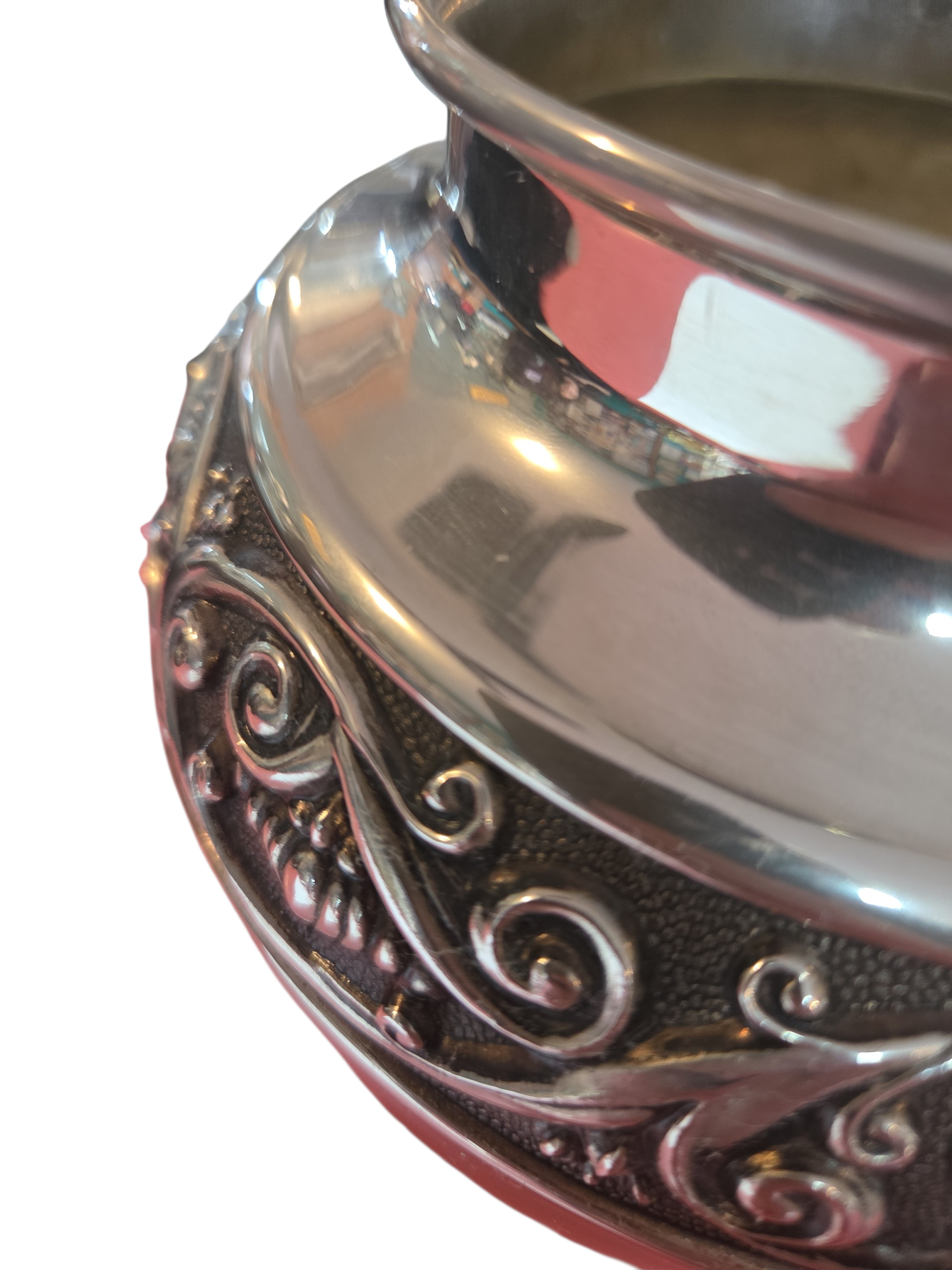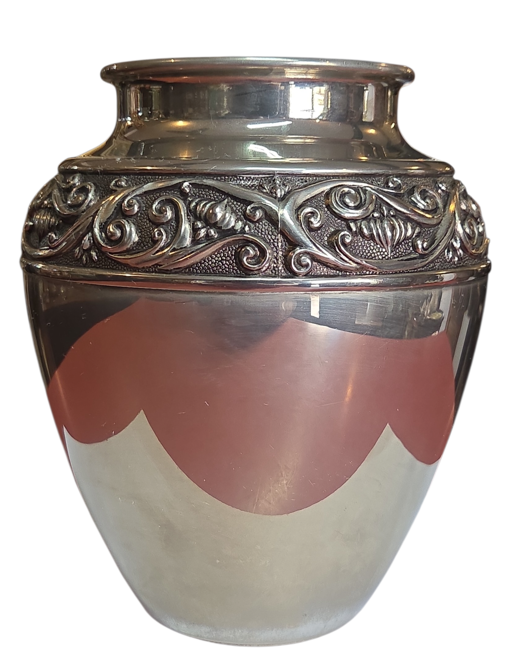 Esta peça é um exemplar magnífico de prataria decorativa, apresentando um banho de Prata 90 de alta qualidade que confere um brilho profundo e uma presença nobre ao objeto. O vaso é uma celebração do contraste, onde o rigor da metalurgia encontra a fluidez do design gráfico.