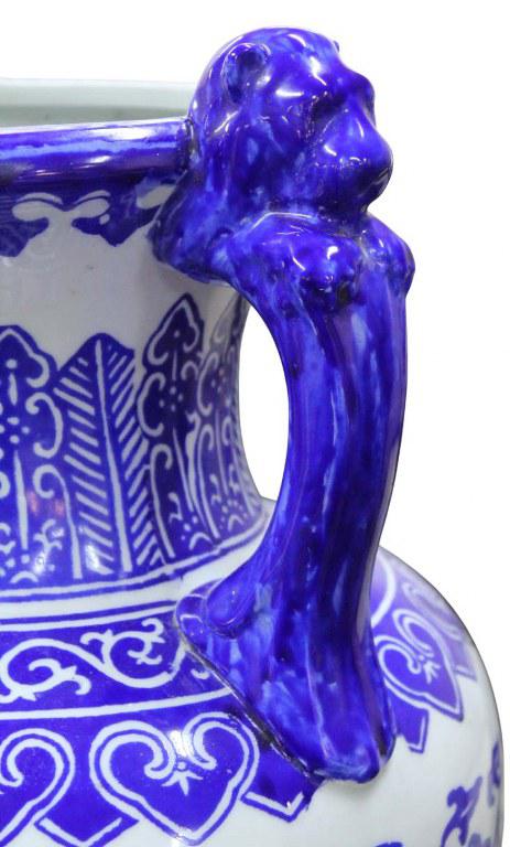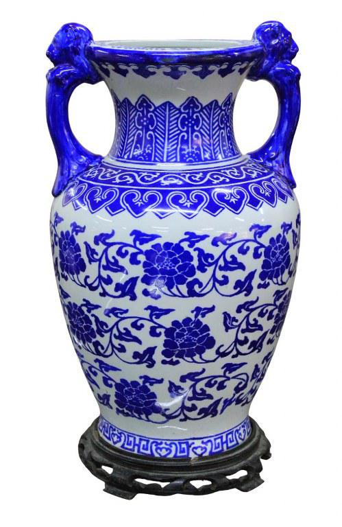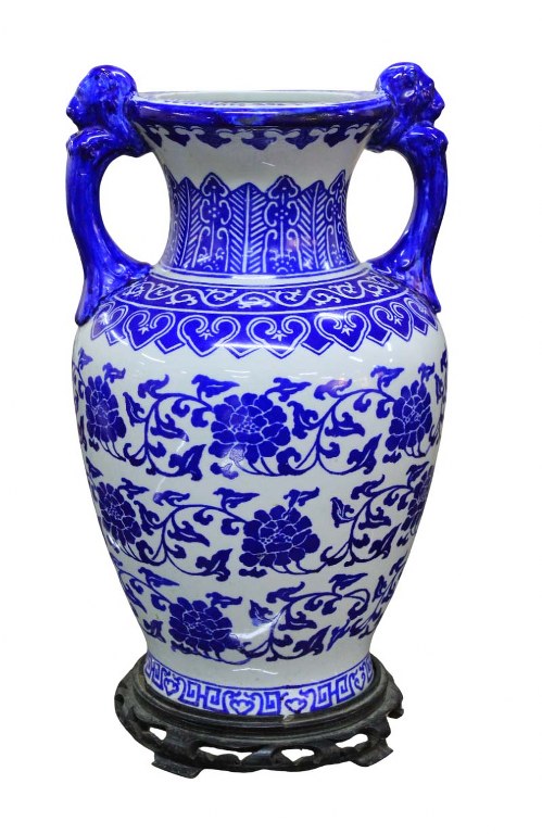 Antigo e exuberante vaso bojudo chinês, em porcelana branca com farta pintura manual na tonalidade azul, apresenta pegas laterais na figura de leão ou cão de Fó. Apresenta imponente base chinesa em madeira nobre, no estado.