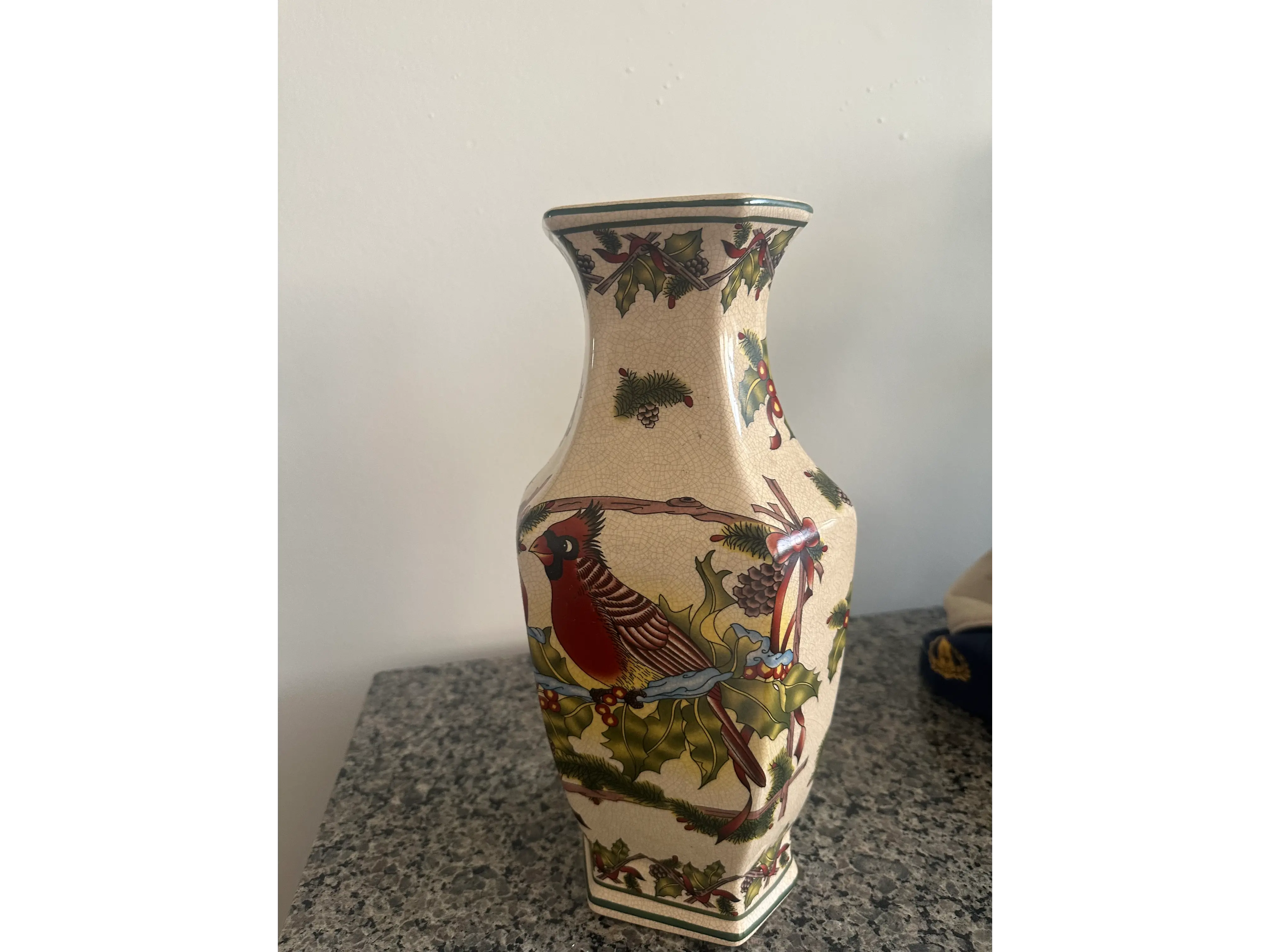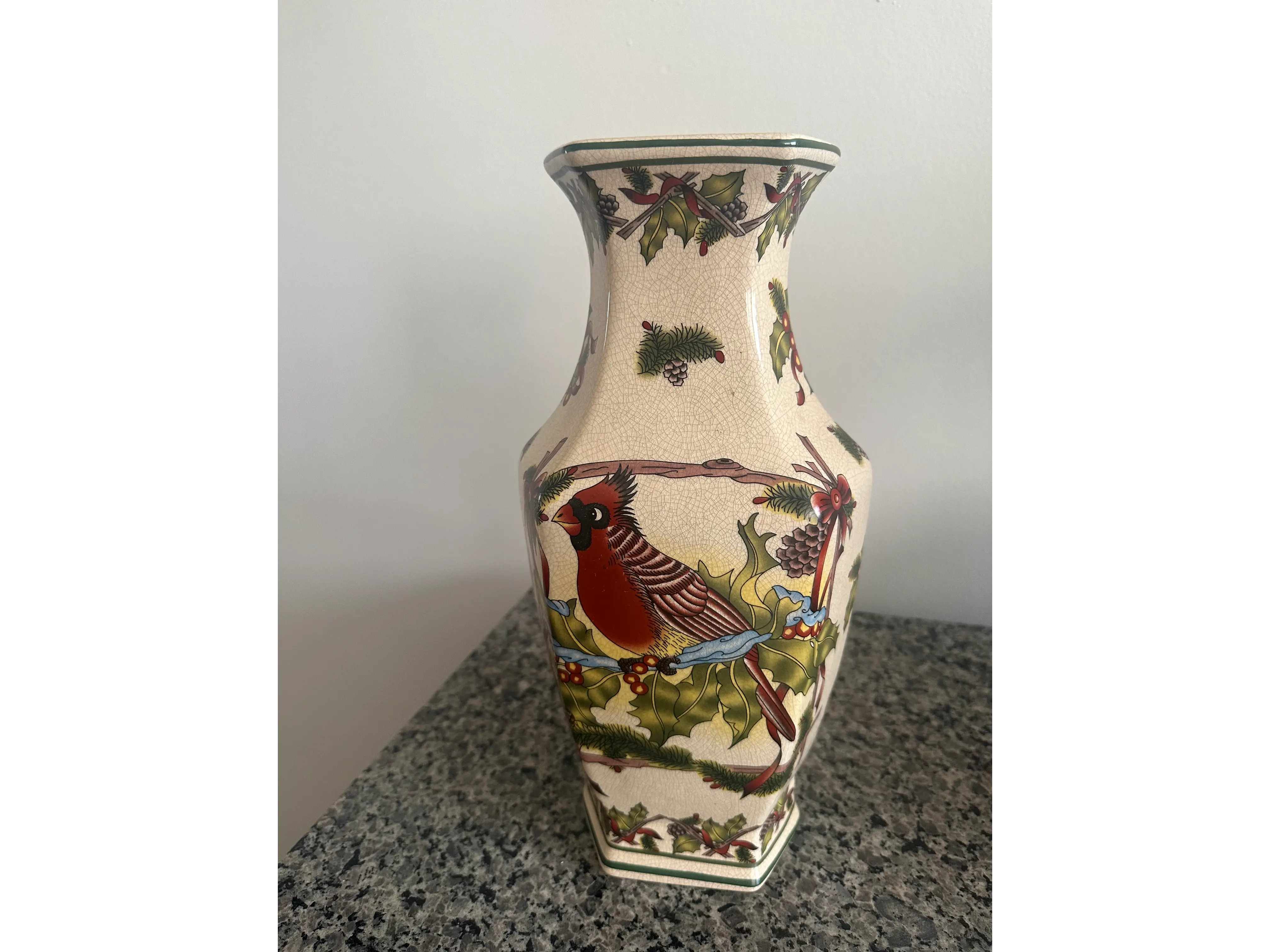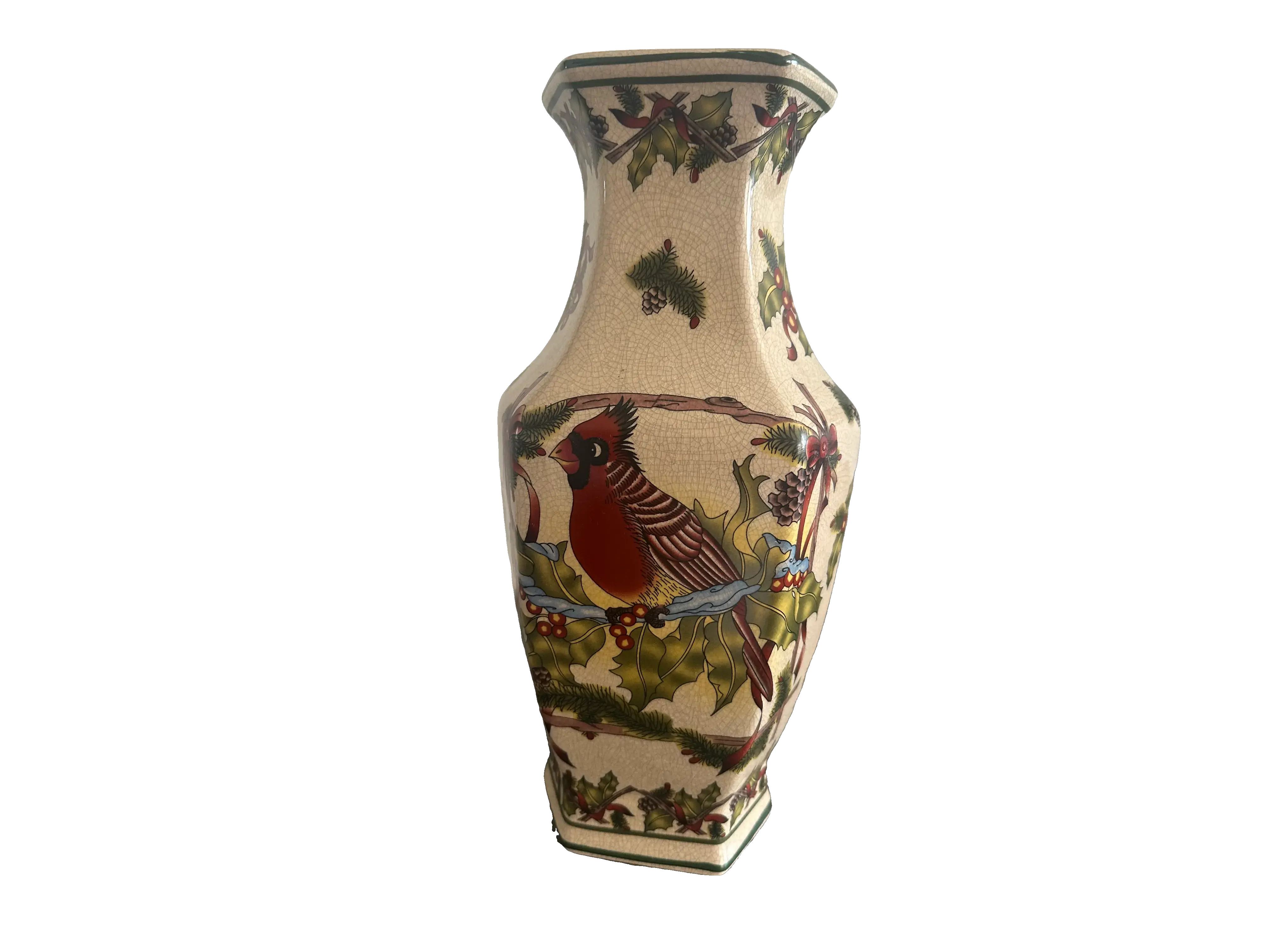 Vaso em cerâmica esmaltada, decorado com cardeais e ramos de azevinho, além de pinhas e laços. Peça de estilo clássico, com acabamento craquelado (efeito proposital no esmalte) que dá charme e aspecto vintage.