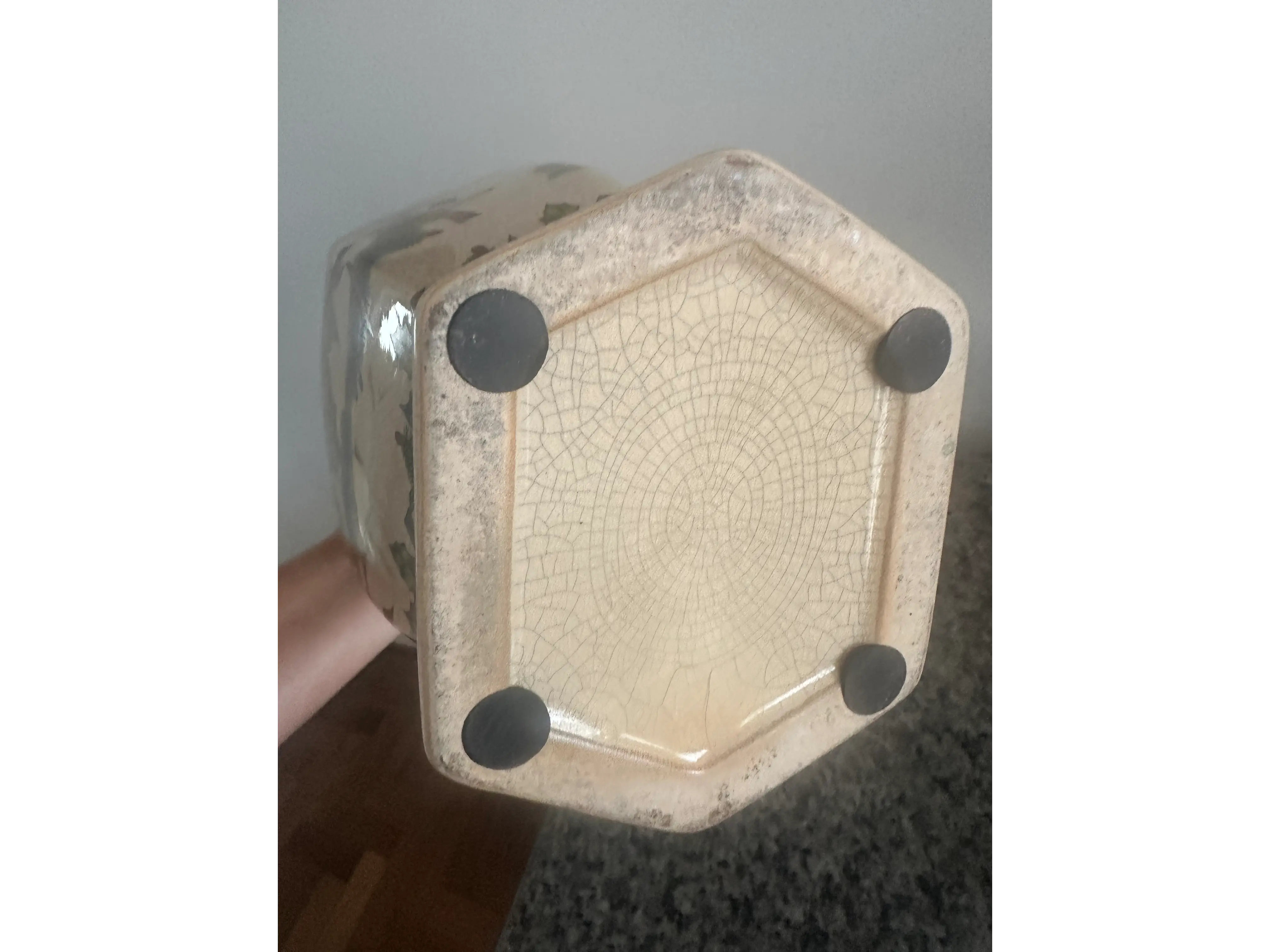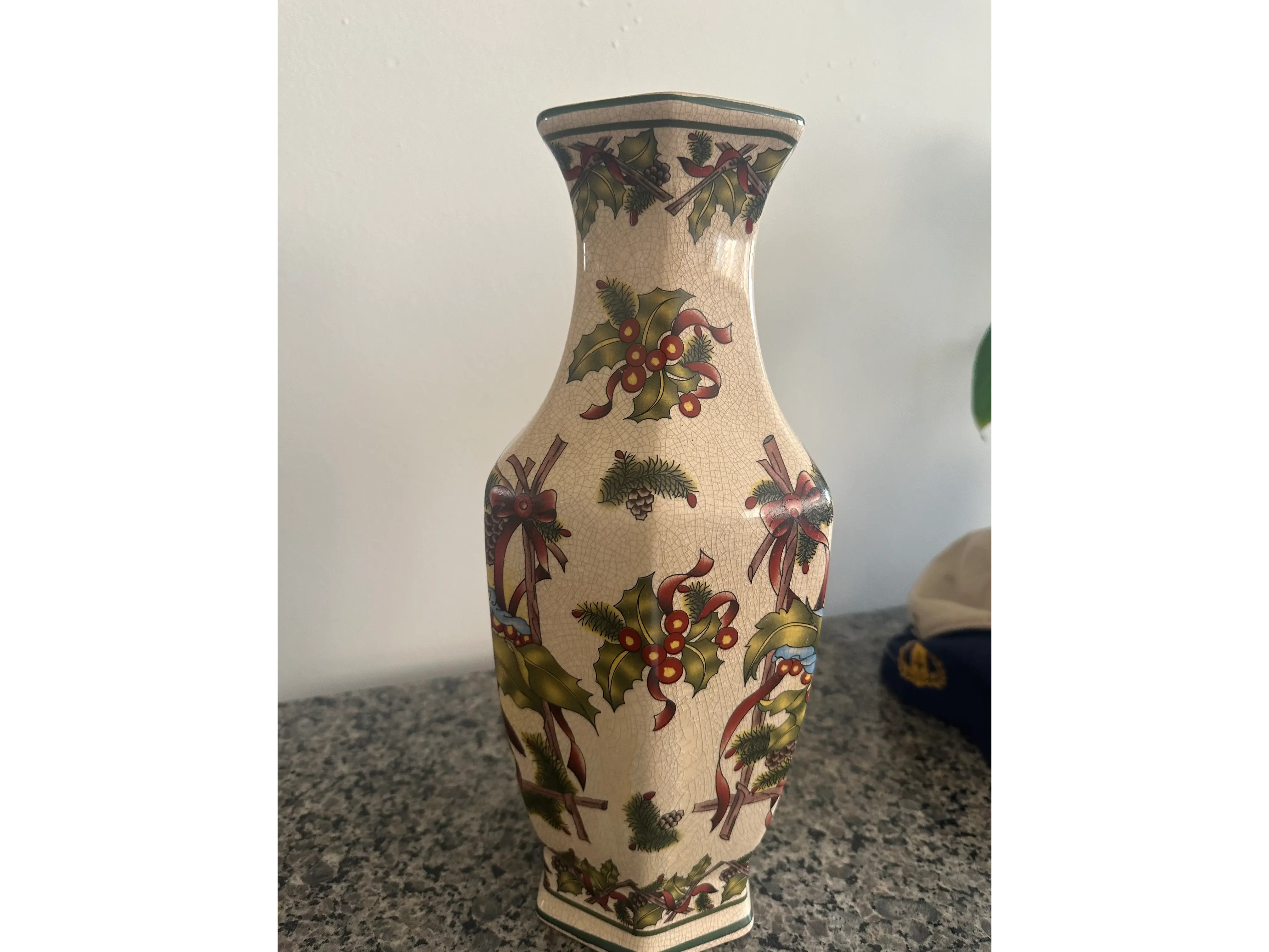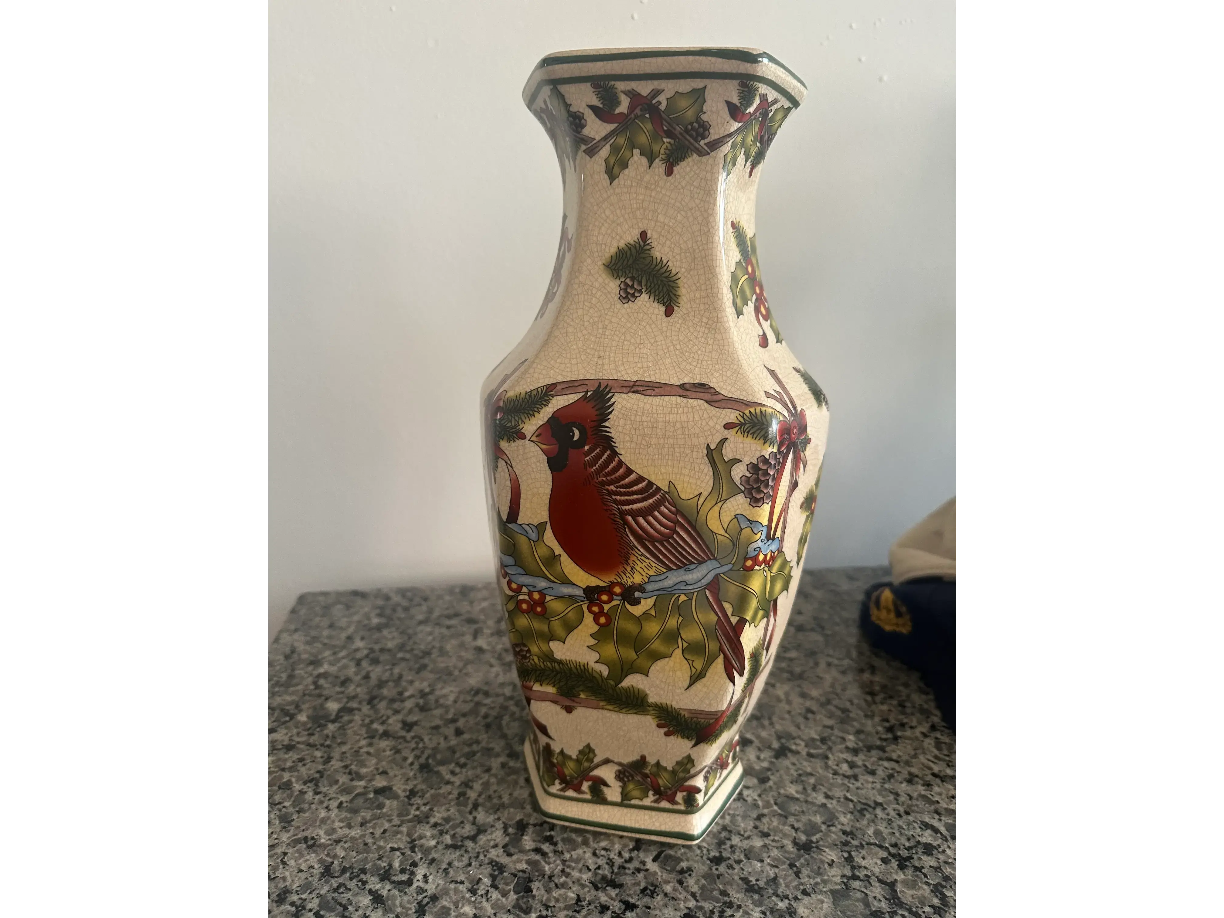 Vaso em cerâmica esmaltada, decorado com cardeais e ramos de azevinho, além de pinhas e laços. Peça de estilo clássico, com acabamento craquelado (efeito proposital no esmalte) que dá charme e aspecto vintage.
