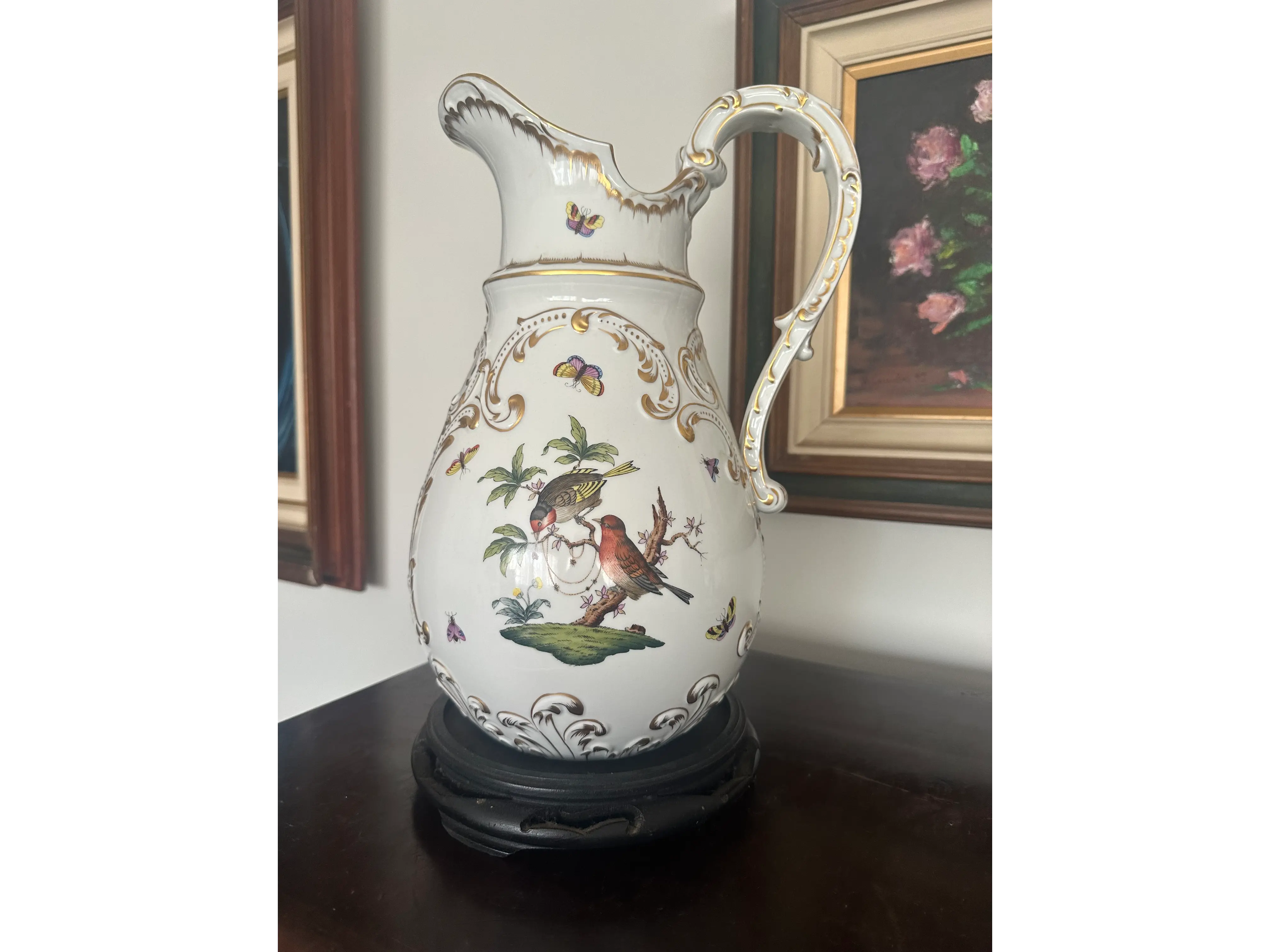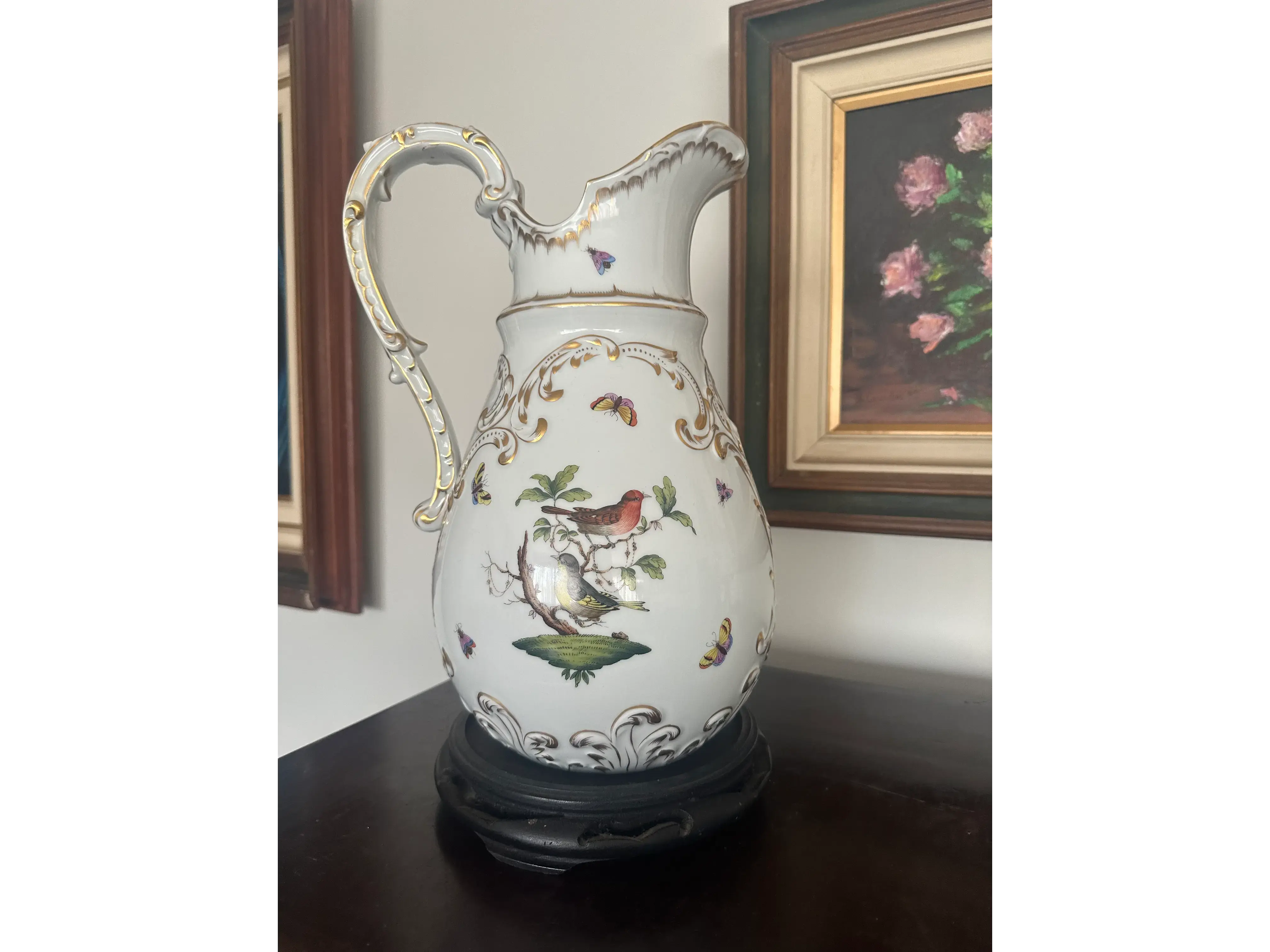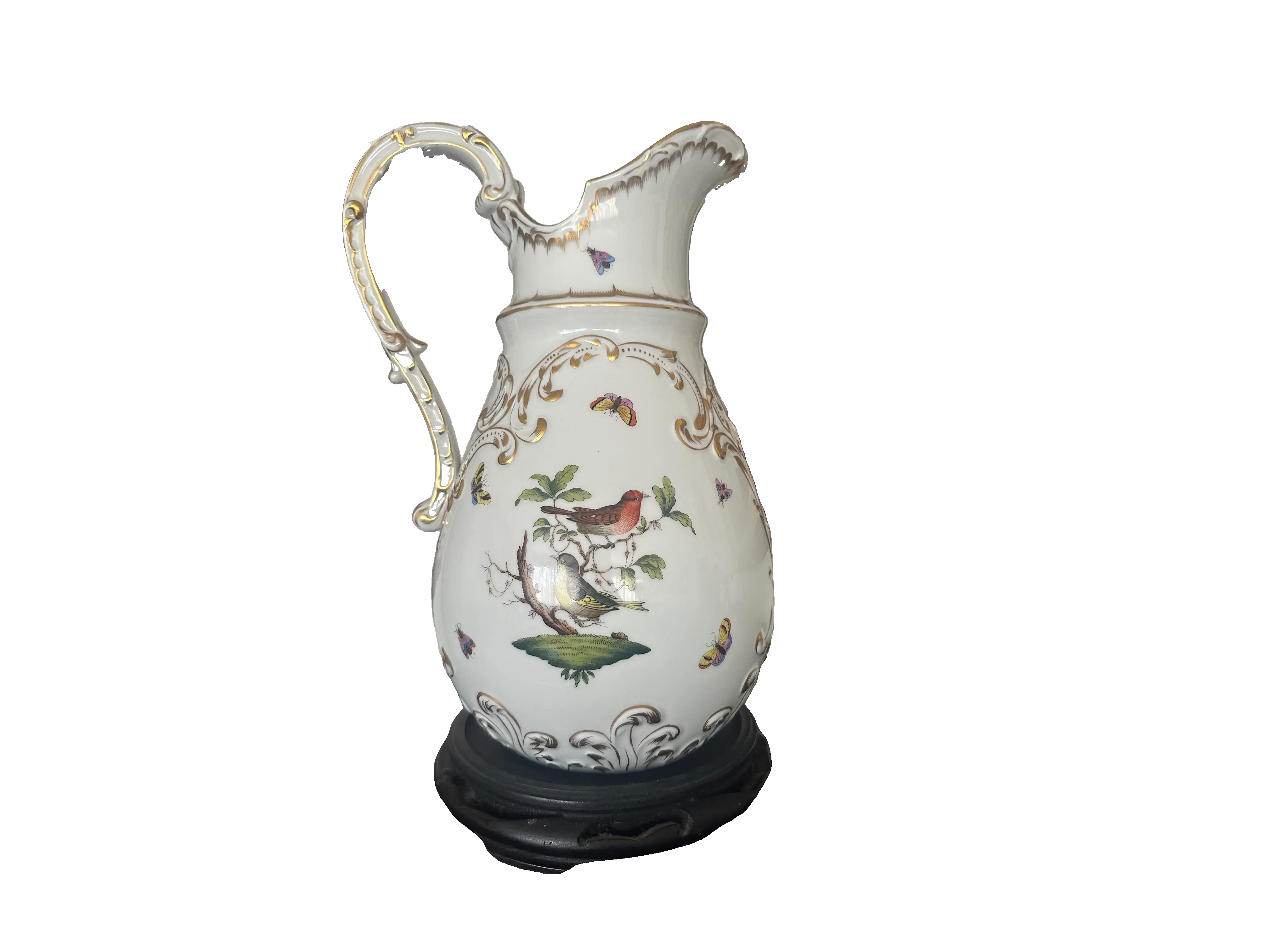 Jarra de Porcelana Alemã Sitzendorf – Antiga, Decorada com Pássaros, Borboletas e Detalhes em Ouro