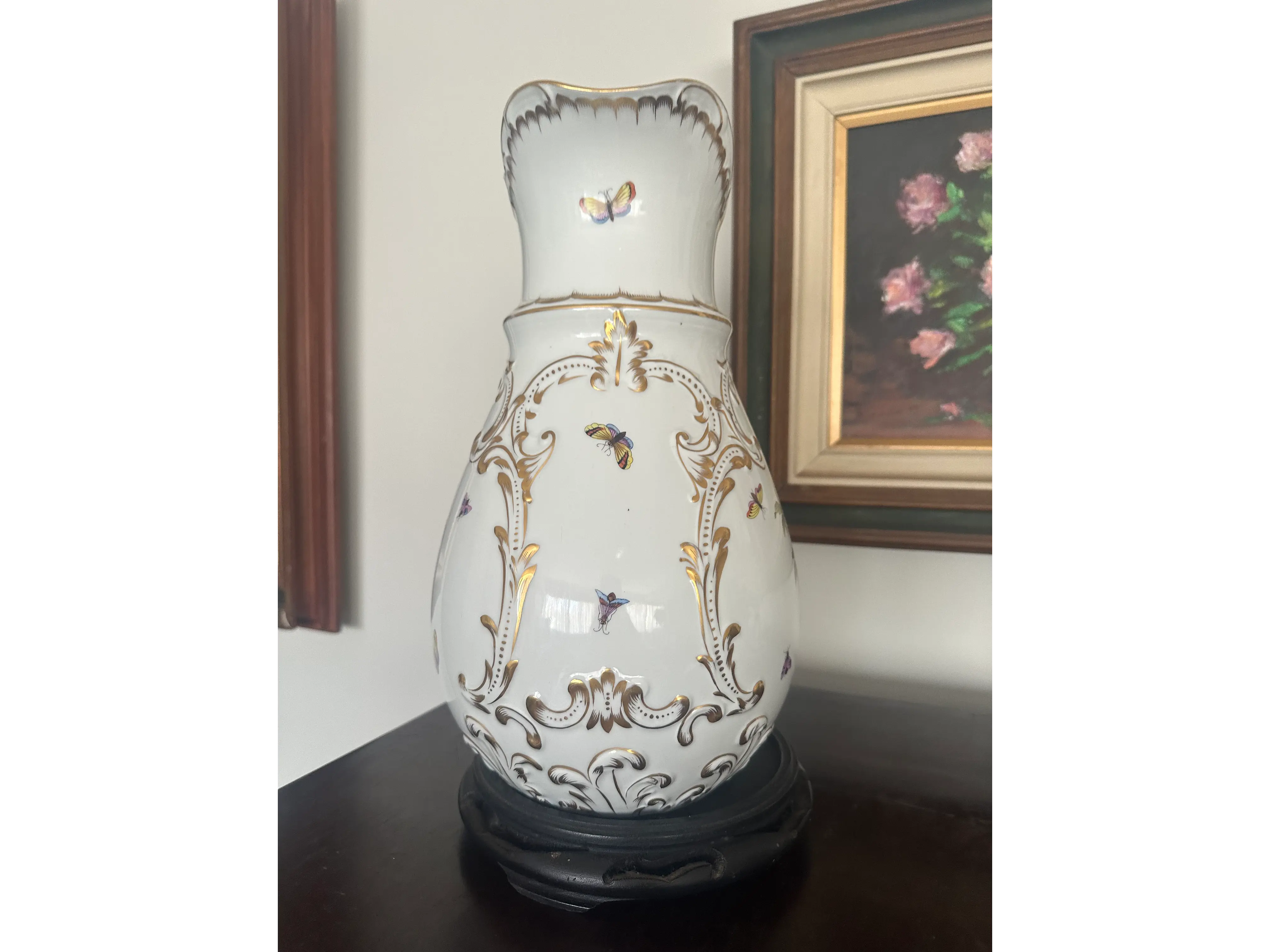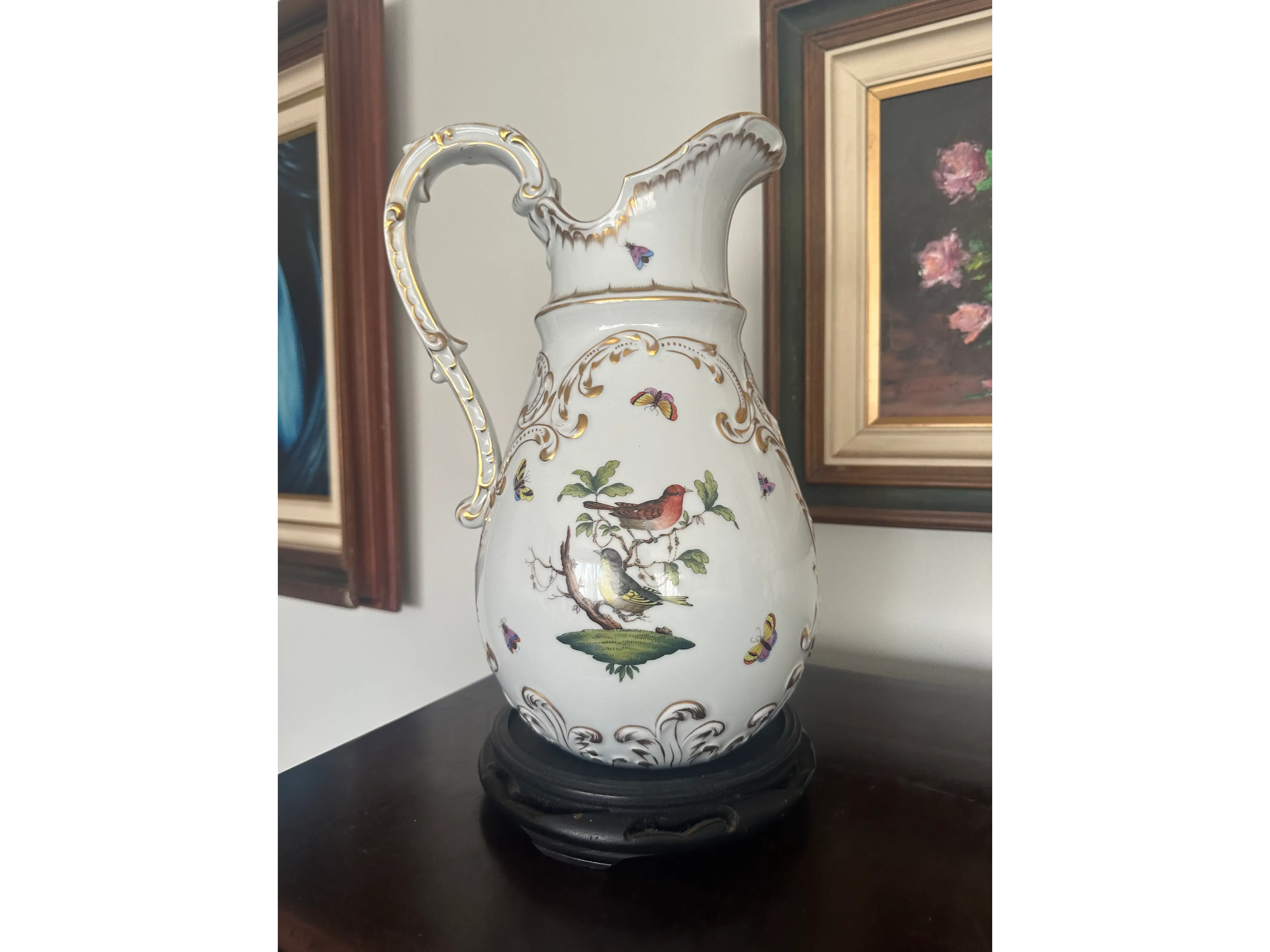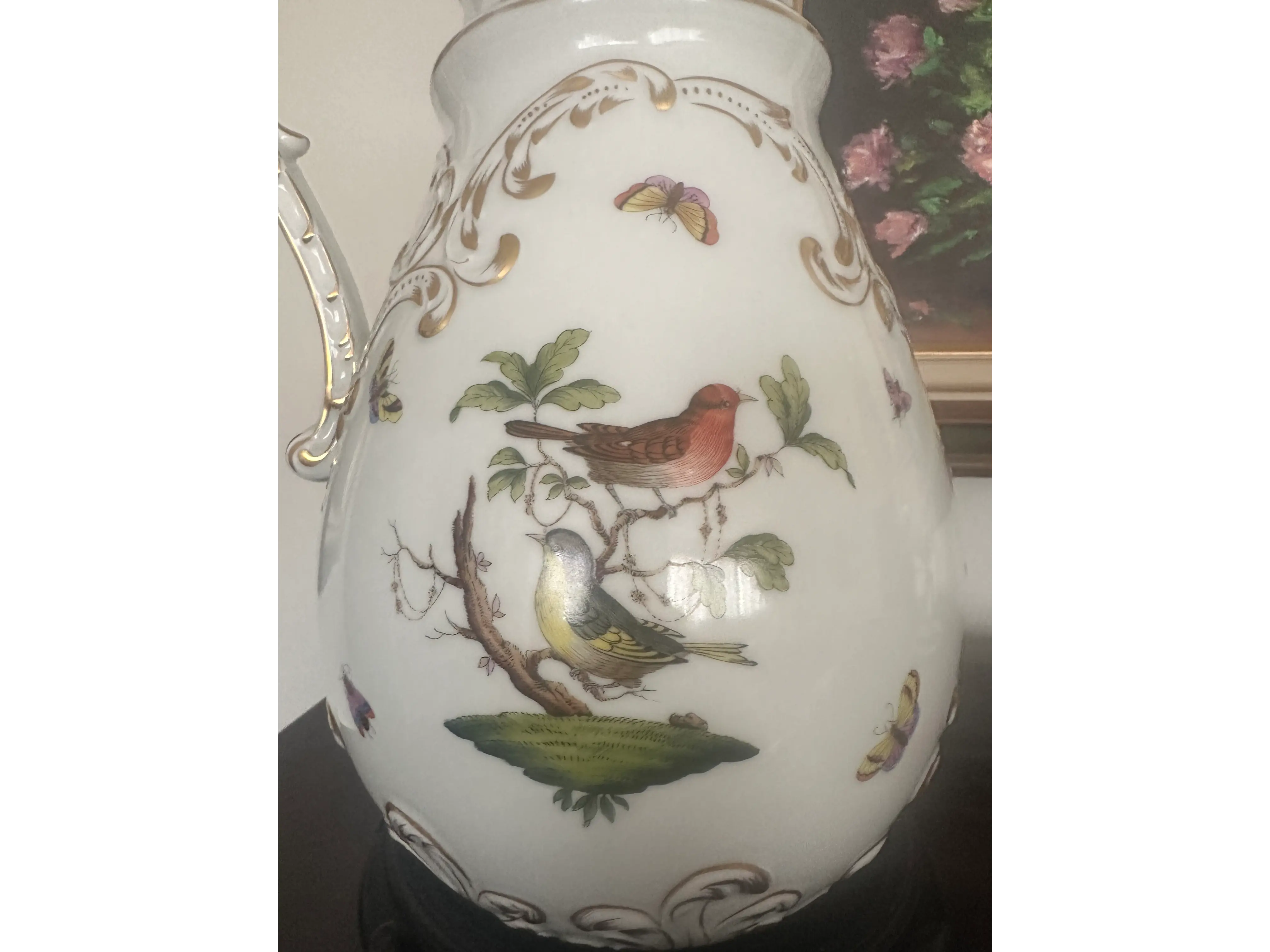 Jarra de Porcelana Alemã Sitzendorf – Antiga, Decorada com Pássaros, Borboletas e Detalhes em Ouro