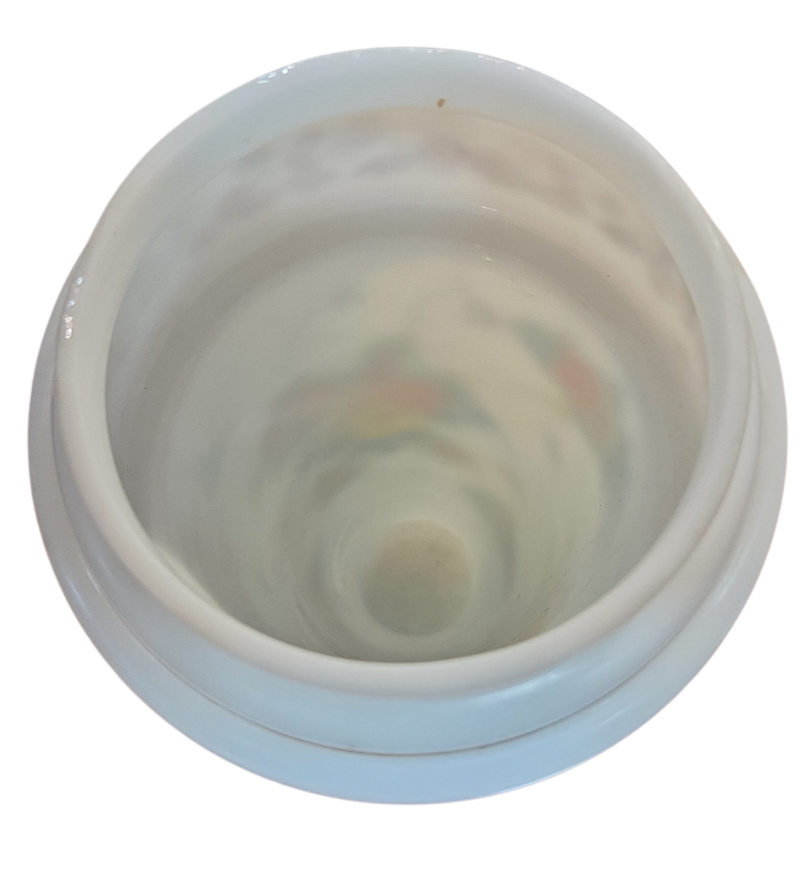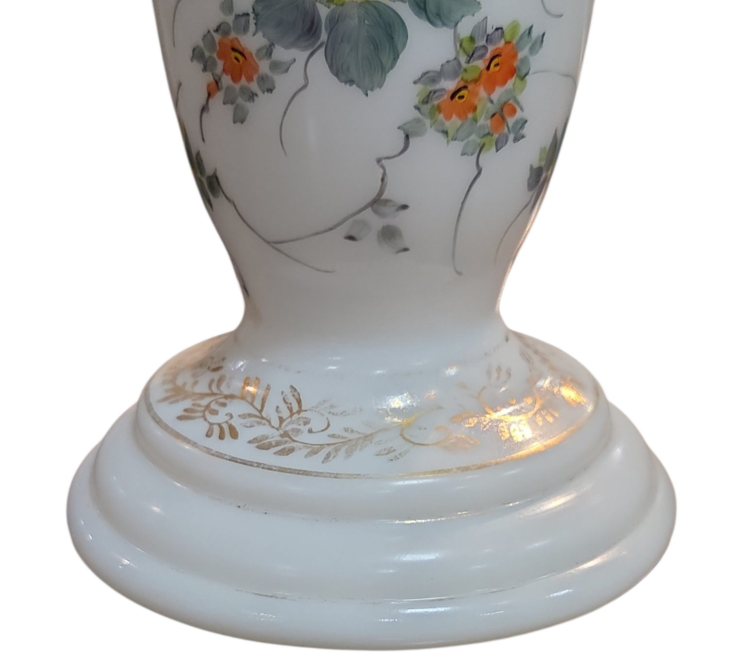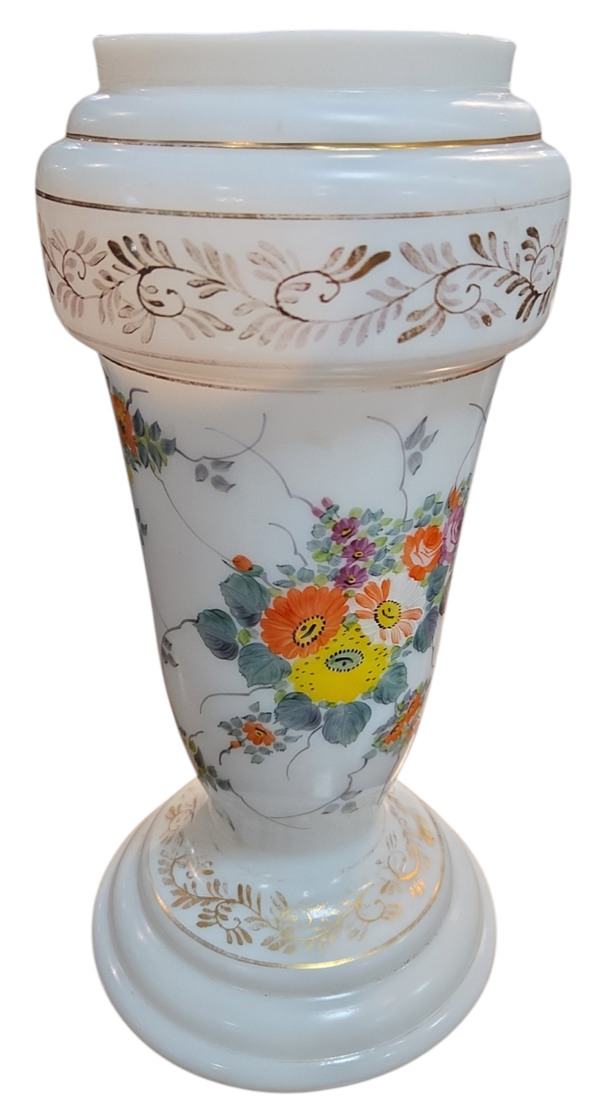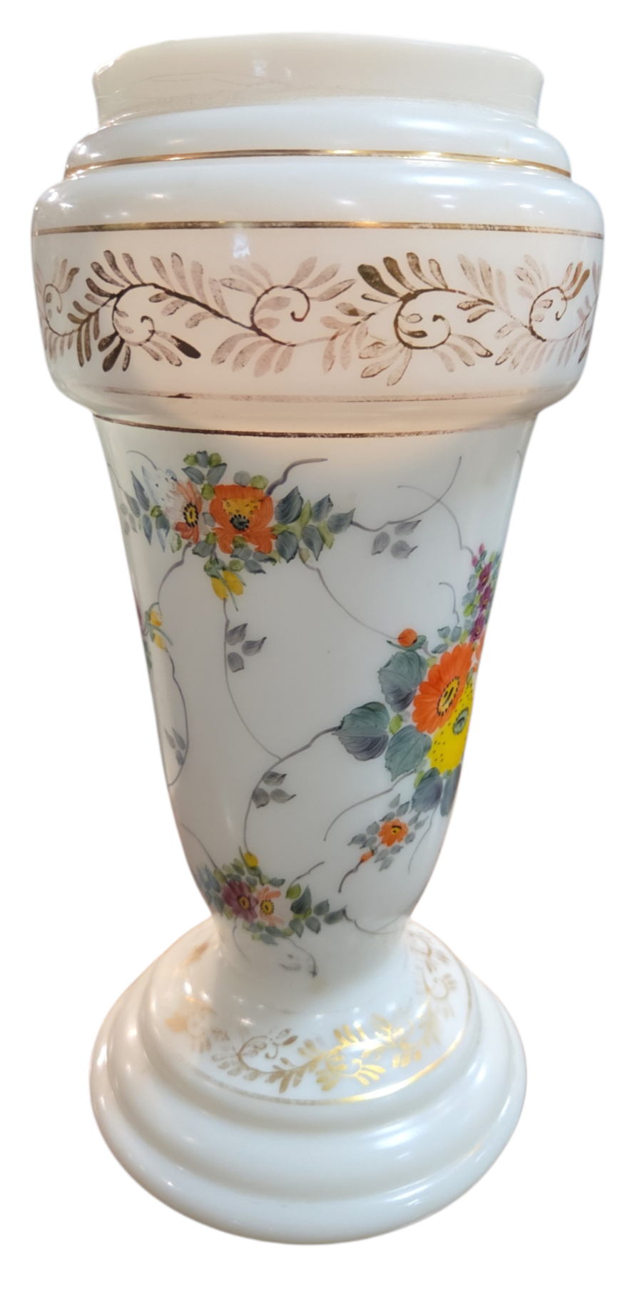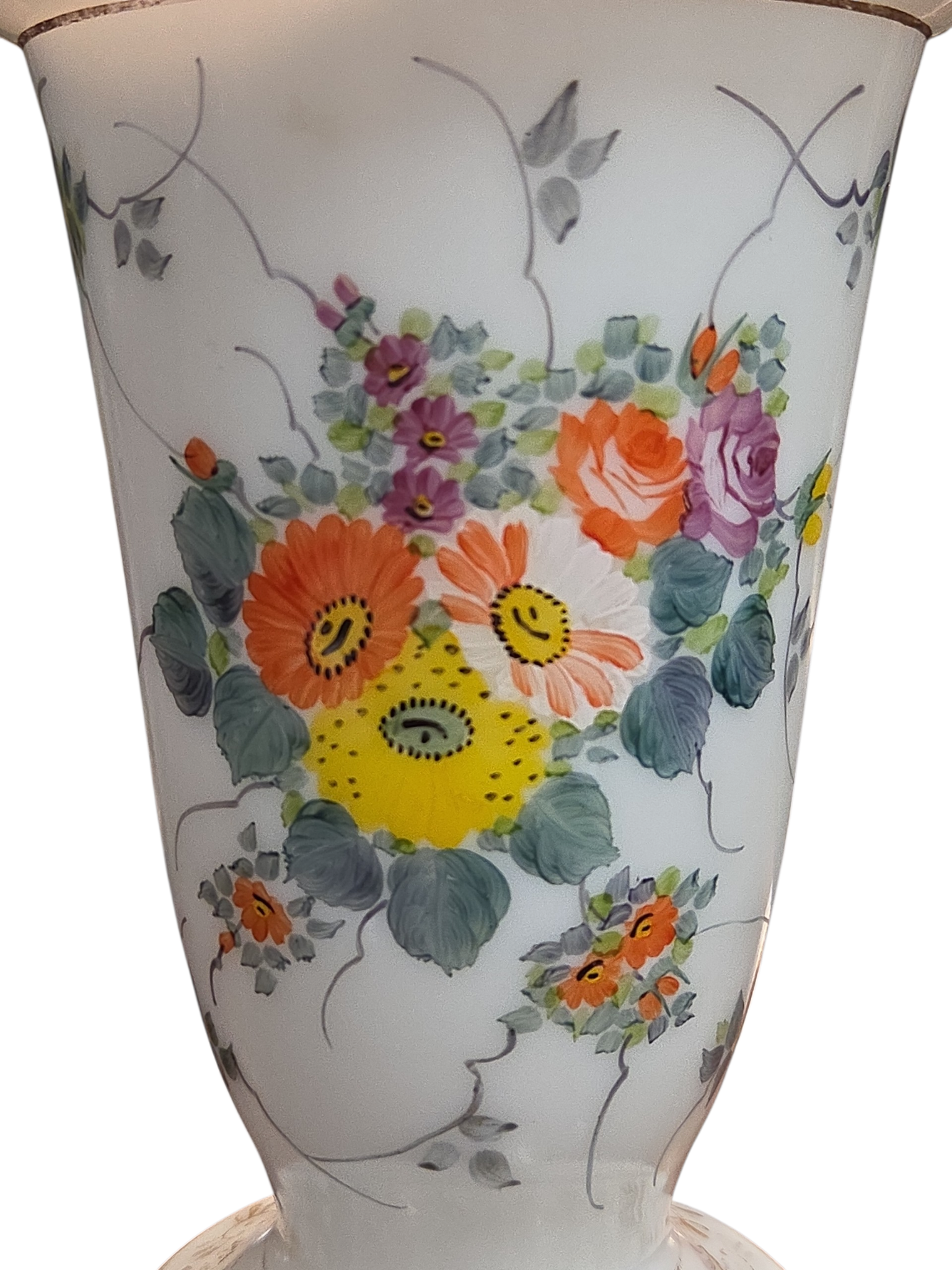 Apresentamos um delicado vaso decorativo em vidro leitoso branco, que combina a elegância da opalinagem com a vivacidade da pintura artesanal. Com um formato de taça estilizada e base circular robusta, esta peça é perfeita para colecionadores de vidraria vintage ou para compor decorações românticas e clássicas.
