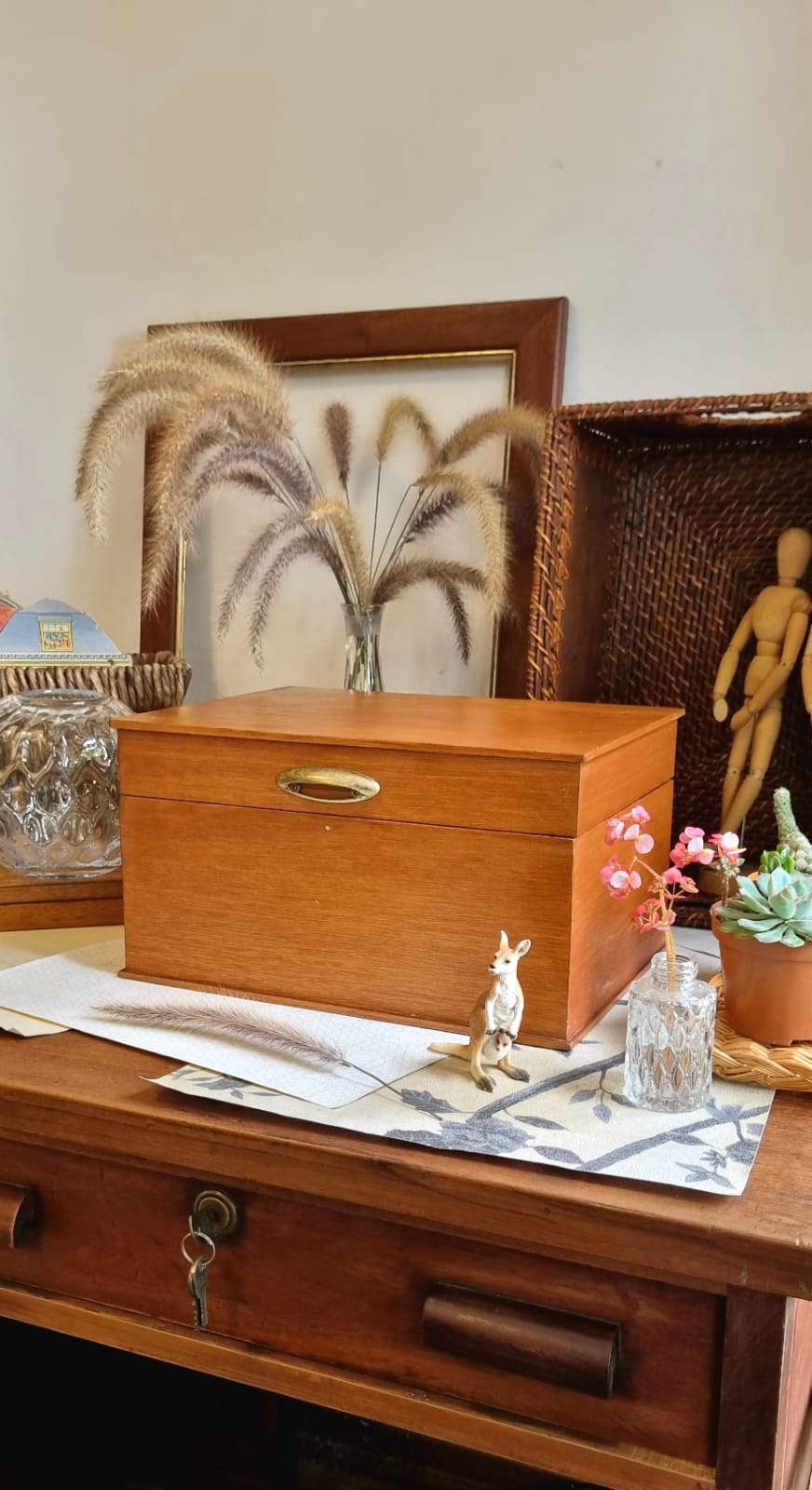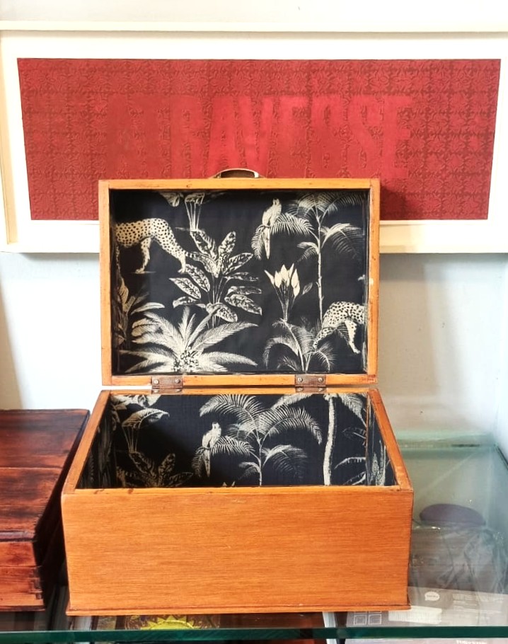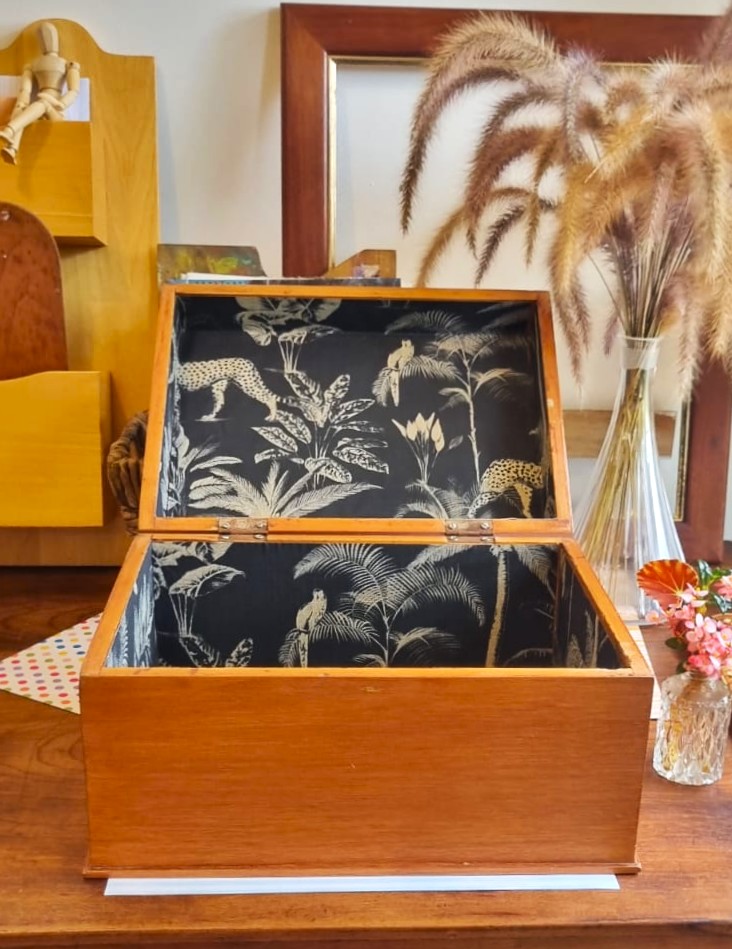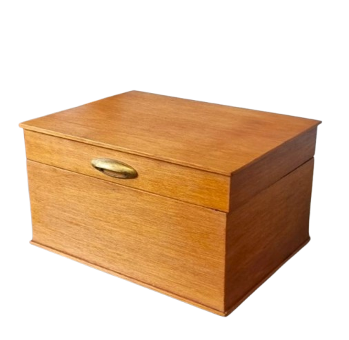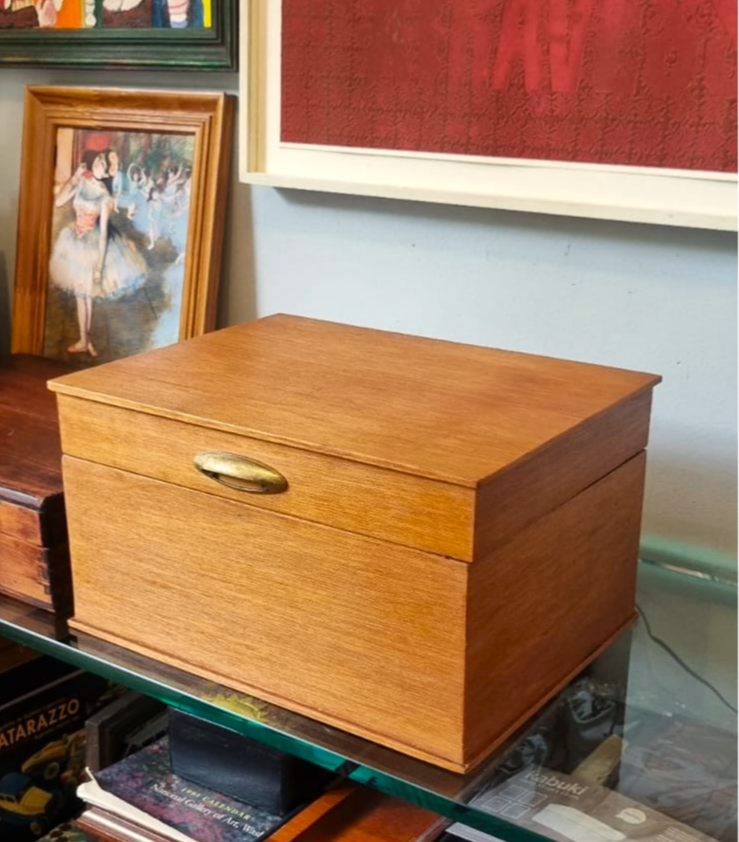 Grande caixa de madeira maciça, folheada com madeira clara, linhas retas.