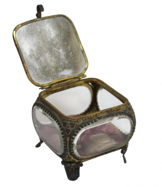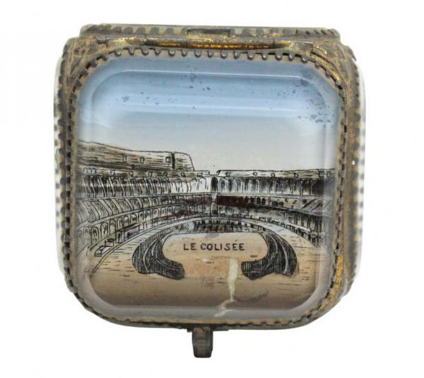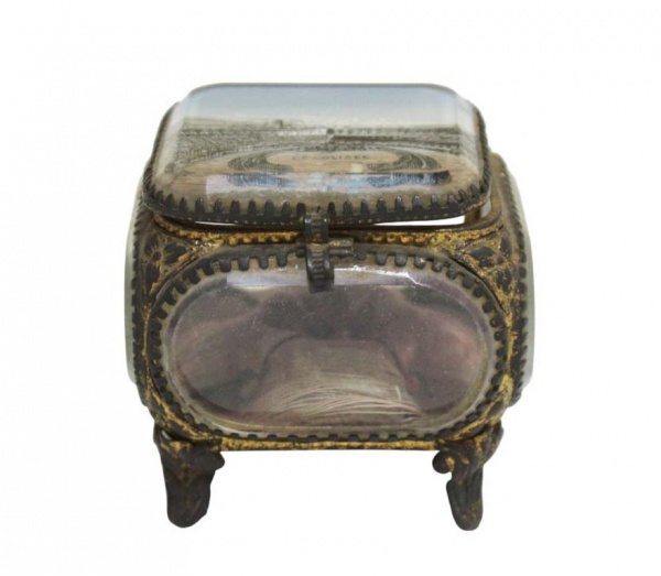 Antiga e colecionável caixa em cristal europeu facetado com figura LE COLISÉE . Parte interna com tecido de seda vinho ( desgastado do tempo original ) em capitone, acabamento em metal dourado, base em quatro pés e fecho frontal de encaixe , típico das peças artesanais antigas.