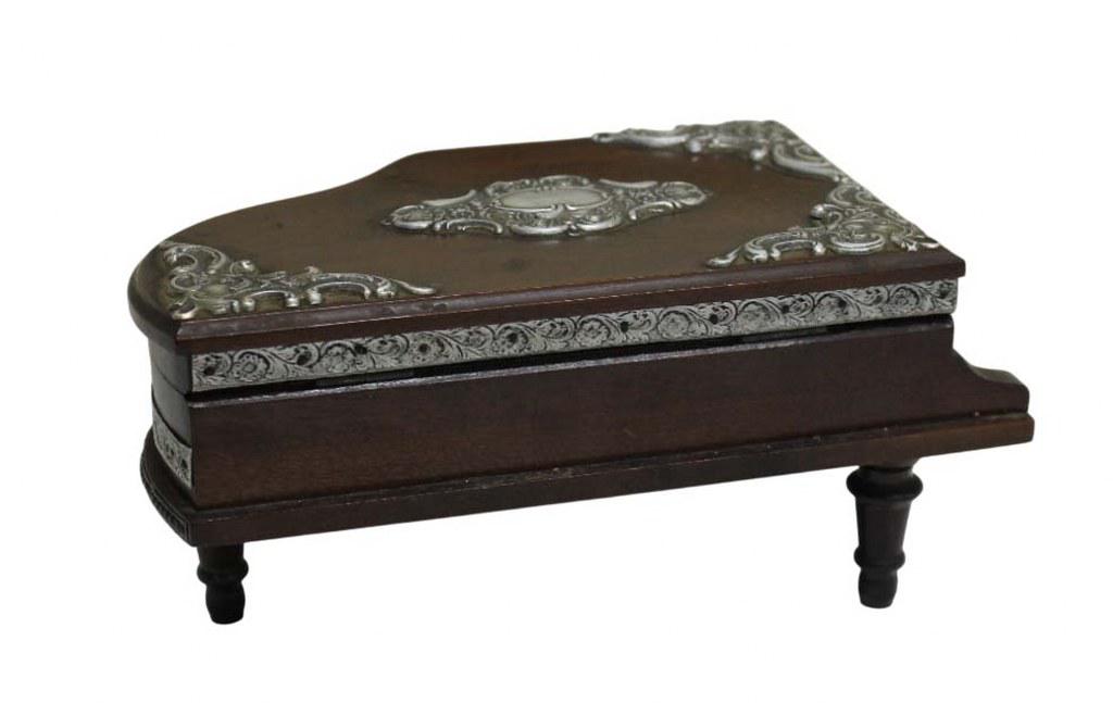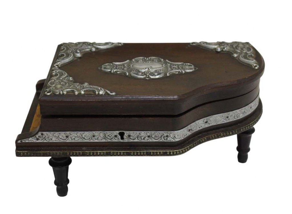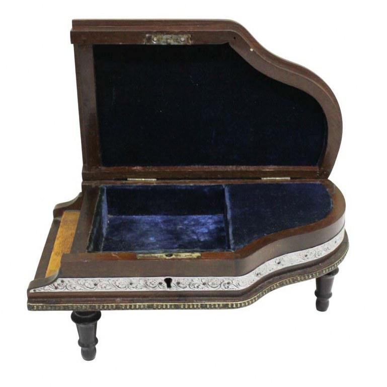Charmosa e antiga caixa porta joias musical em formato de piano com apliques em prata de lei. Assente em tripé torneado e parte interna revestida em veludo azul royal. Chaveada mas não possui a chave.