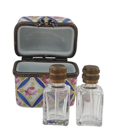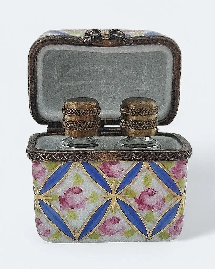 O design delicado e os detalhes intrincados refletem a tradição da porcelana Limoges, tornando-a uma adição sofisticada a qualquer ambiente. Os frascos que acompanham a caixa são perfeitos para guardar especiarias, joias ou outros itens preciosos, oferecendo versatilidade e charme.