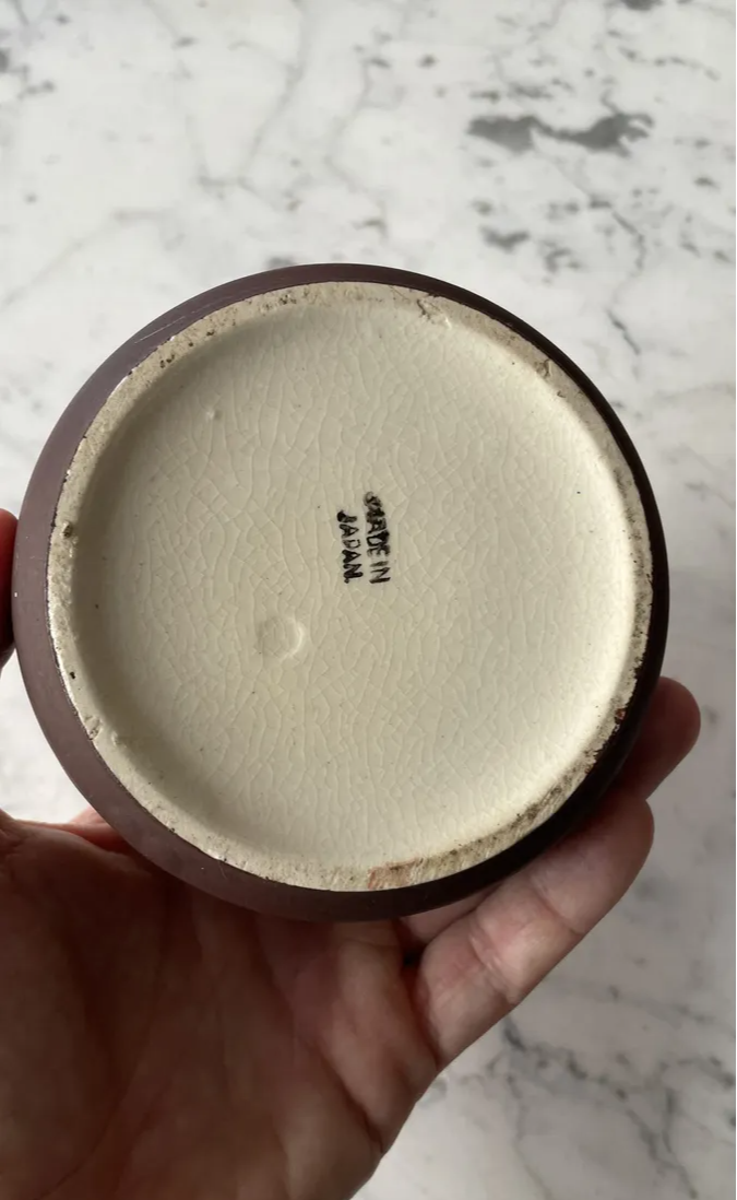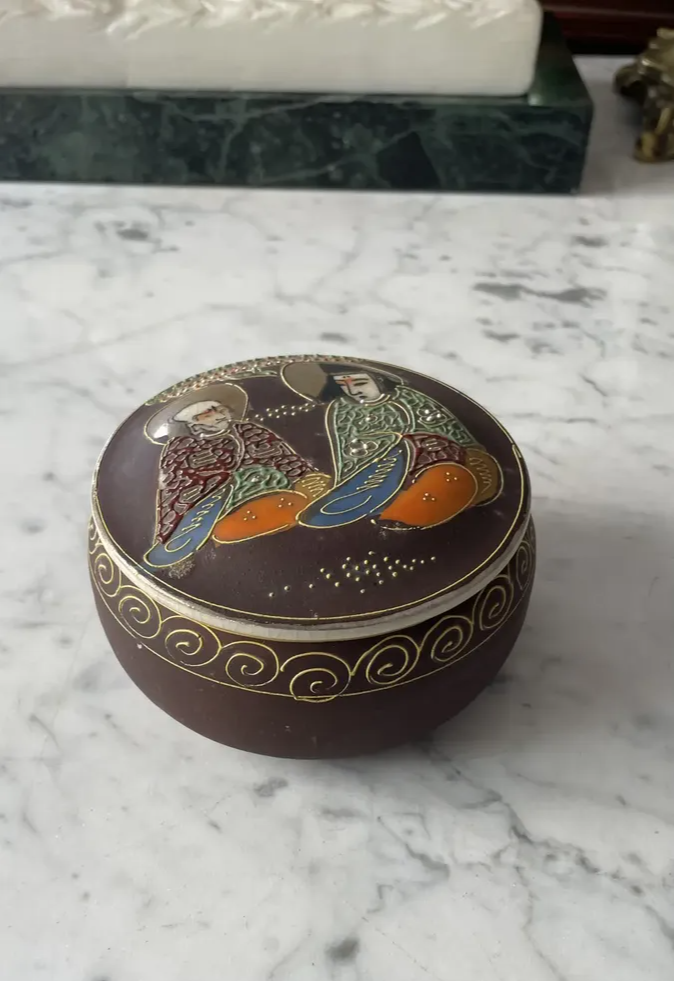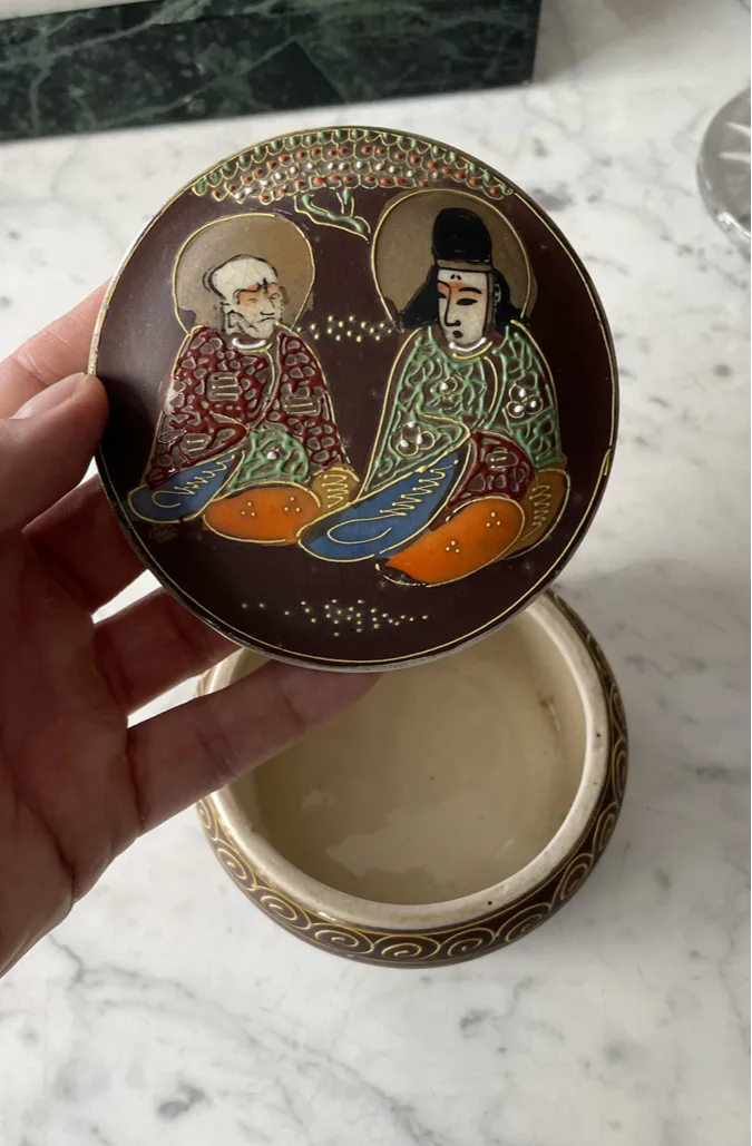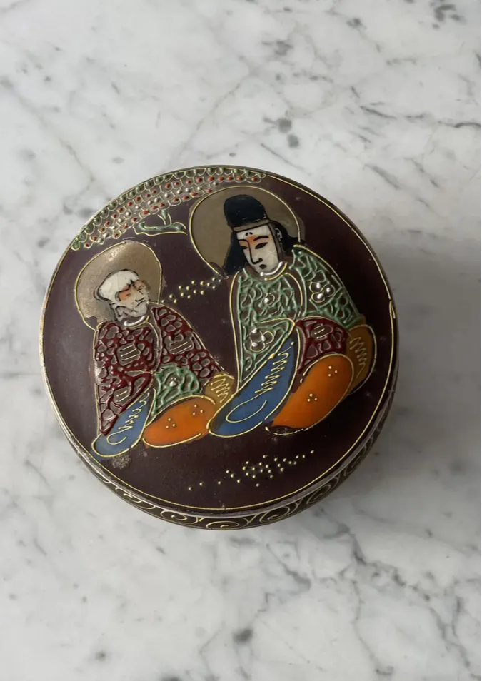 Antiga caixinha oriental em porcelana japonesa Satsuma. Decoração típica, ricamente pintada à mão.