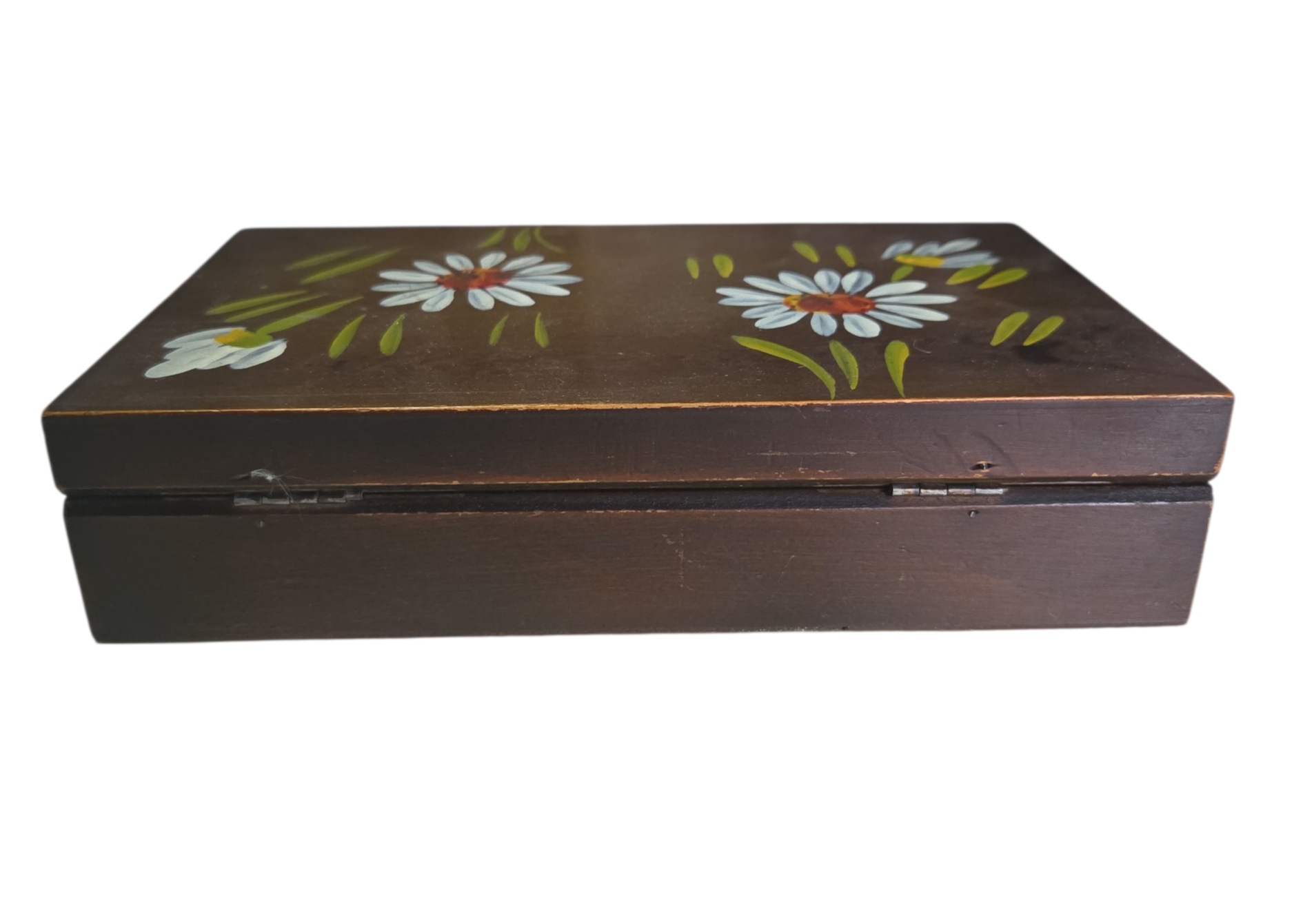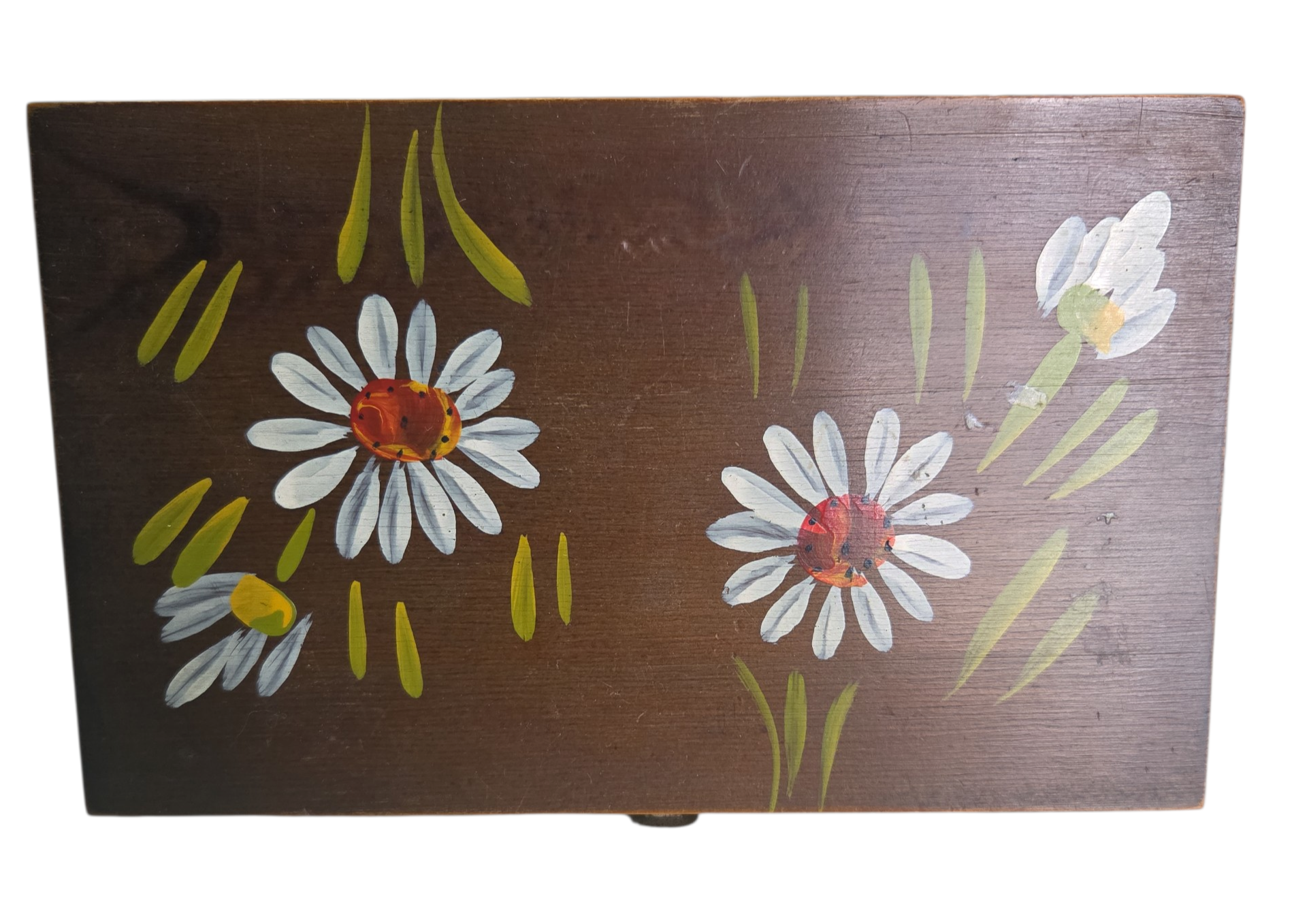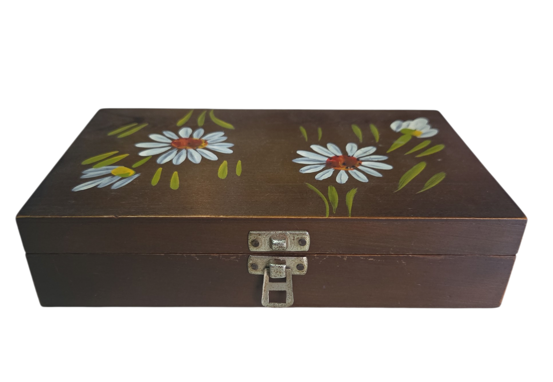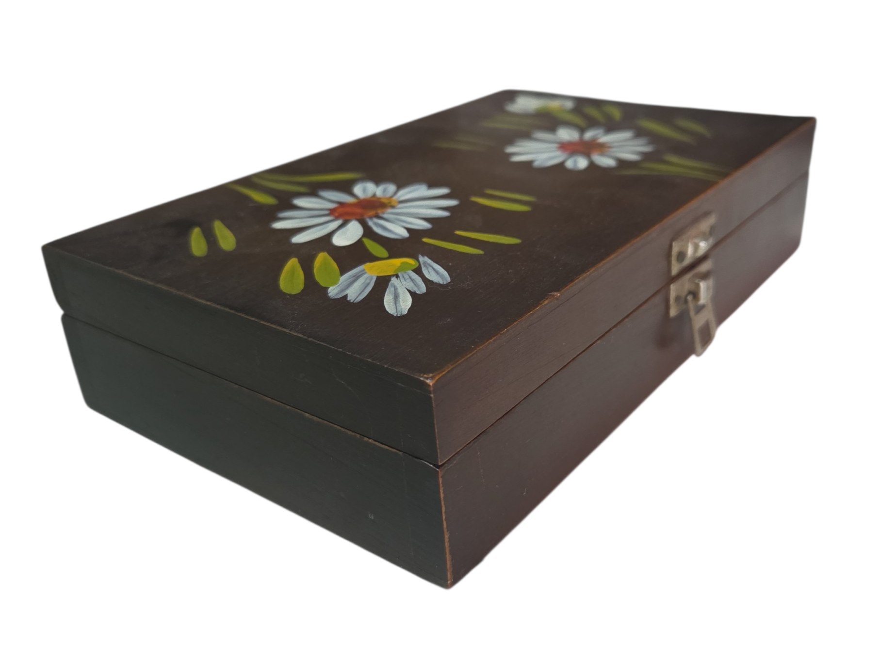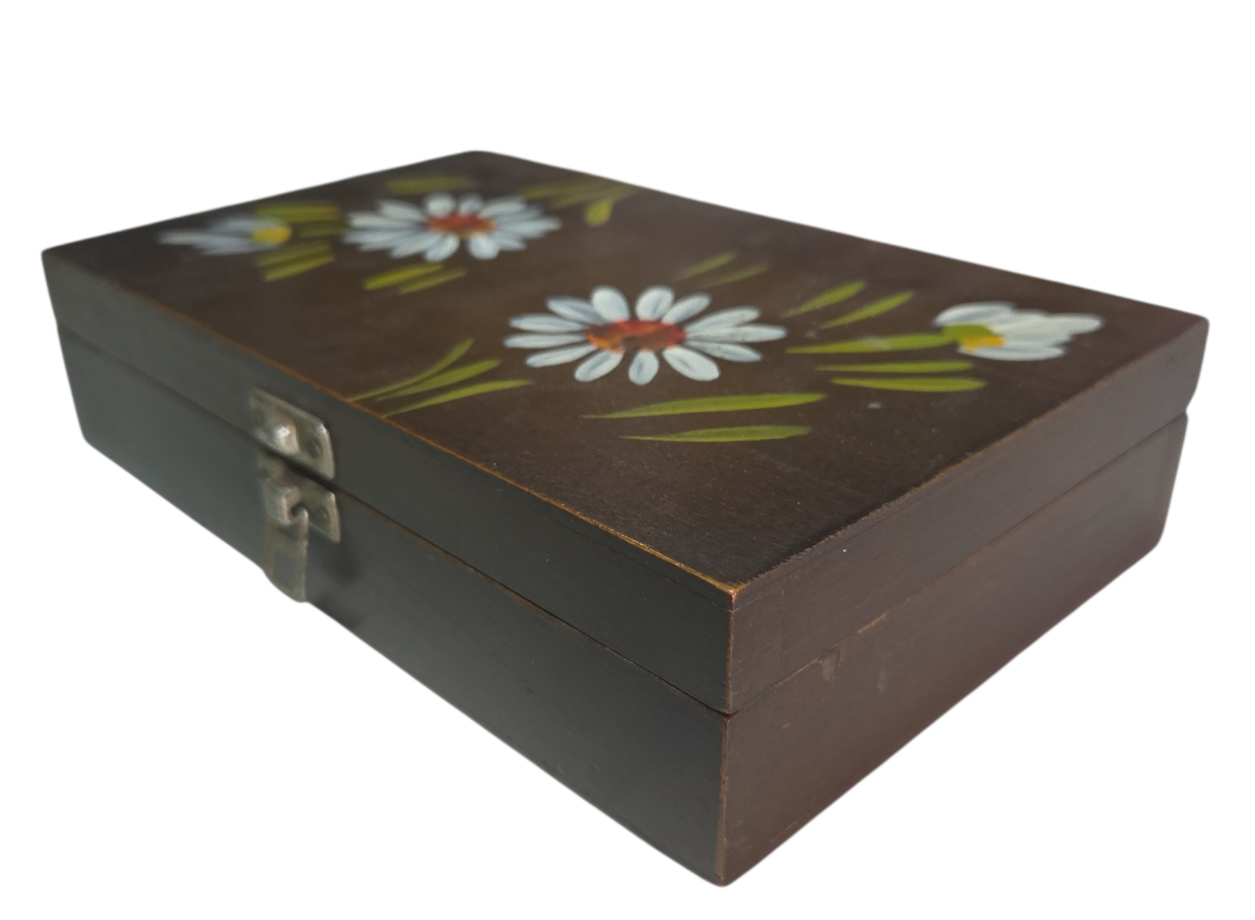 Guarde seus tesouros com a delicadeza que eles merecem. Esta caixa de joias em madeira maciça apresenta um acabamento encantador com flores detalhadas na tampa, unindo o rústico da madeira à suavidade do design floral. O interior é ideal para organizar anéis, colares e brincos, protegendo-os com elegância.