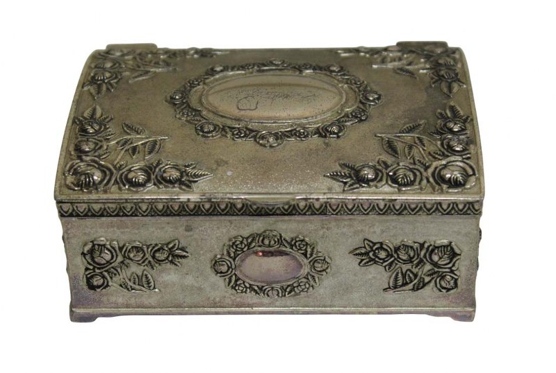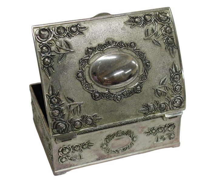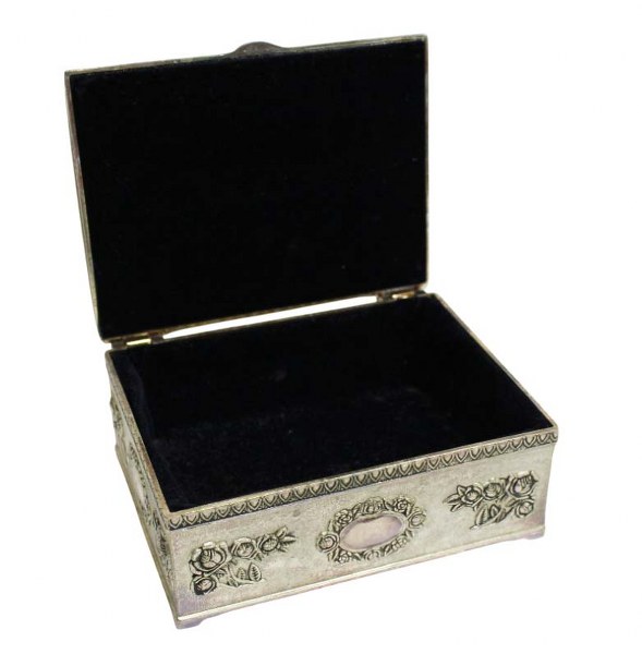 Caixa porta joias em metal prateado com decoração de guirlandas de flores em alto relevo e medalhão central. Parte interna com acabamento em veludo preto.