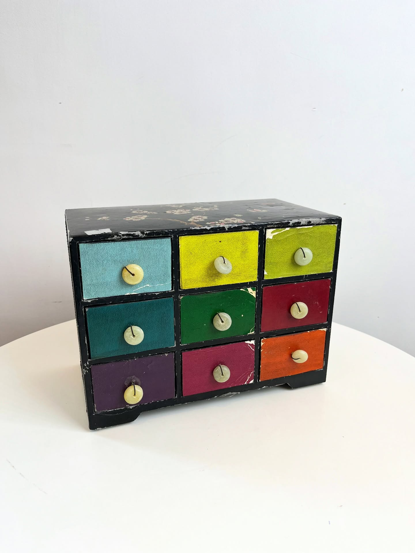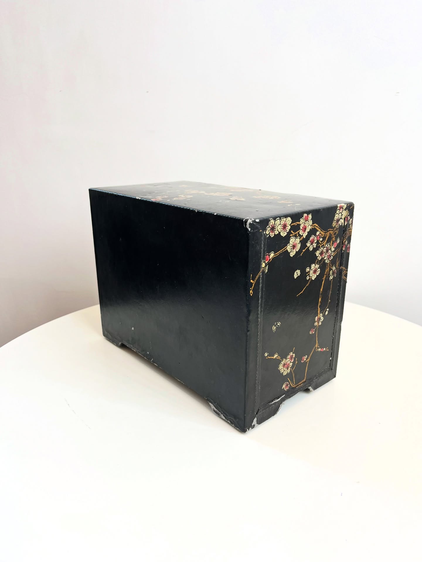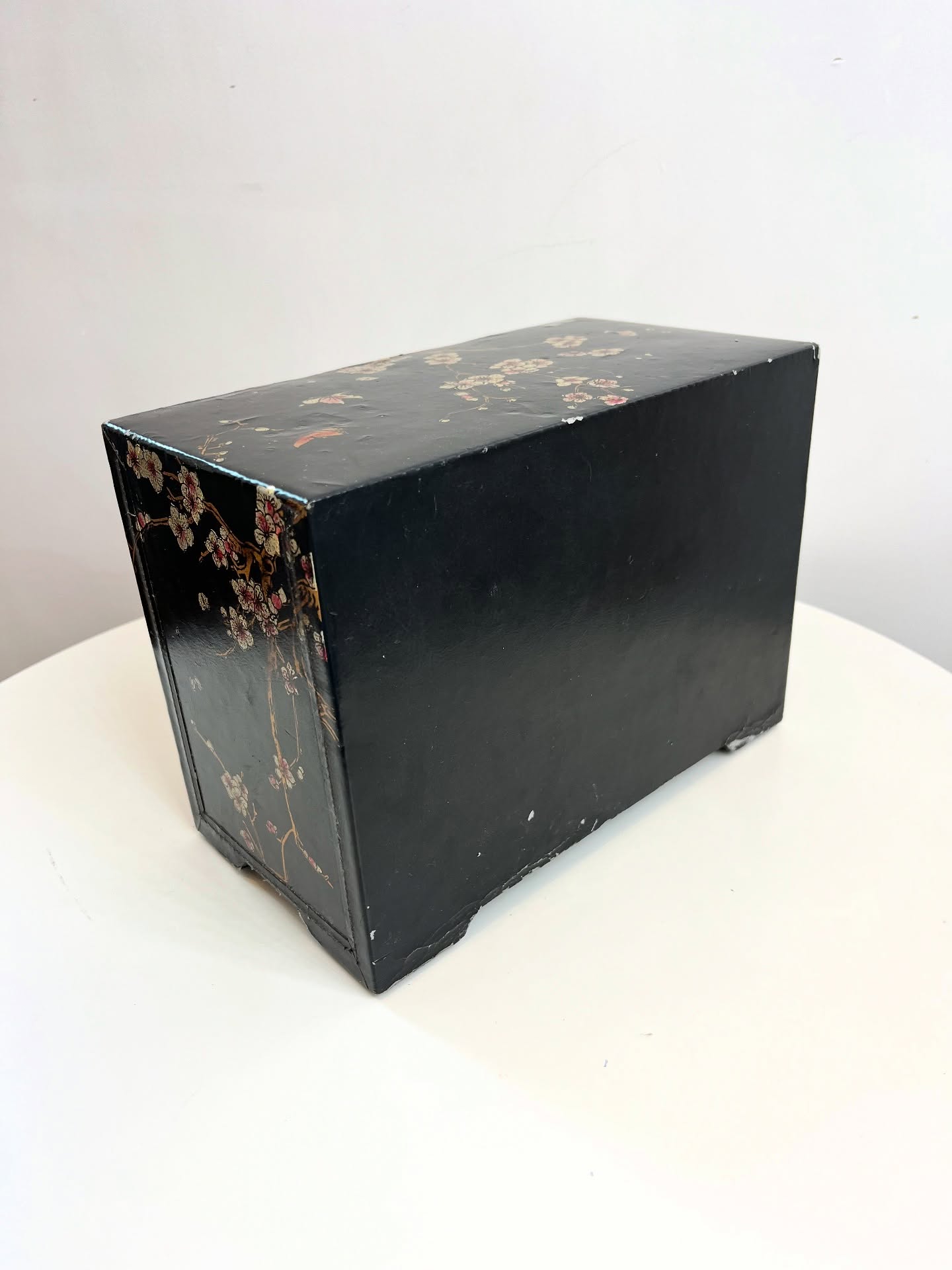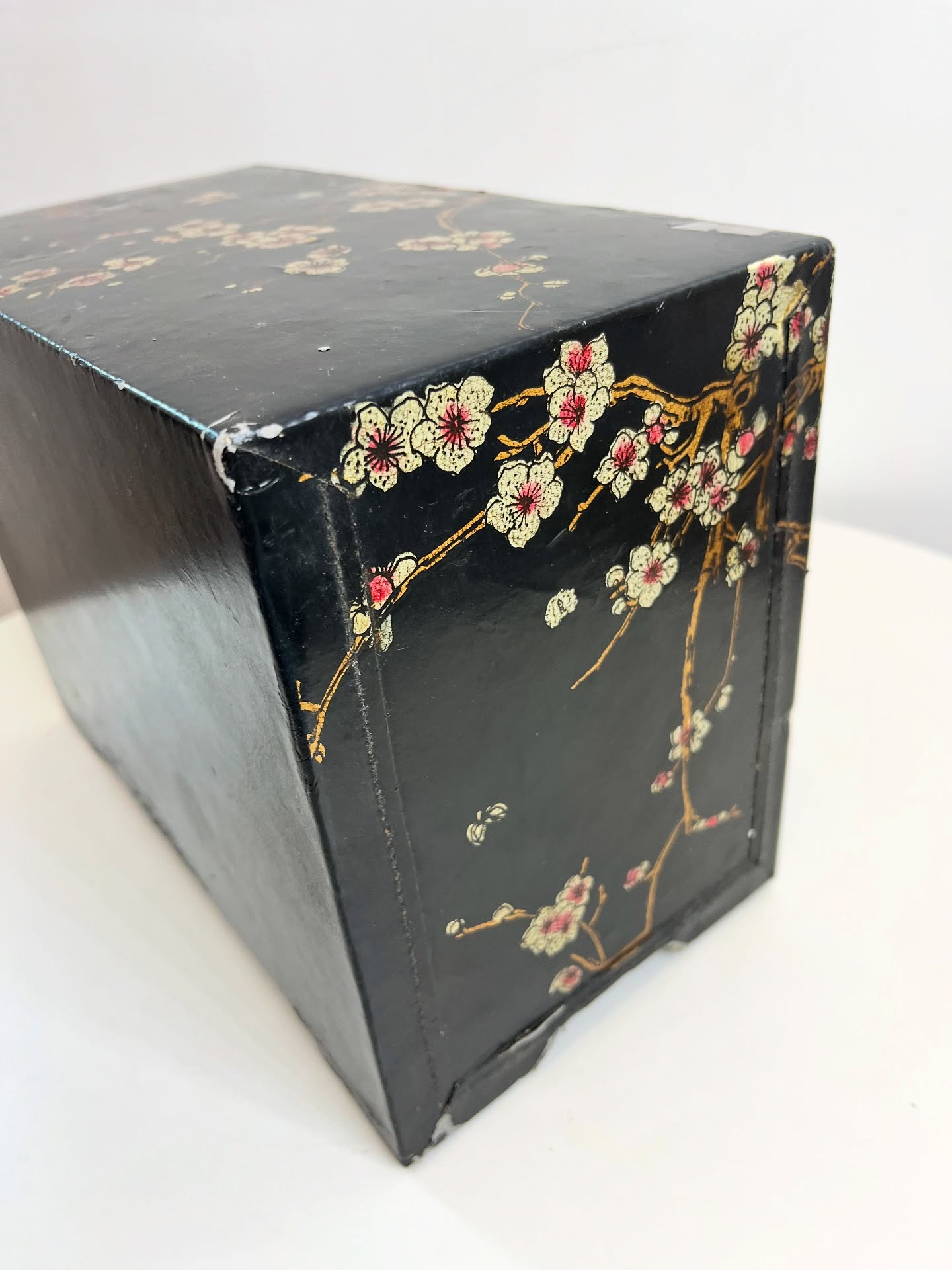 Porta joias ou cacarecos em madeira revestida em material sintético. Várias marcas do tempo e uso como nas fotos.