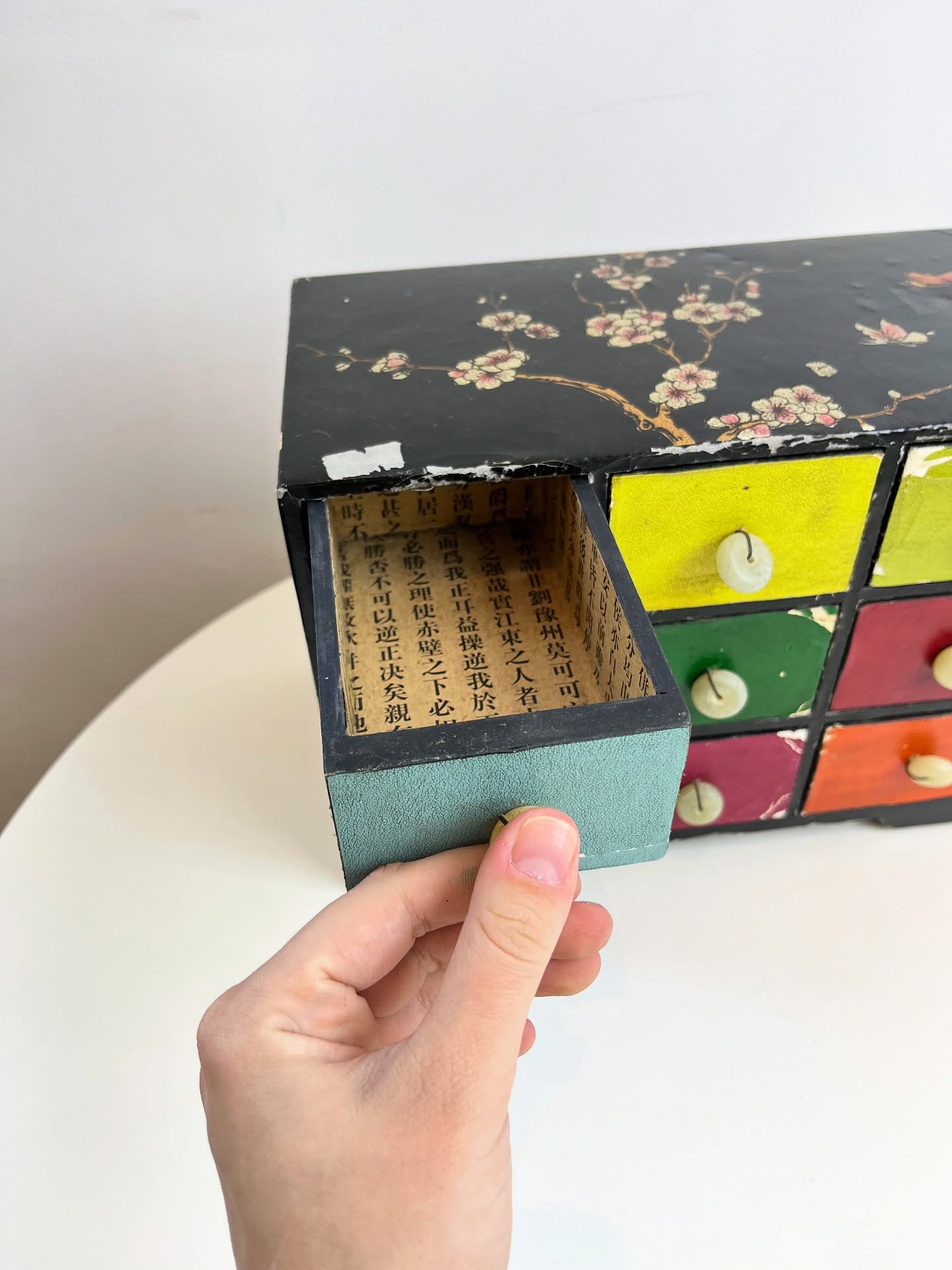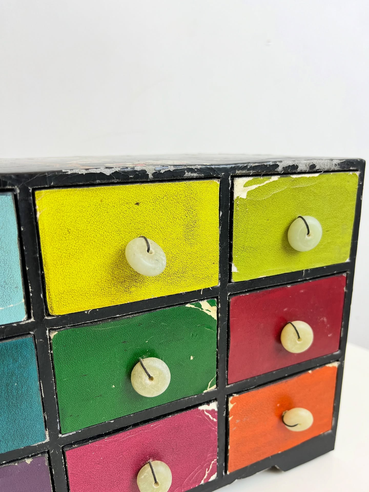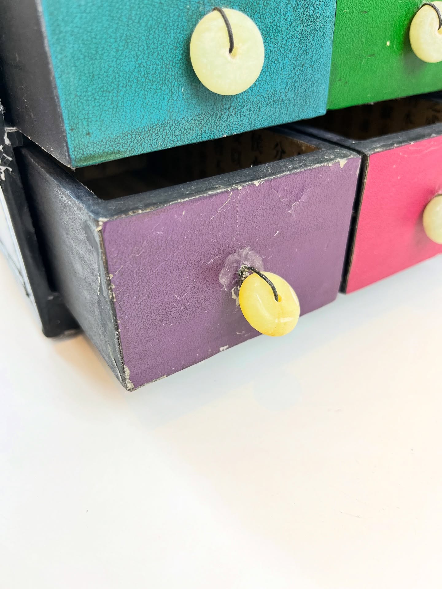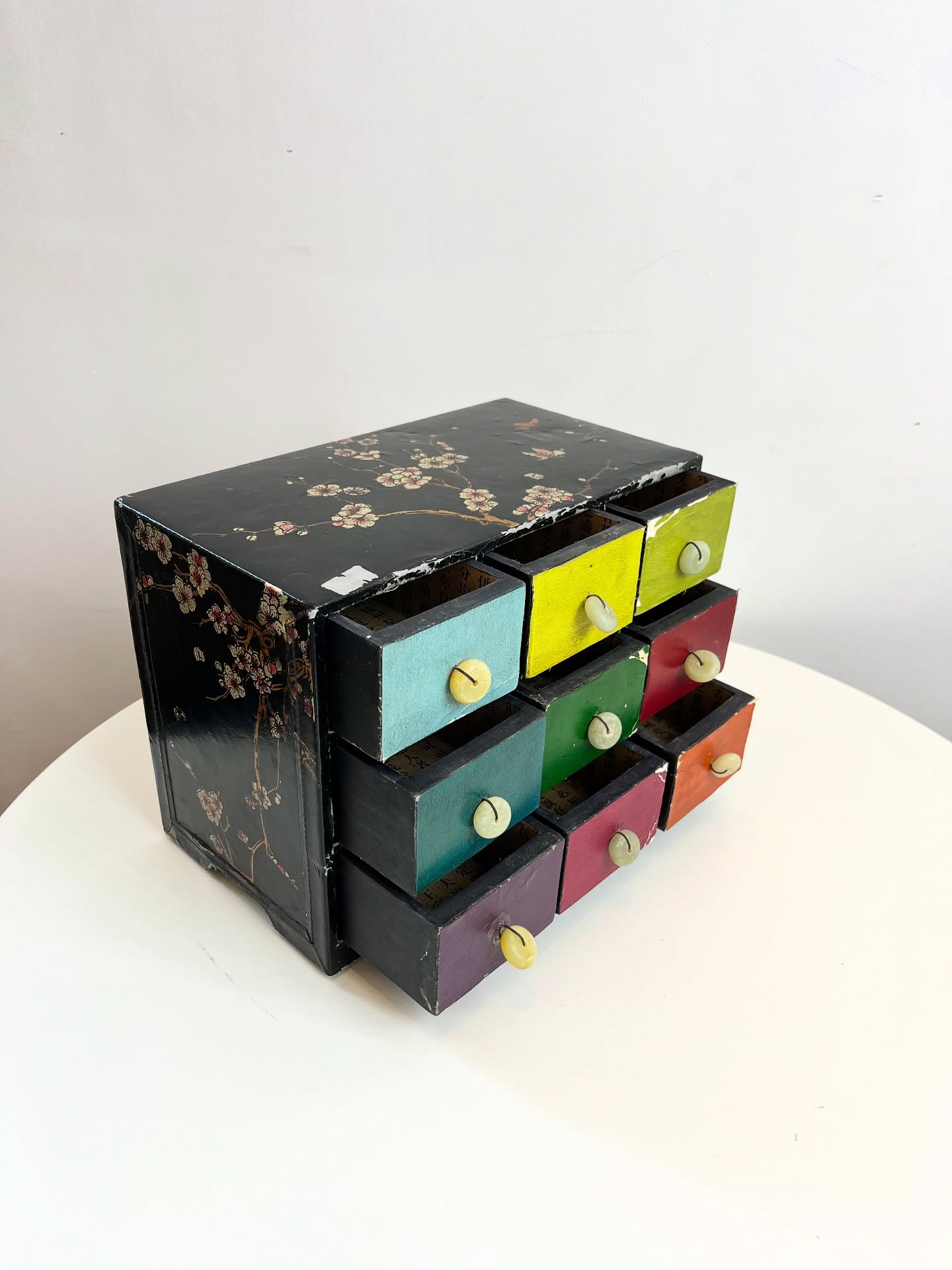 Porta joias ou cacarecos em madeira revestida em material sintético. Várias marcas do tempo e uso como nas fotos.