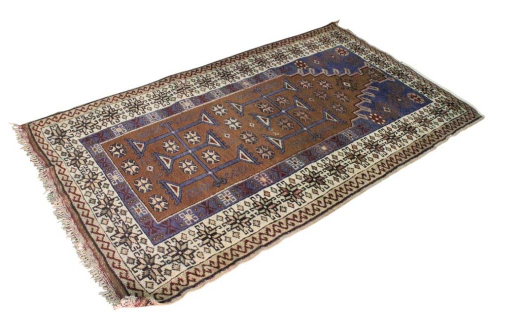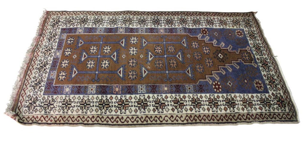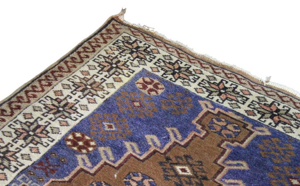 Tapete persa em tons de marrom, mostarda e azul, com decoração geométrica. Necessita refazer as franjas.
