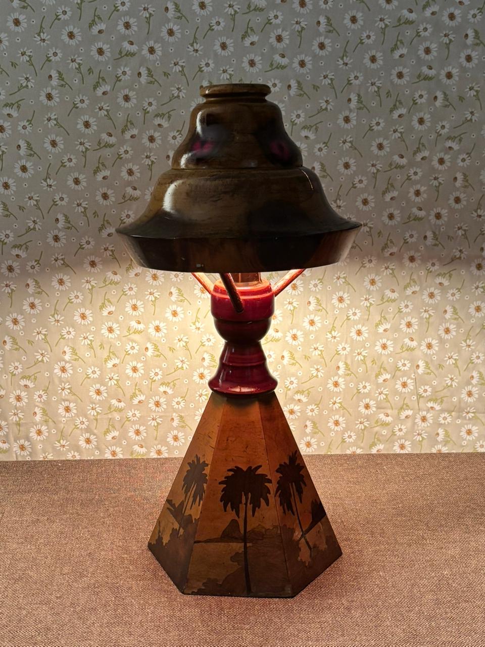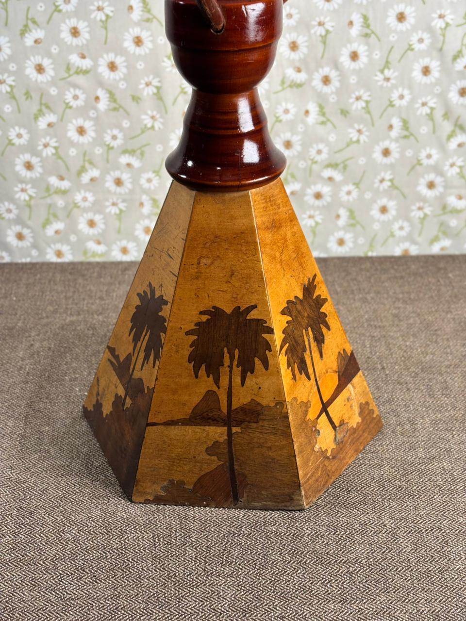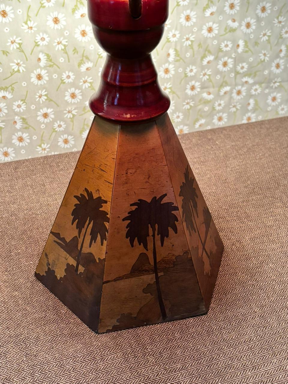 Peça rara e de forte presença decorativa, este abajur é inteiramente produzido em madeira e reúne elementos pouco comuns em um único conjunto: cúpula rígida original, estrutura central em madeira e base com trabalho de marchetaria figurativa, formando uma paisagem com palmeiras. O resultado é uma peça cênica, ornamental e muito singular, daquelas que se destacam não apenas como iluminação, mas também como objeto de coleção e composição.