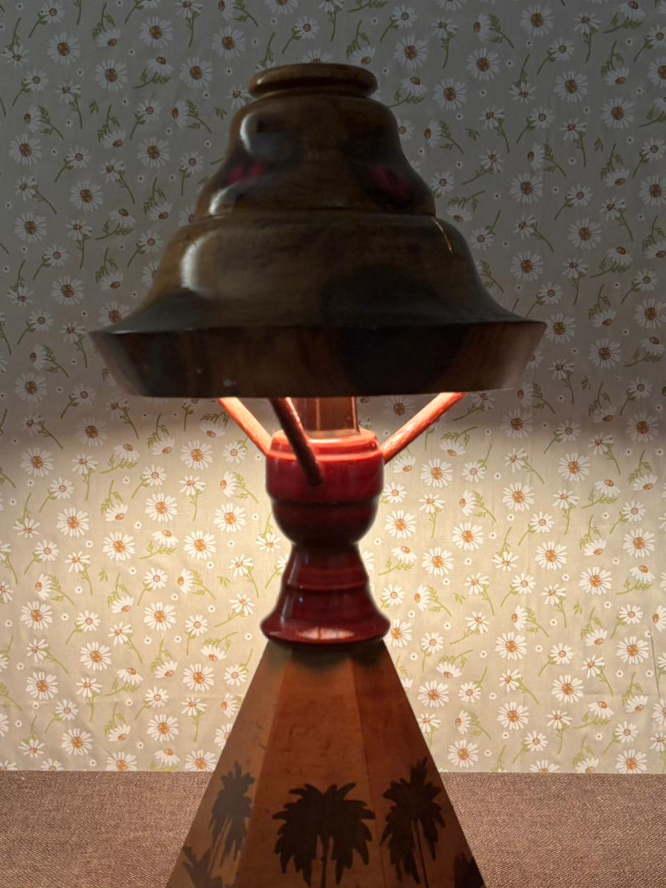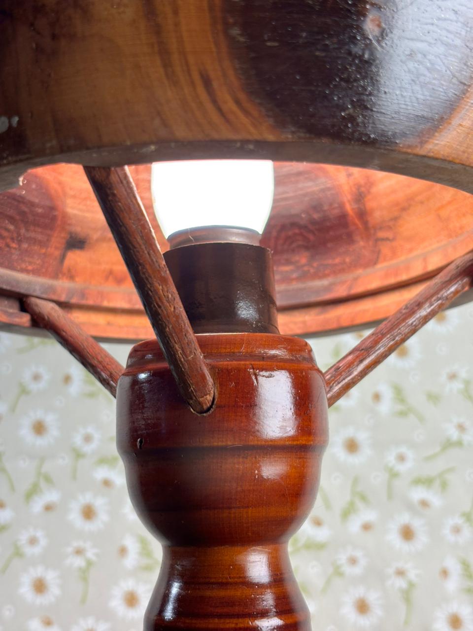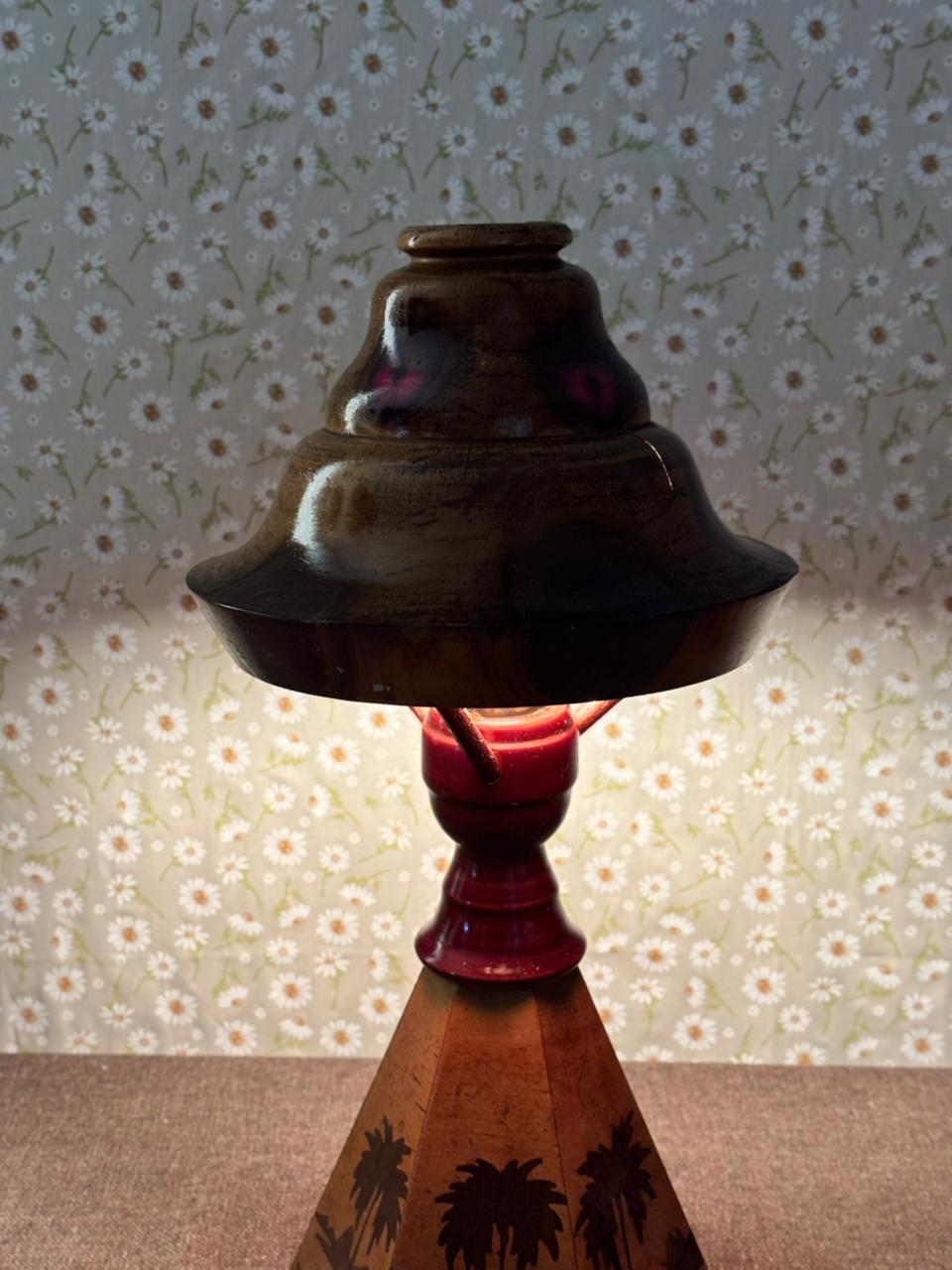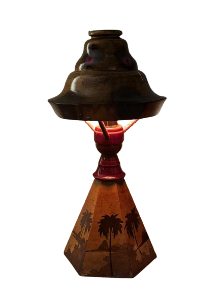 Peça rara e de forte presença decorativa, este abajur é inteiramente produzido em madeira e reúne elementos pouco comuns em um único conjunto: cúpula rígida original, estrutura central em madeira e base com trabalho de marchetaria figurativa, formando uma paisagem com palmeiras. O resultado é uma peça cênica, ornamental e muito singular, daquelas que se destacam não apenas como iluminação, mas também como objeto de coleção e composição.