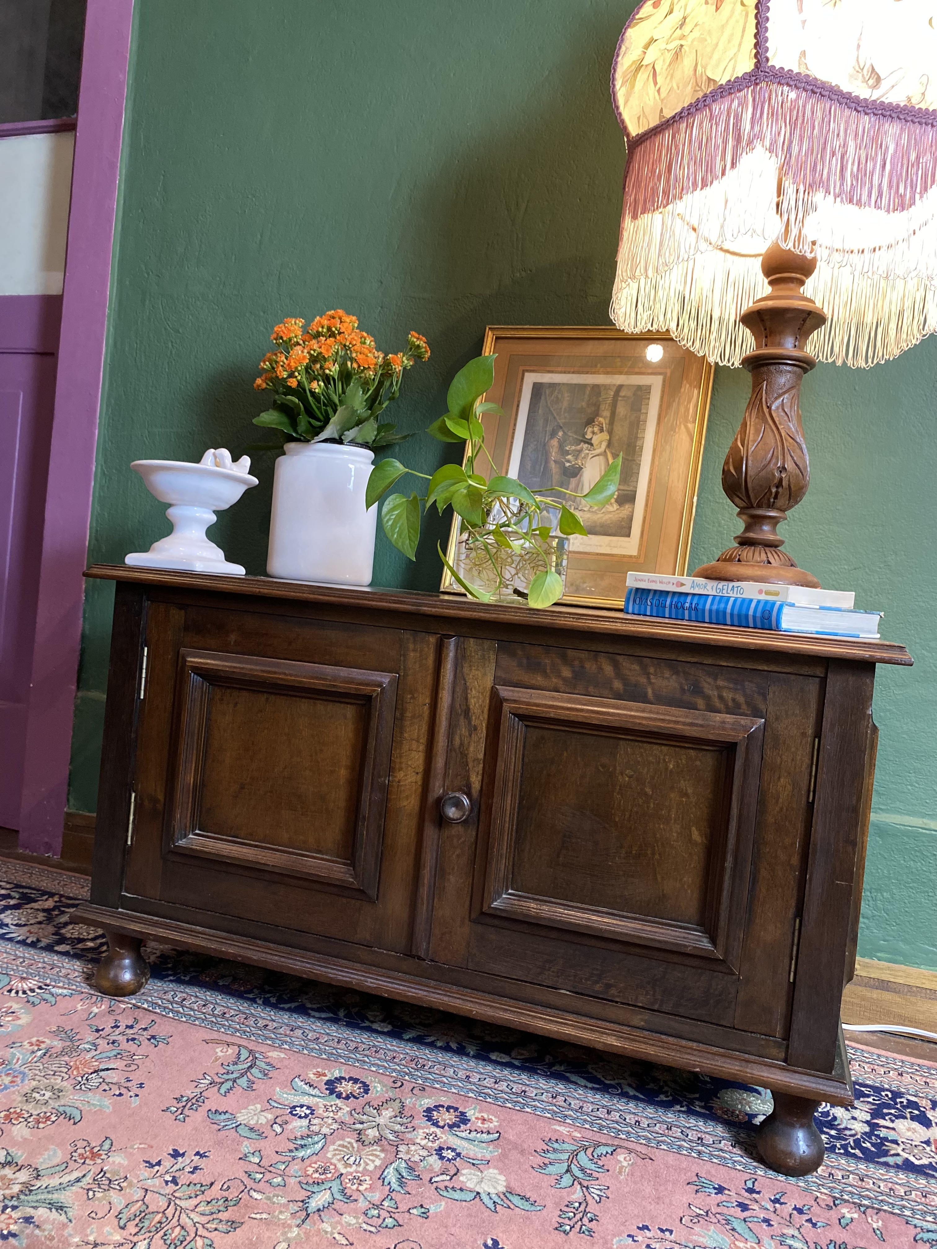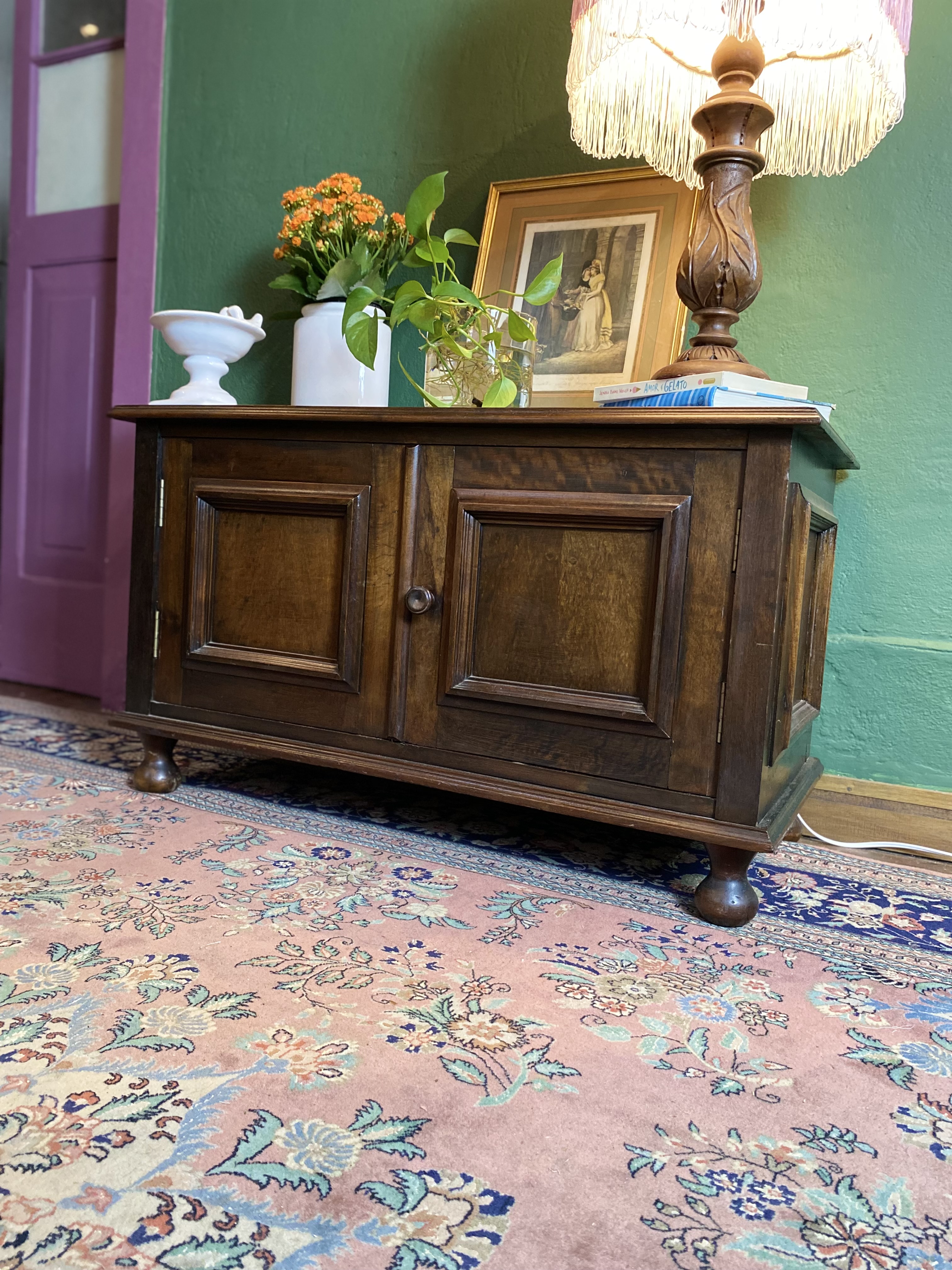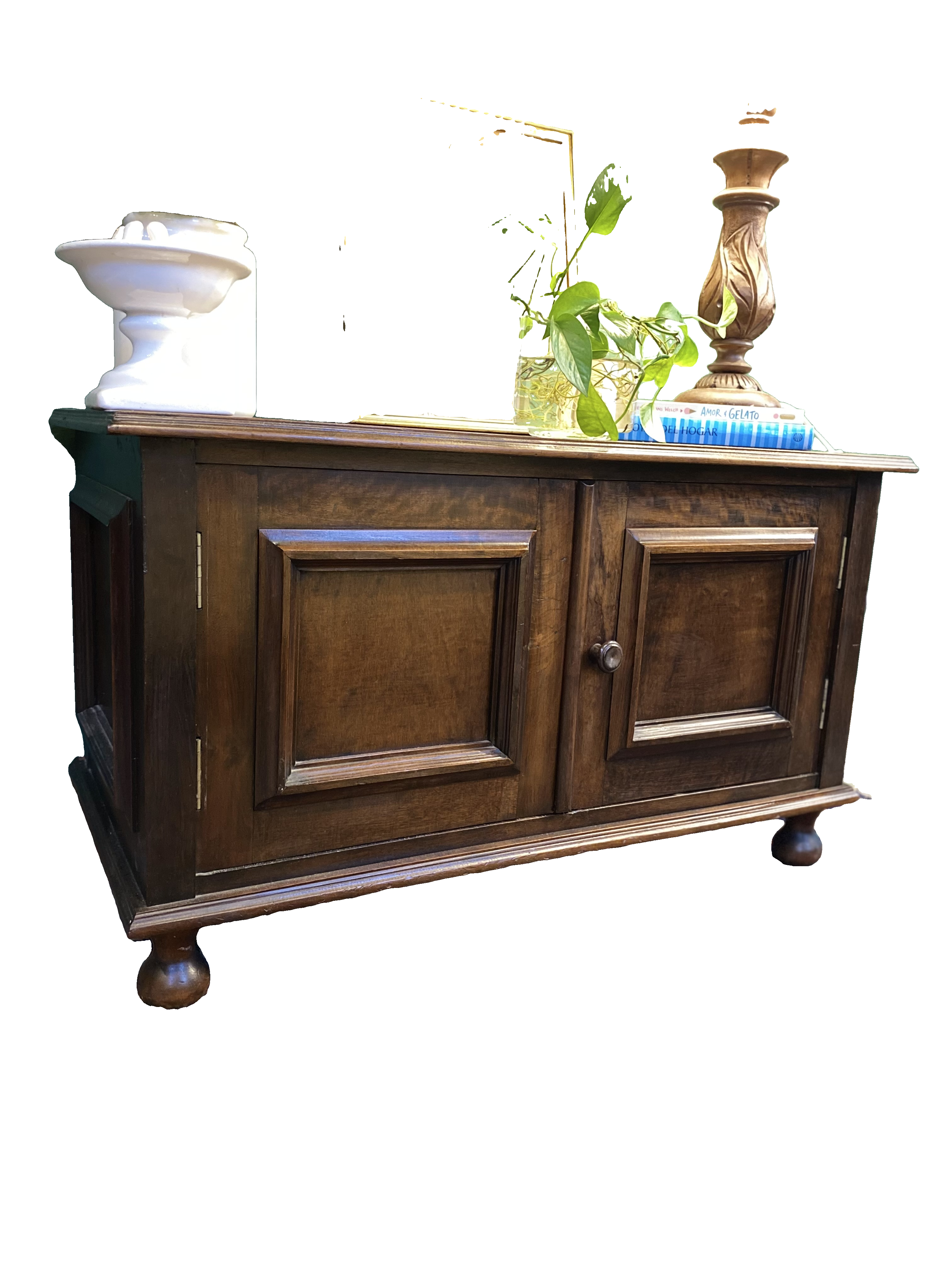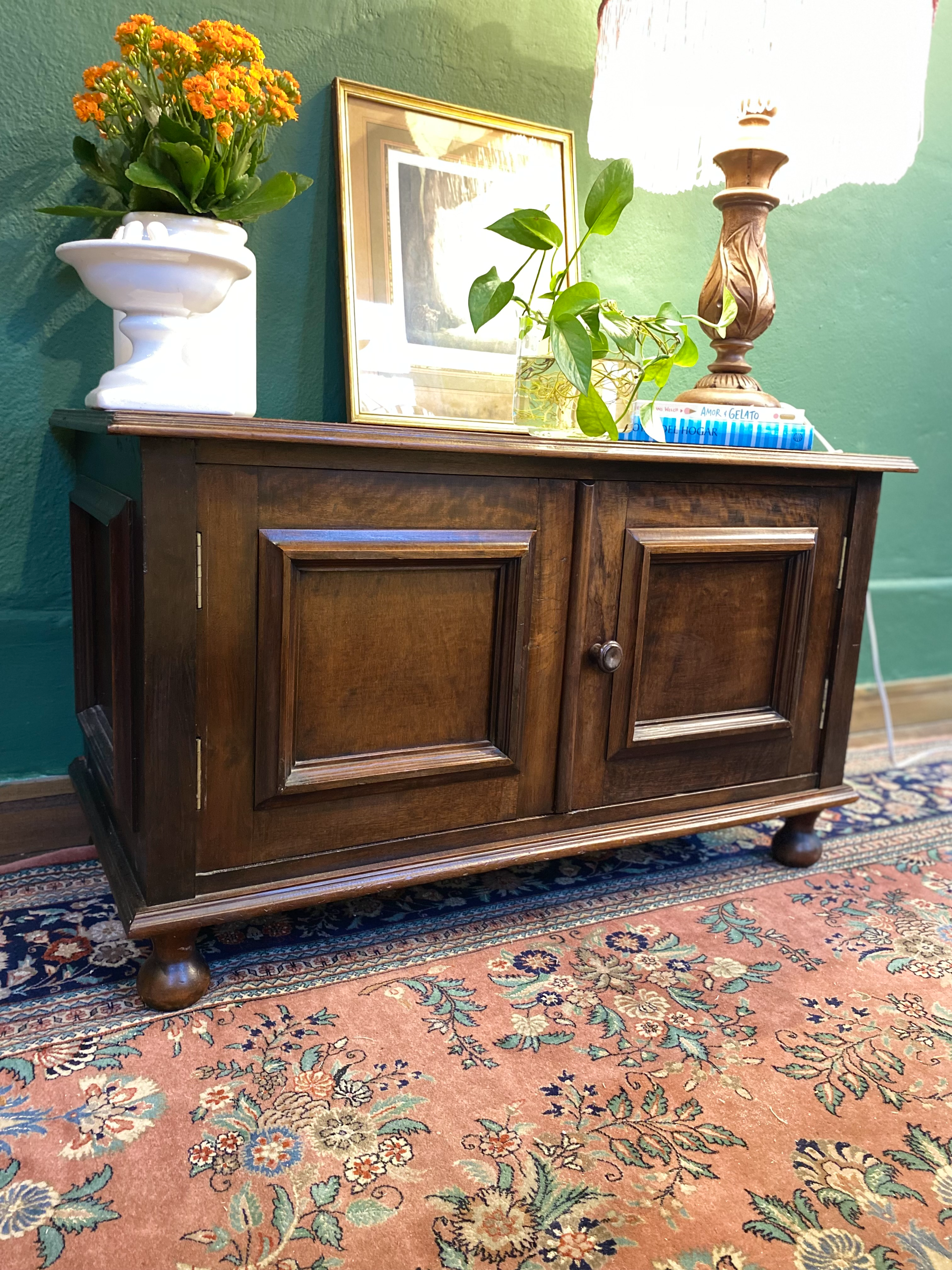 Antiguidade: móvel executado em madeira nobre, possui 2 portas, 1 prateleira e pés de bolacha.