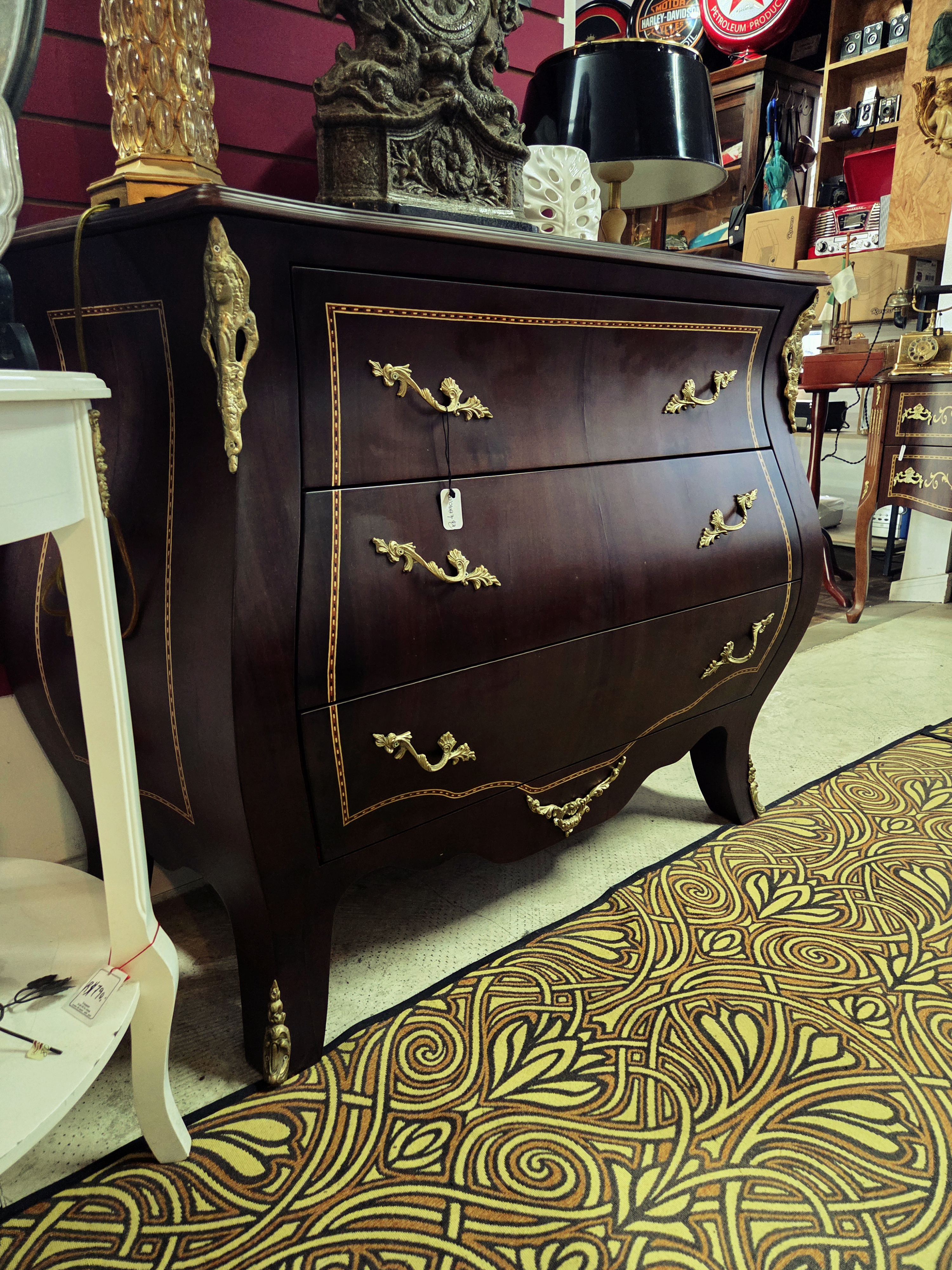 Esta Cômoda Bombê é uma peça magnífica que representa o auge do mobiliário de alto padrão. Construída em imbuia nobre, sua estrutura apresenta as curvas sinuosas e elegantes características do estilo, sendo uma verdadeira declaração de luxo e bom gosto.