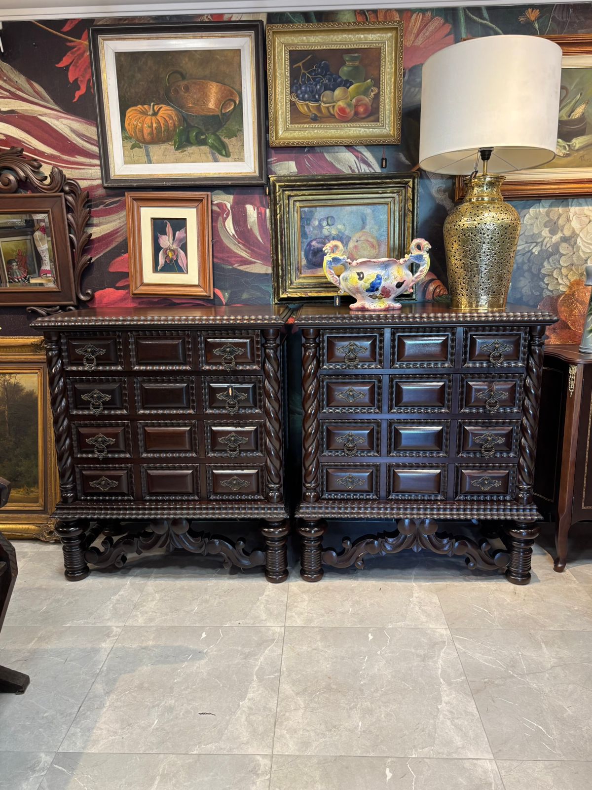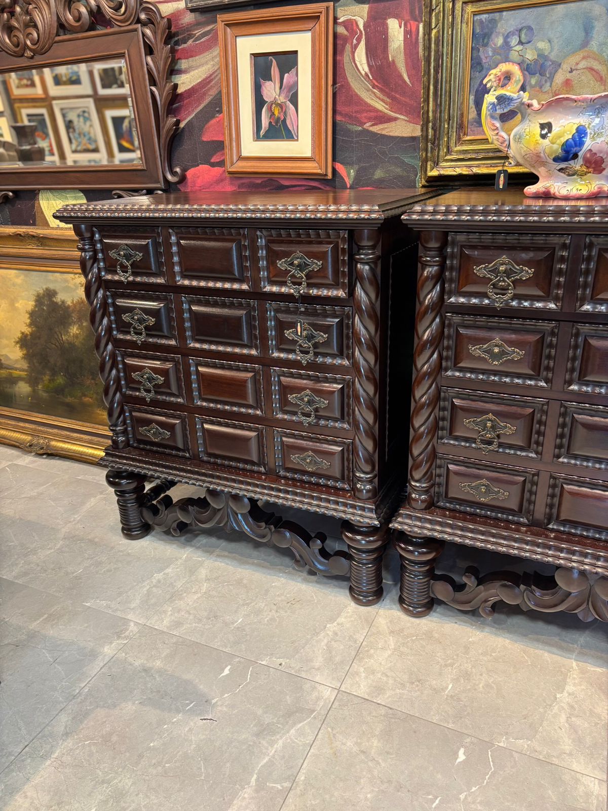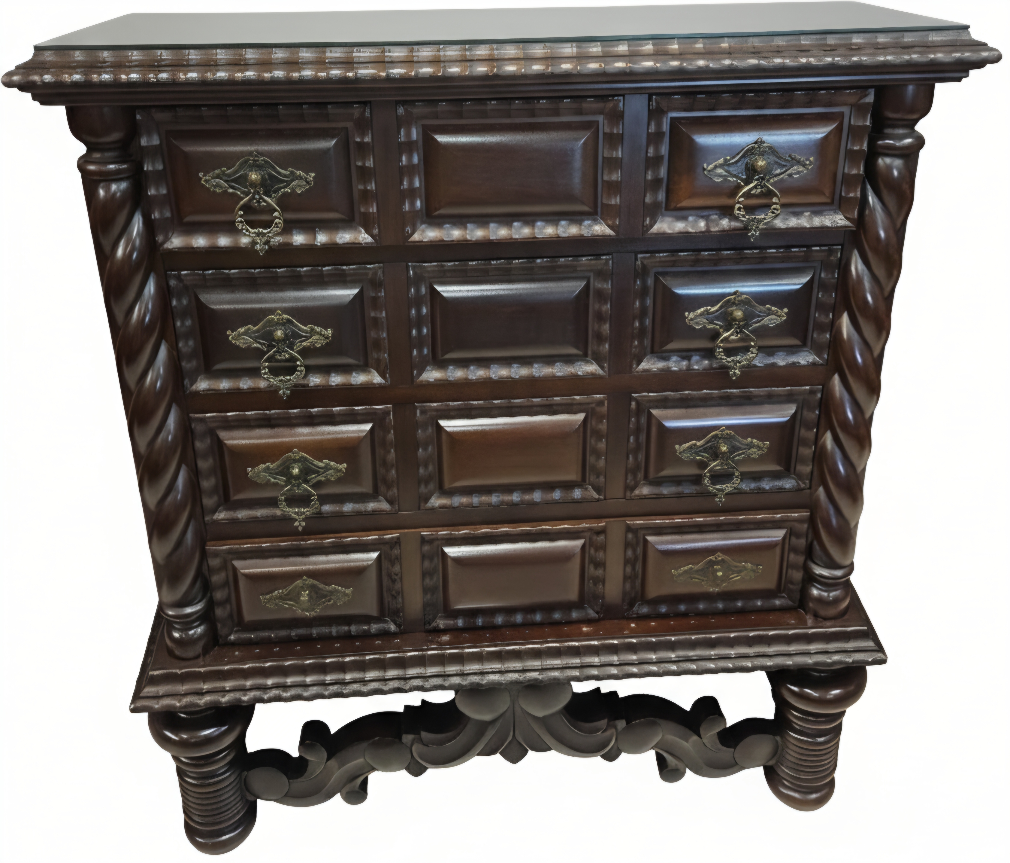 Imponência e Armazenamento: Gavetas robustas com ferragens em metal trabalhado, aliando a funcionalidade de uma cômoda à presença de uma escultura.