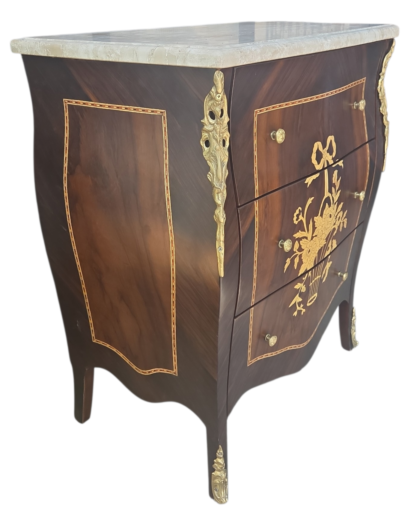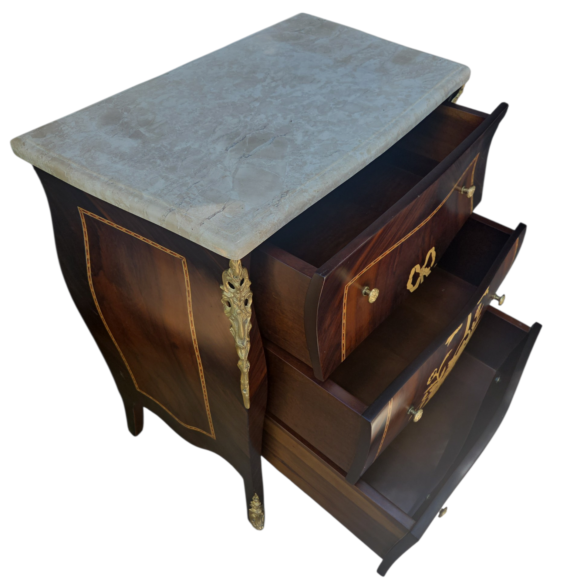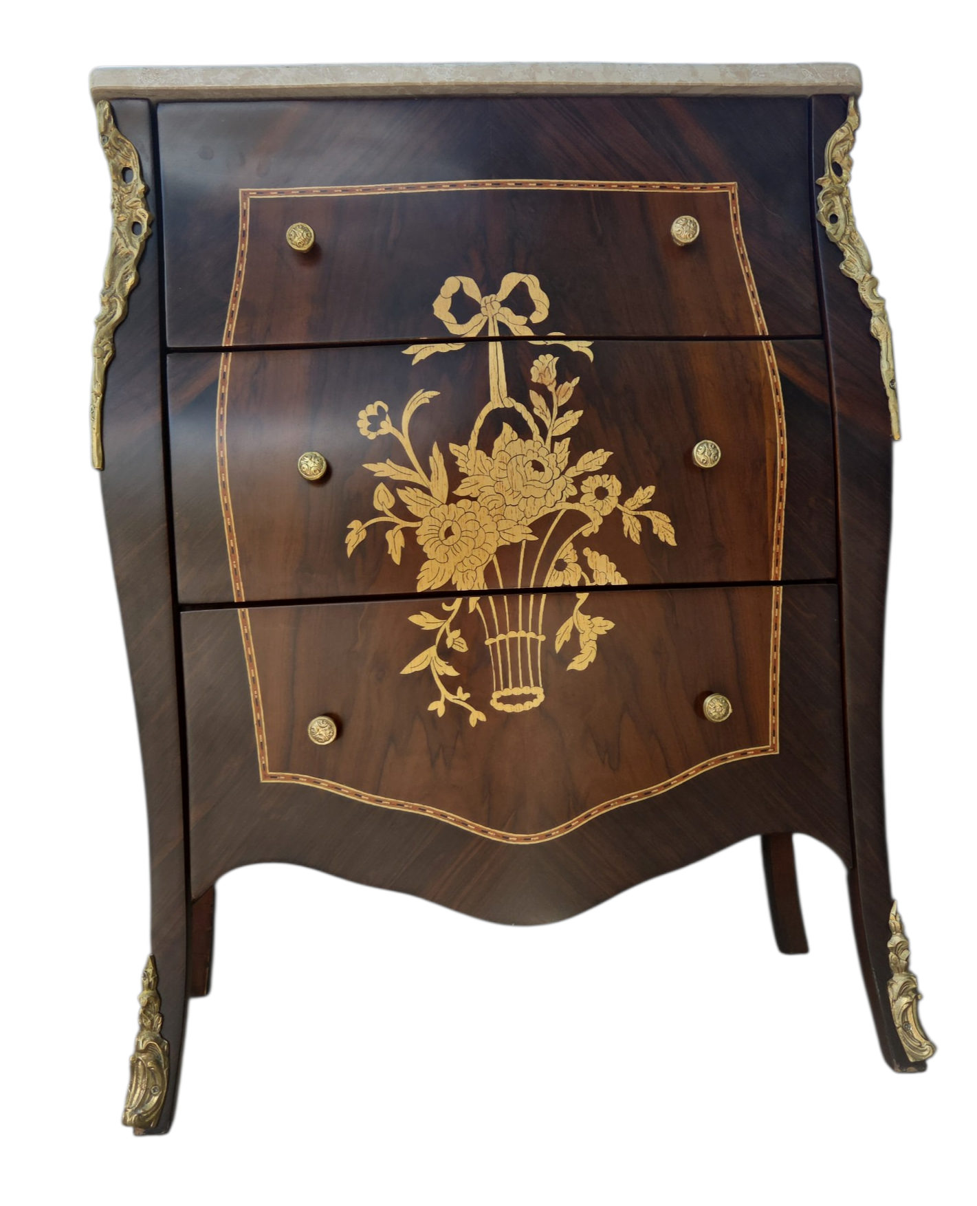 Esta belíssima mesa de cabeceira (ou mini cômoda) é uma peça que exala o rigor e o charme do design clássico. Executada em madeira Jequitibá, conhecida por sua durabilidade e veios distintos, a peça apresenta um trabalho primoroso de marchetaria, que confere um padrão geométrico e artístico às frentes das gavetas.