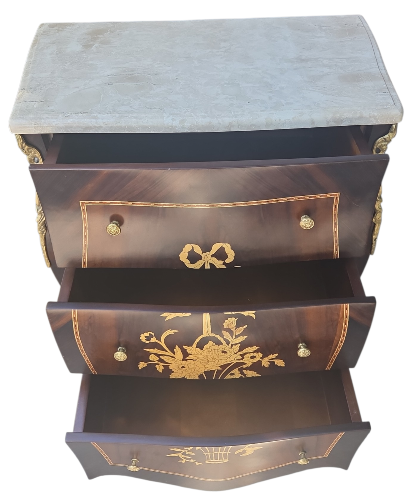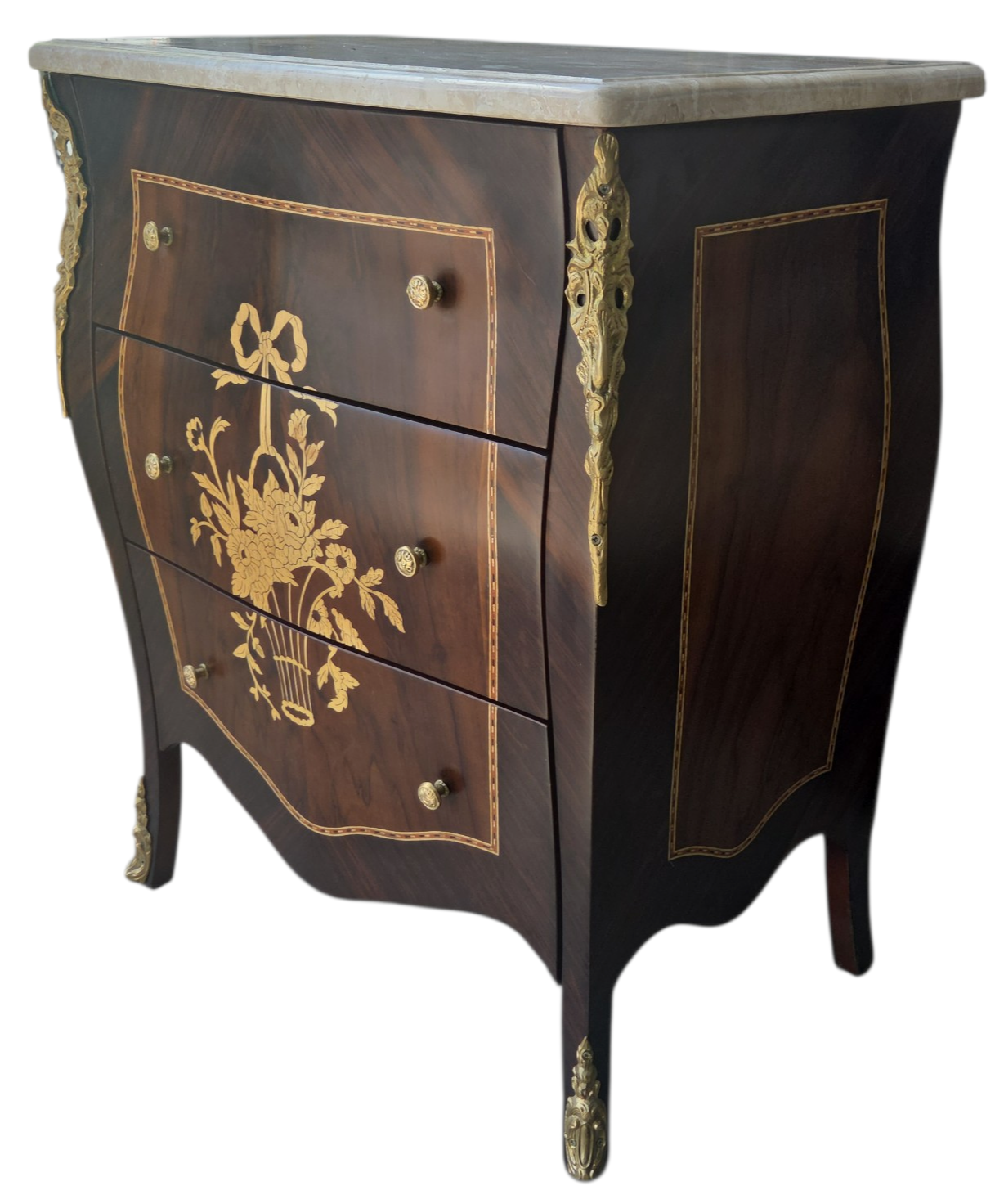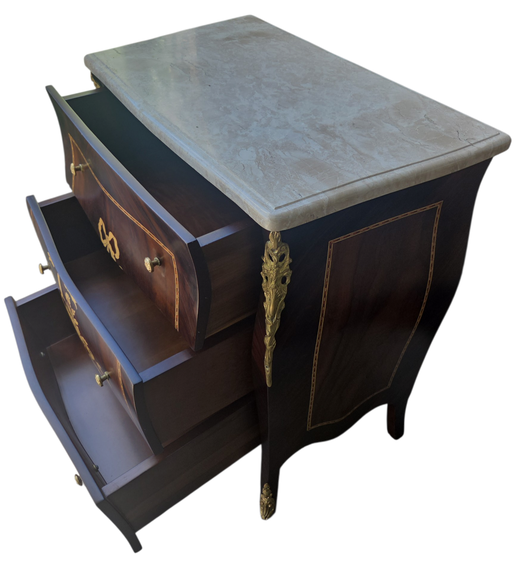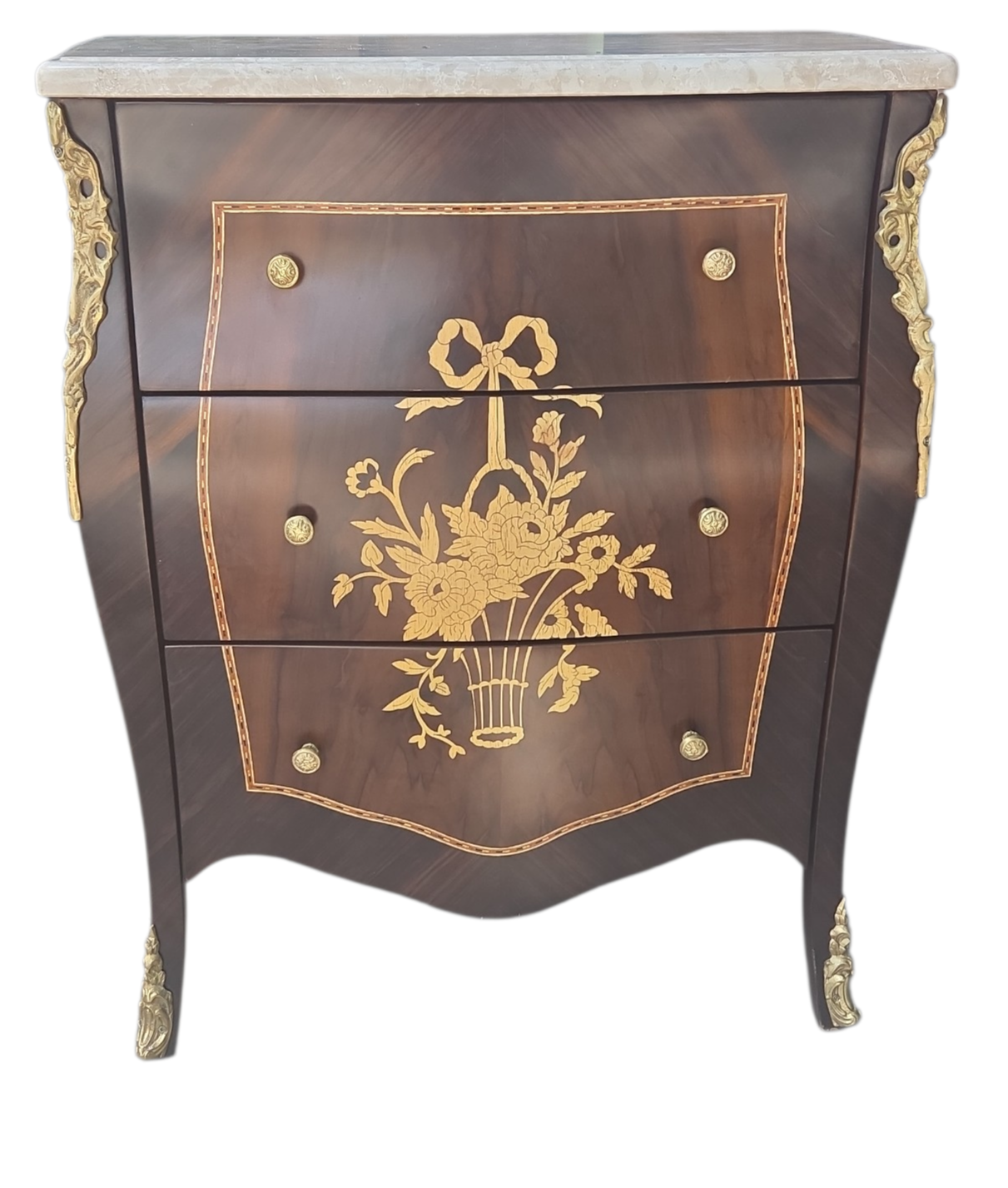 Esta belíssima mesa de cabeceira (ou mini cômoda) é uma peça que exala o rigor e o charme do design clássico. Executada em madeira Jequitibá, conhecida por sua durabilidade e veios distintos, a peça apresenta um trabalho primoroso de marchetaria, que confere um padrão geométrico e artístico às frentes das gavetas.