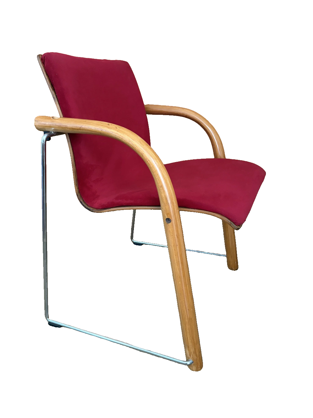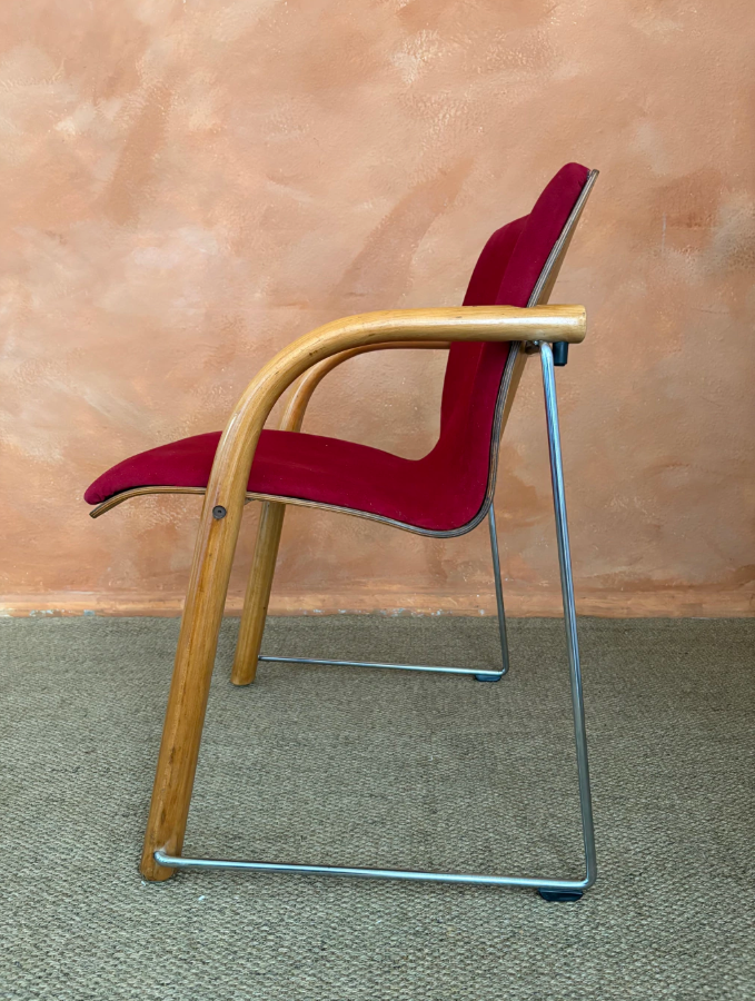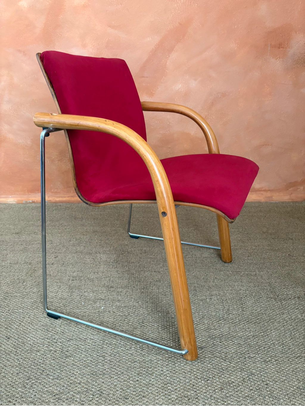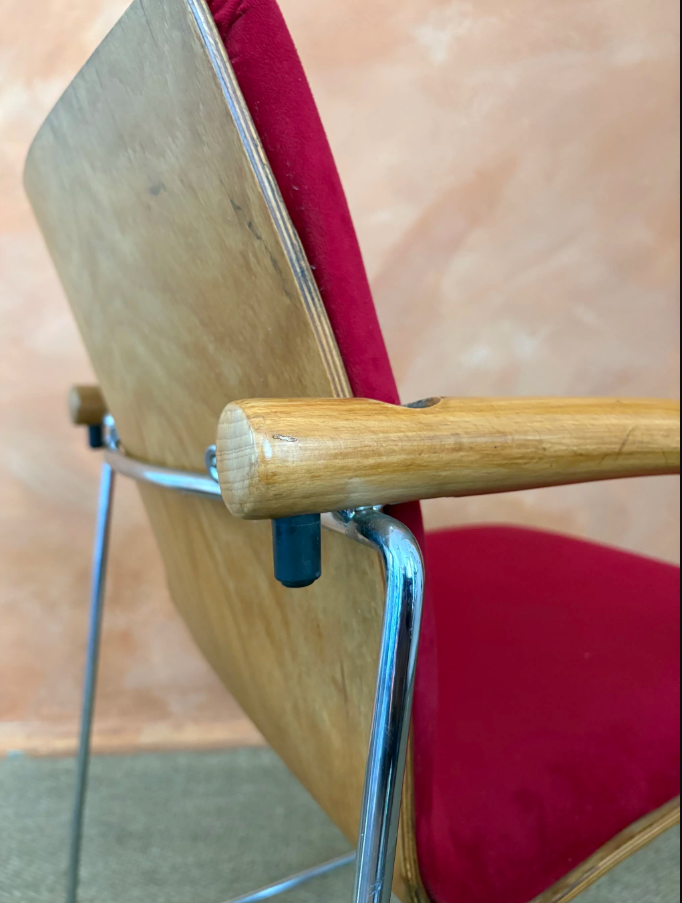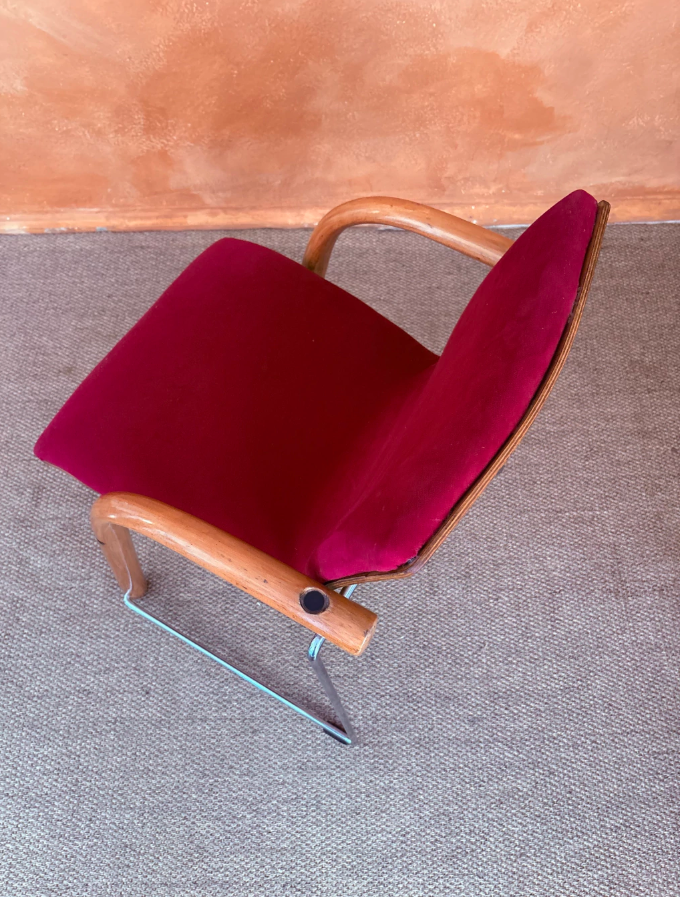A estrutura mistura madeira curvada e aço tubular cromado, materiais que definem boa parte da história da Thonet. O assento e encosto em veludo vermelho trazem cor e suavidade, criando um contraste bonito com o metal e a madeira.