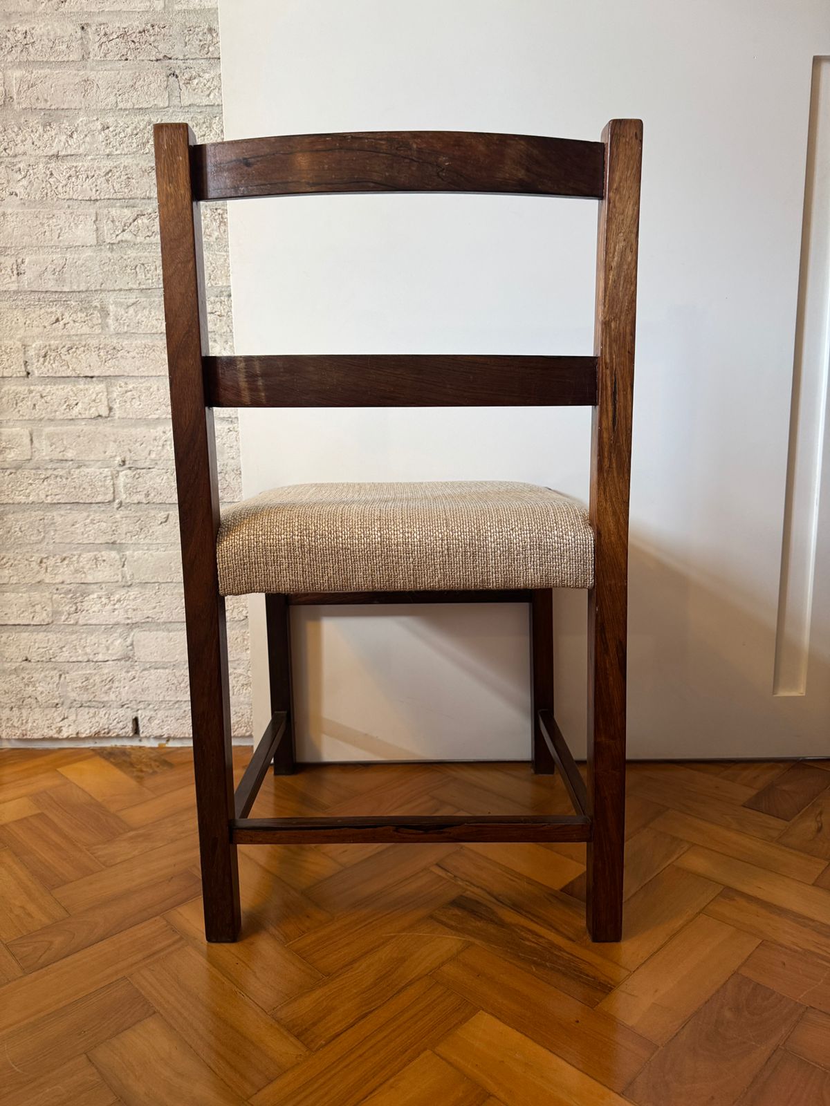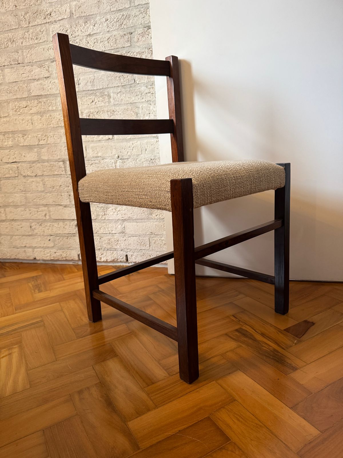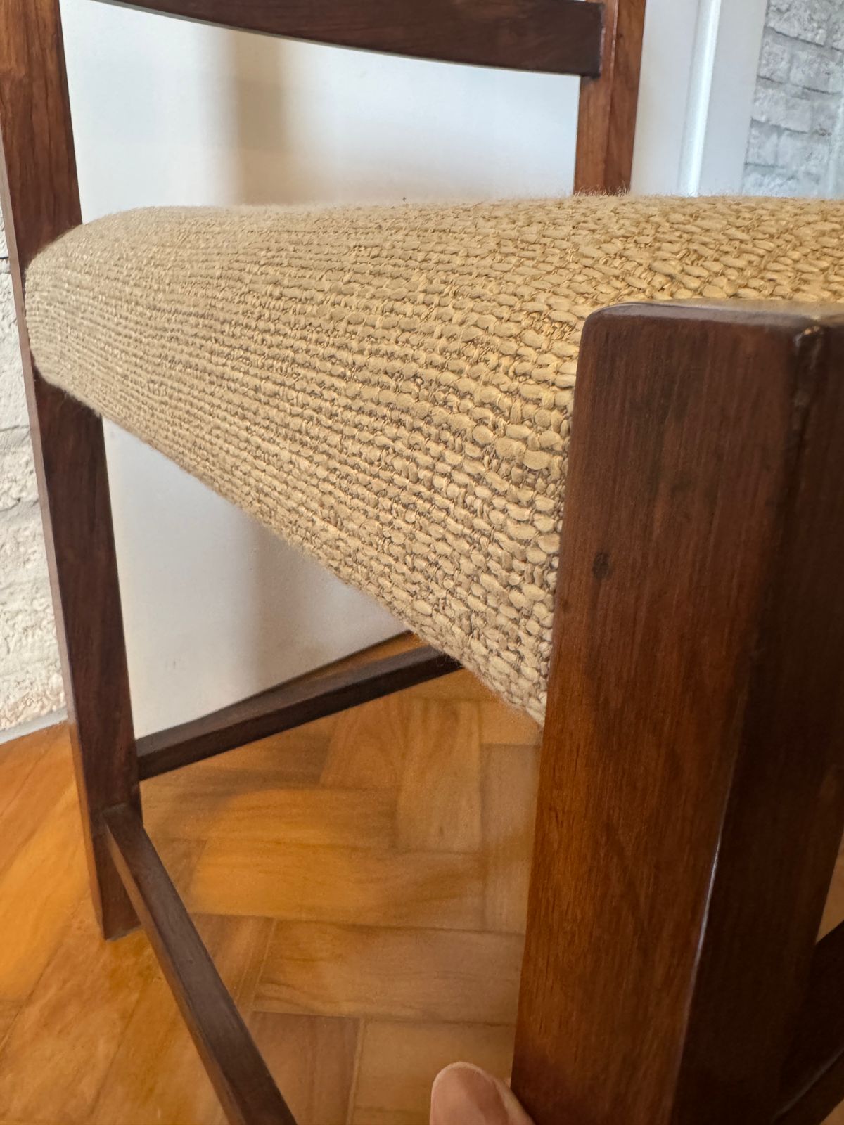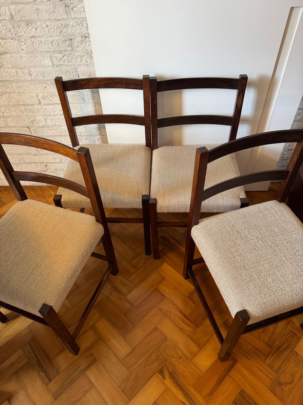 Conjunto com quatro cadeiras Sérgio Rodrigues, confeccionadas em Jacarandá, restauradas em 2022. Forro atual em linhão hidrorepelente Quacker.