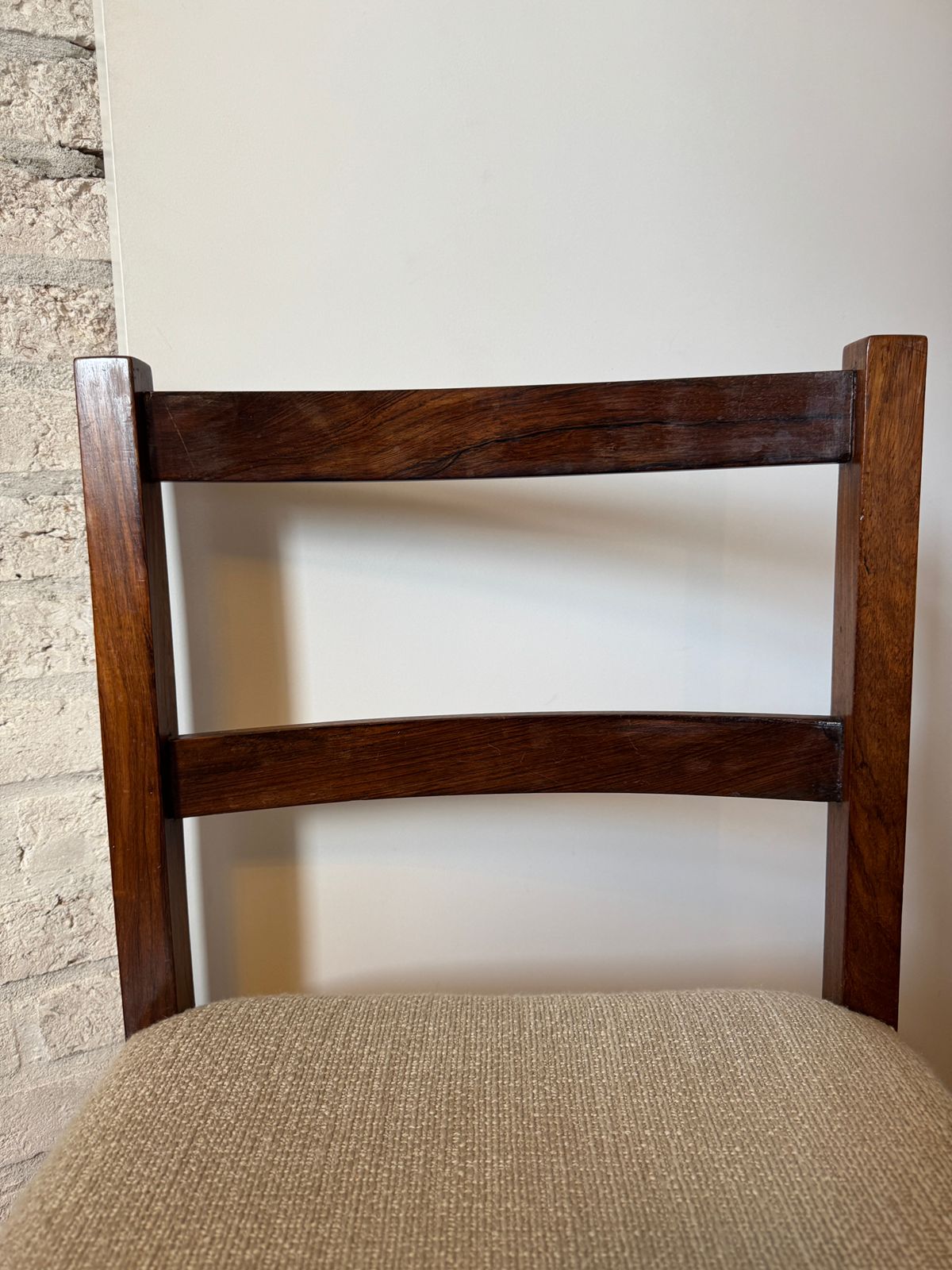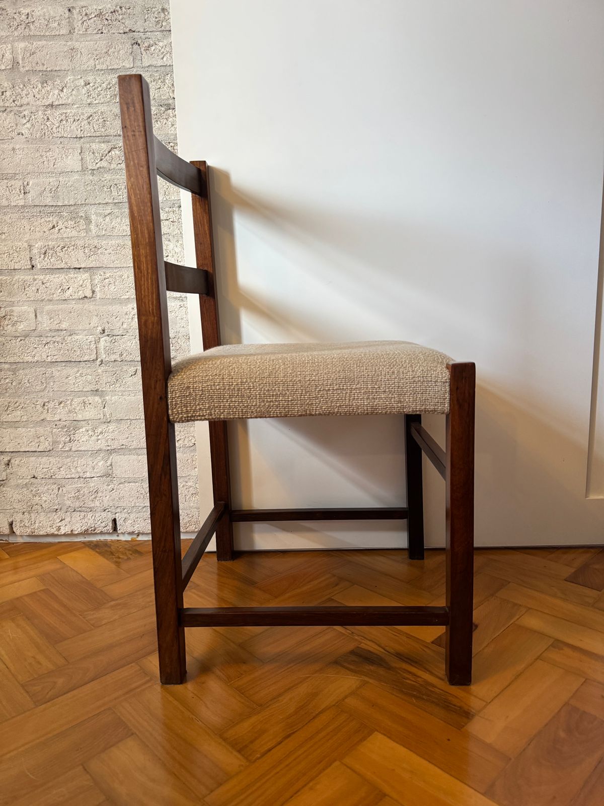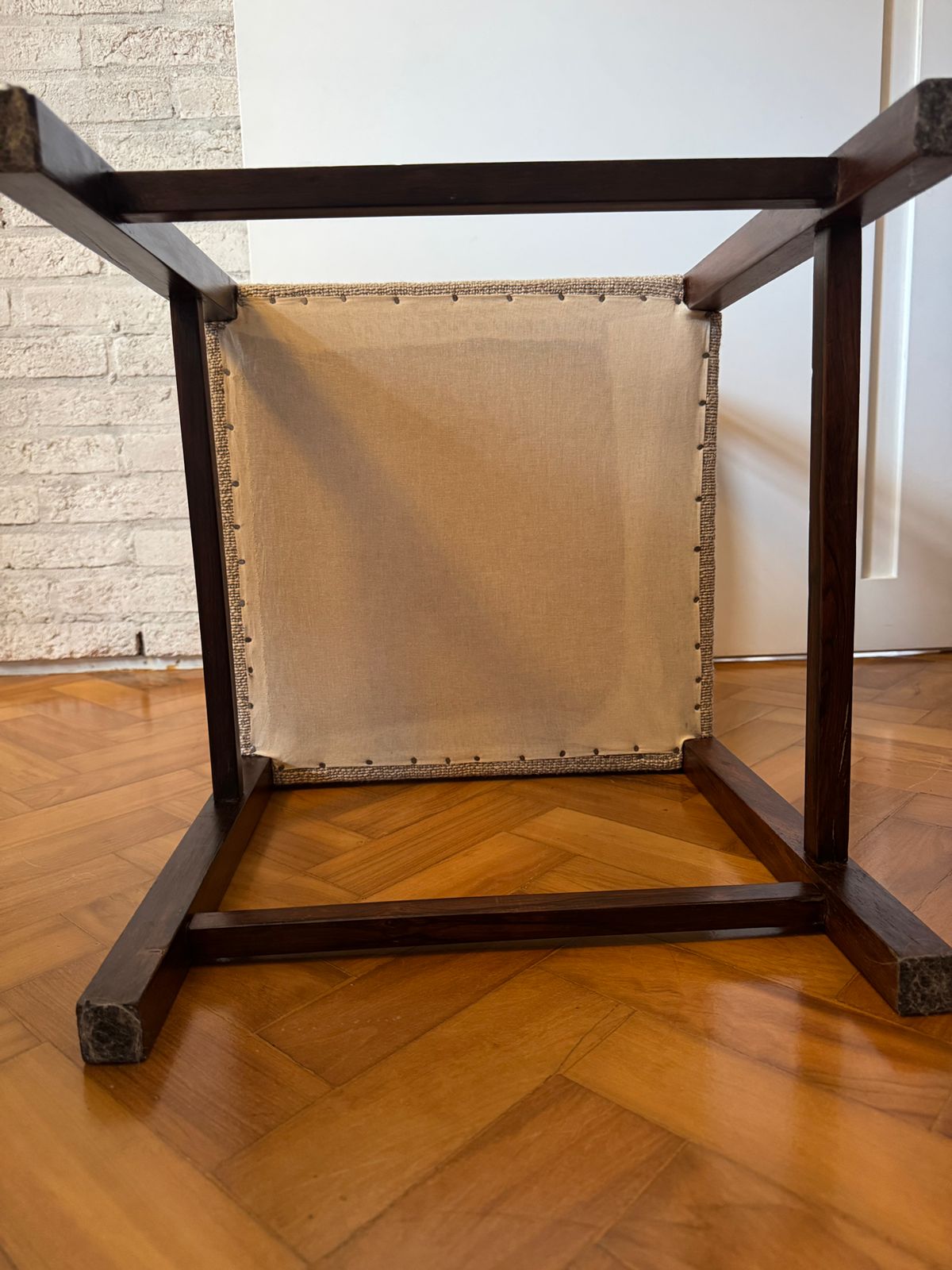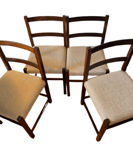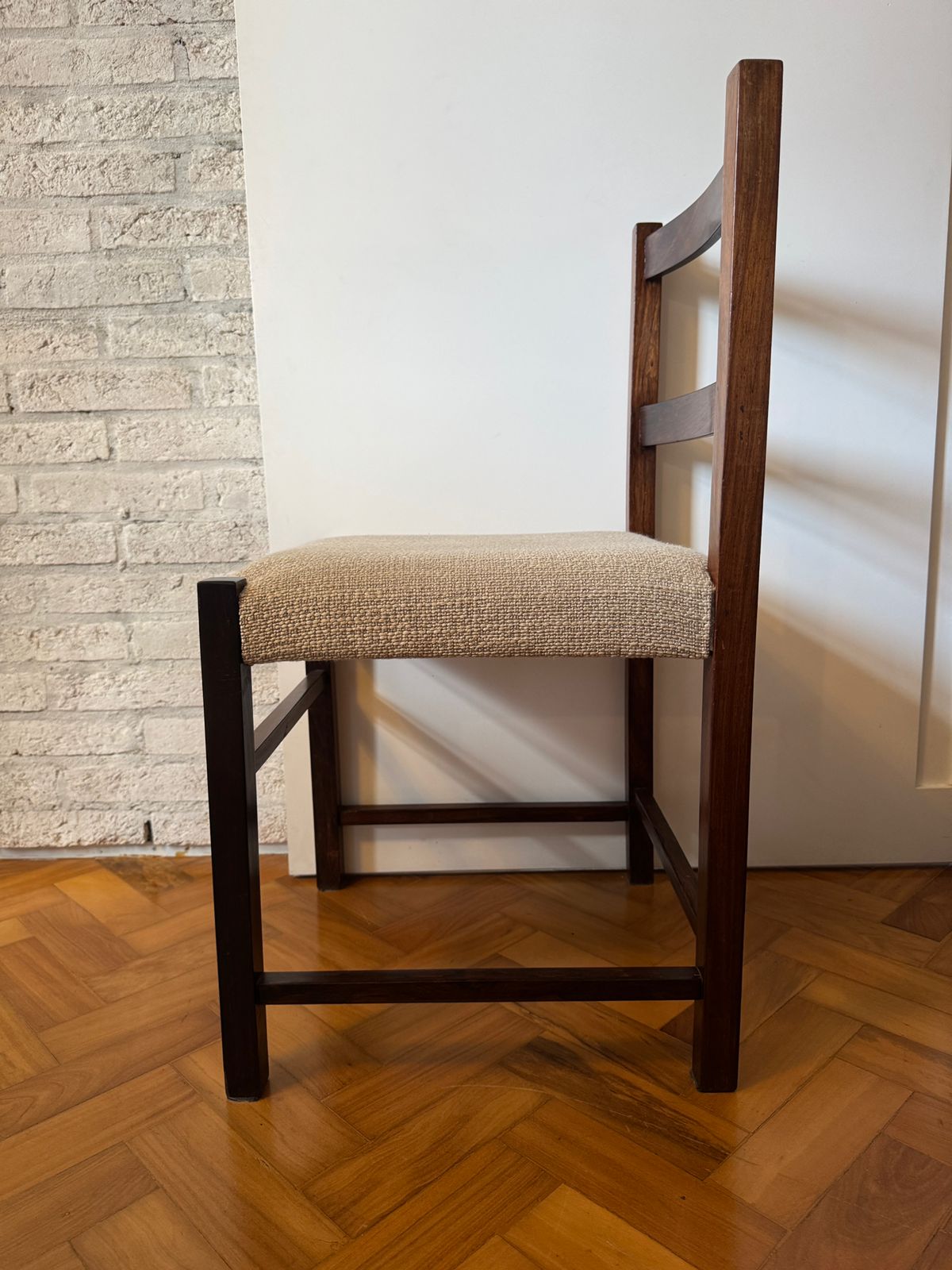 Conjunto com quatro cadeiras Sérgio Rodrigues, confeccionadas em Jacarandá, restauradas em 2022. Forro atual em linhão hidrorepelente Quacker.