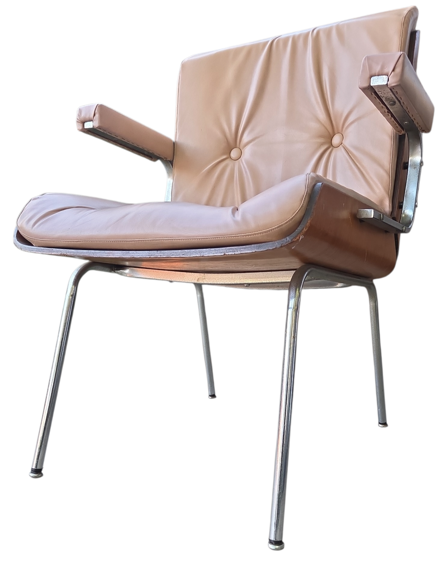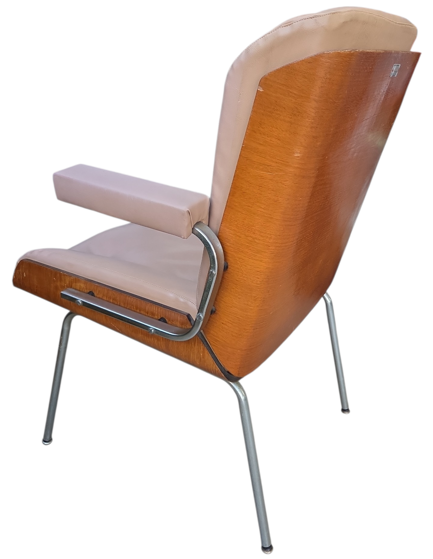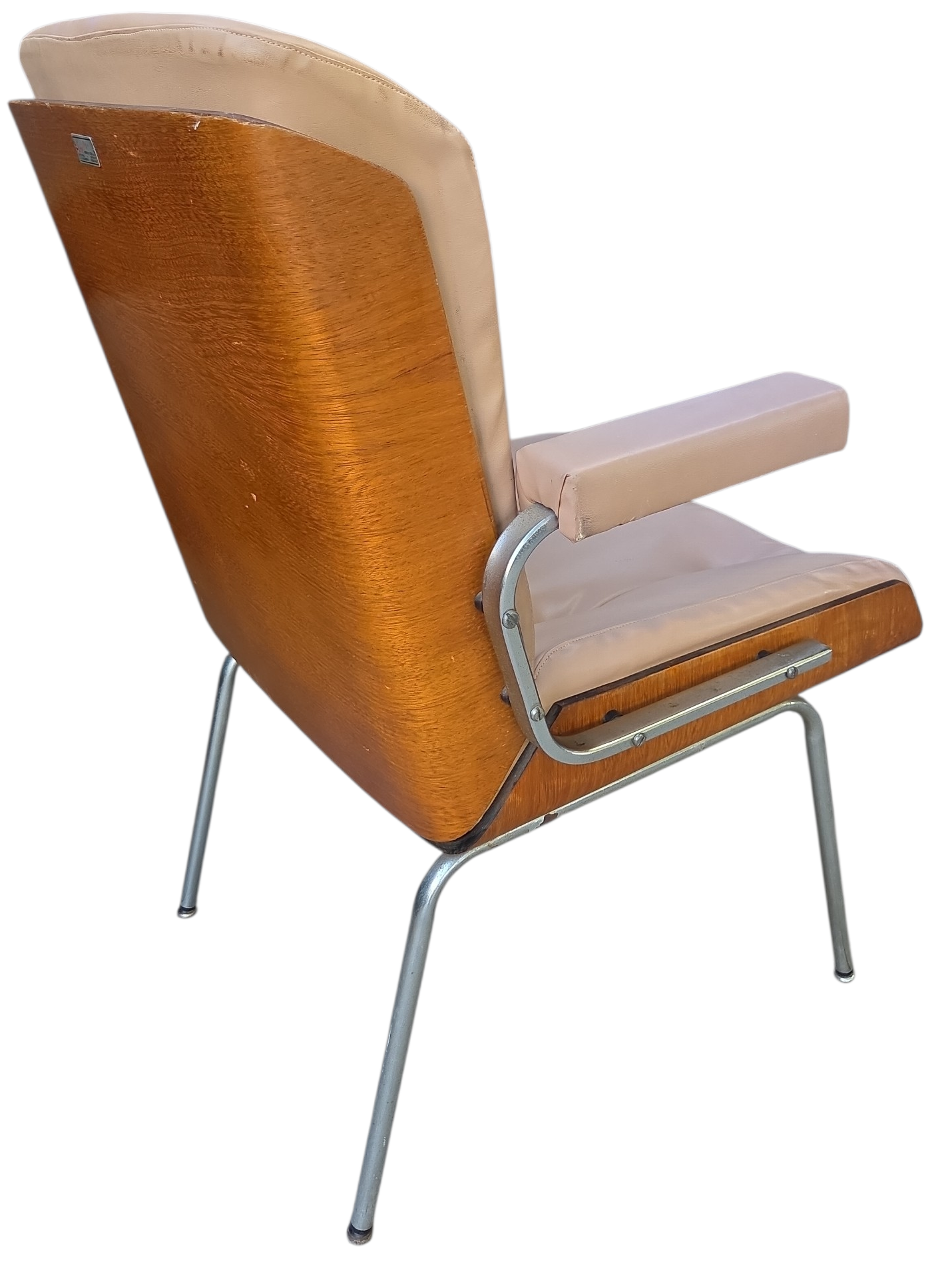 Rara cadeira de escritório fabricada pela Móveis Cimo (Curitiba-PR), o maior nome da história do mobiliário industrial brasileiro. Este modelo faz parte da Linha Estil, caracterizada pelo design funcional e uso de materiais nobres para a época.