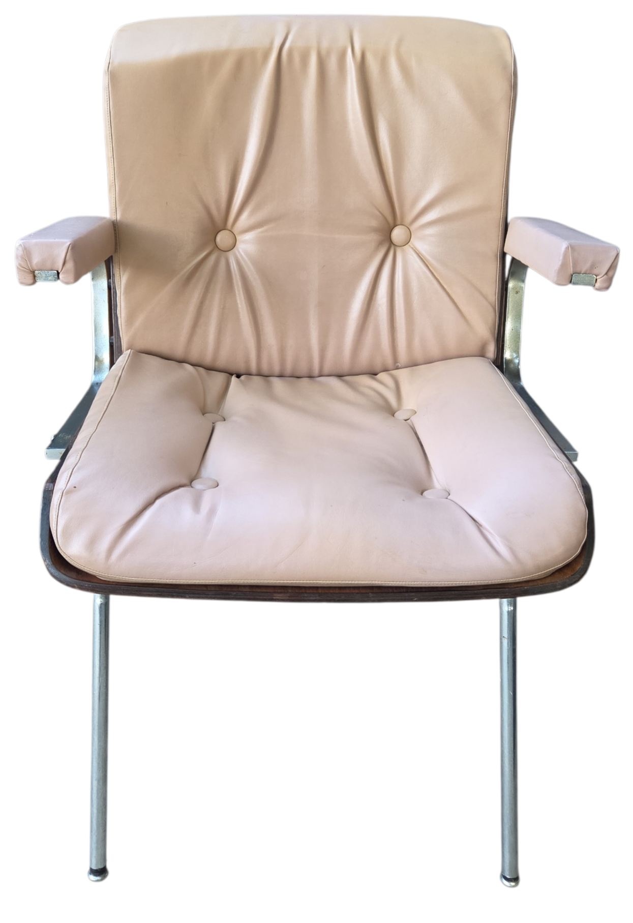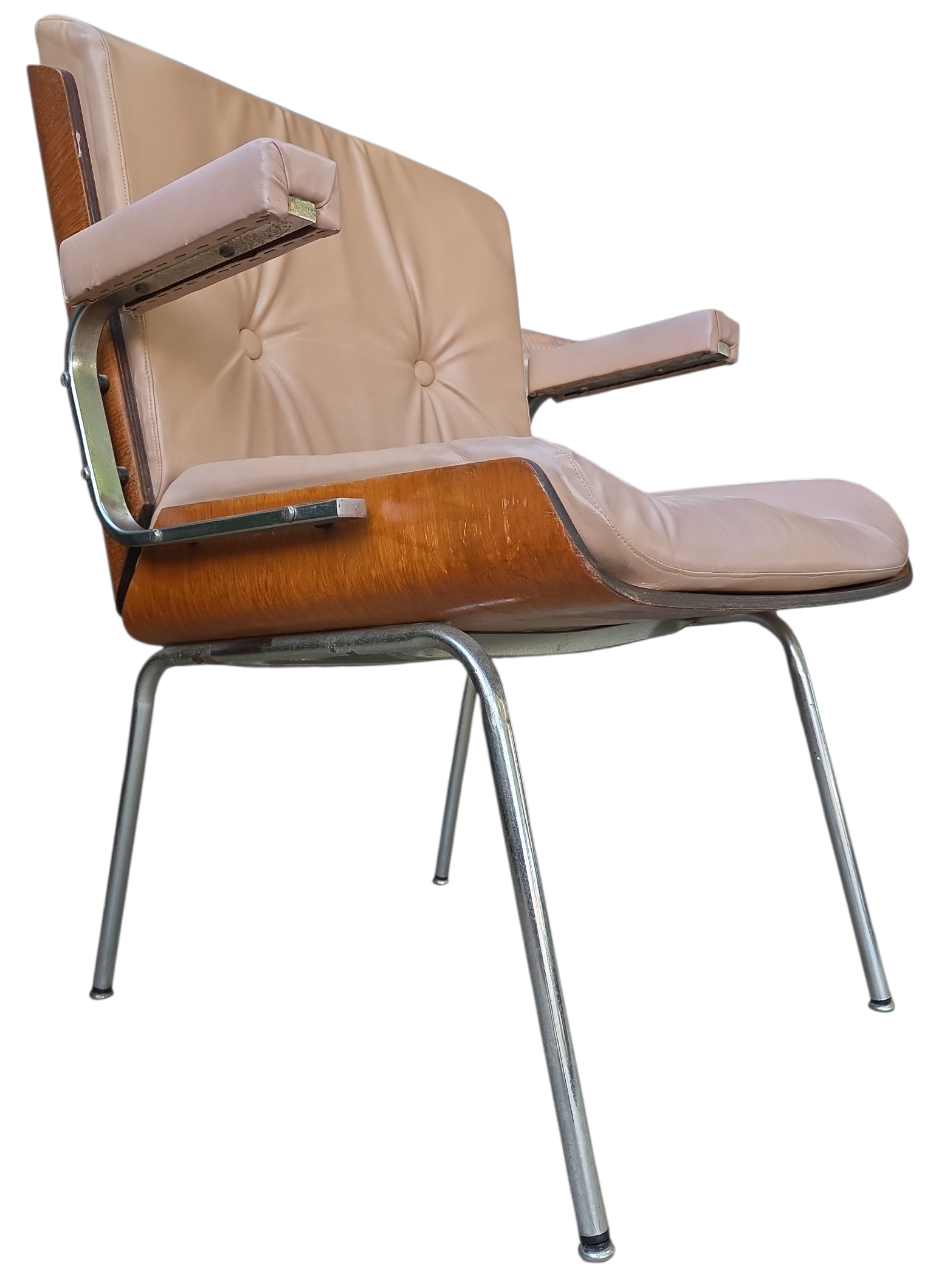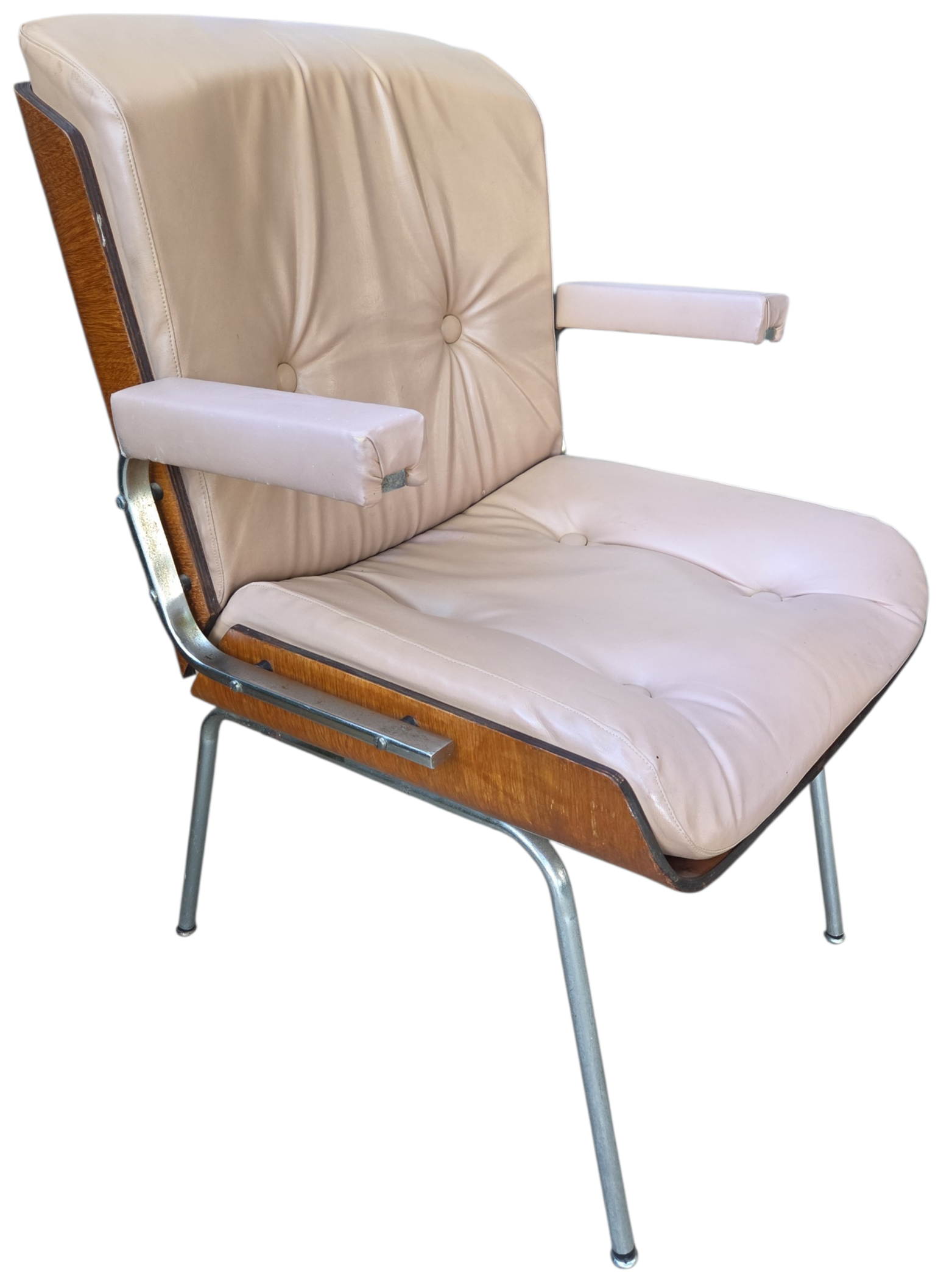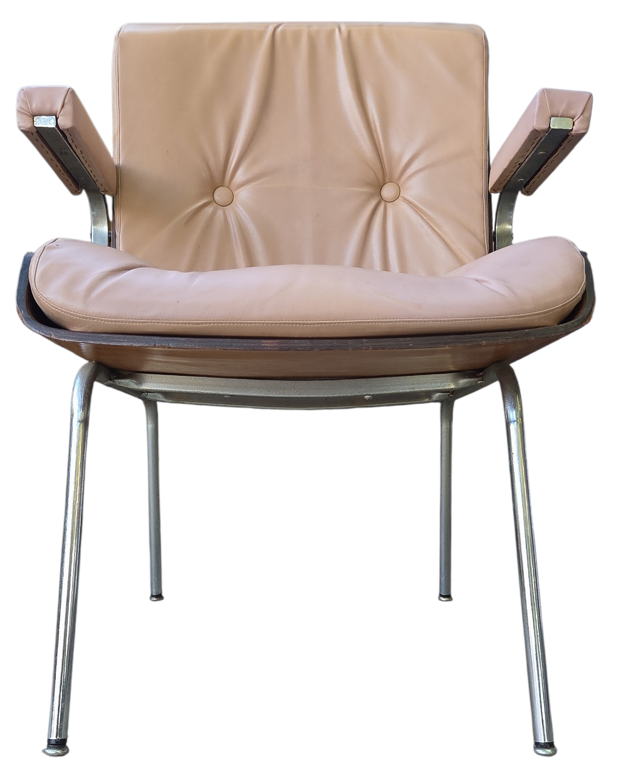 Rara cadeira de escritório fabricada pela Móveis Cimo (Curitiba-PR), o maior nome da história do mobiliário industrial brasileiro. Este modelo faz parte da Linha Estil, caracterizada pelo design funcional e uso de materiais nobres para a época.