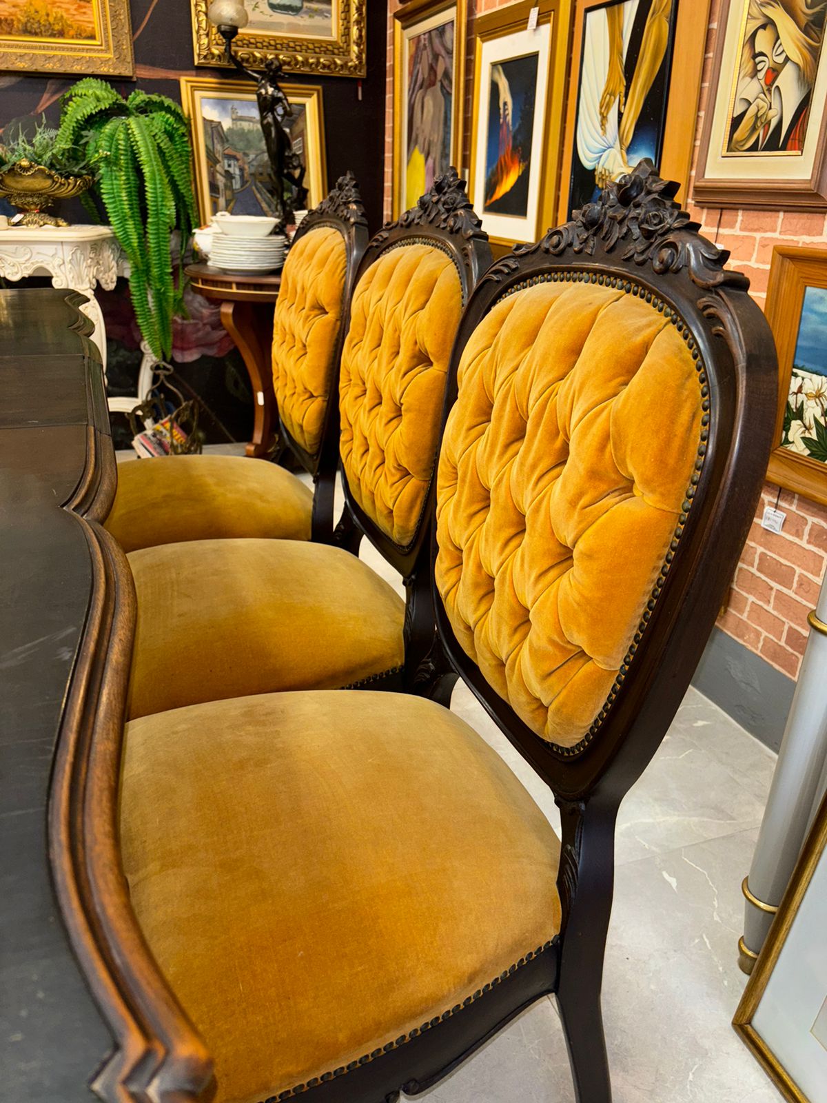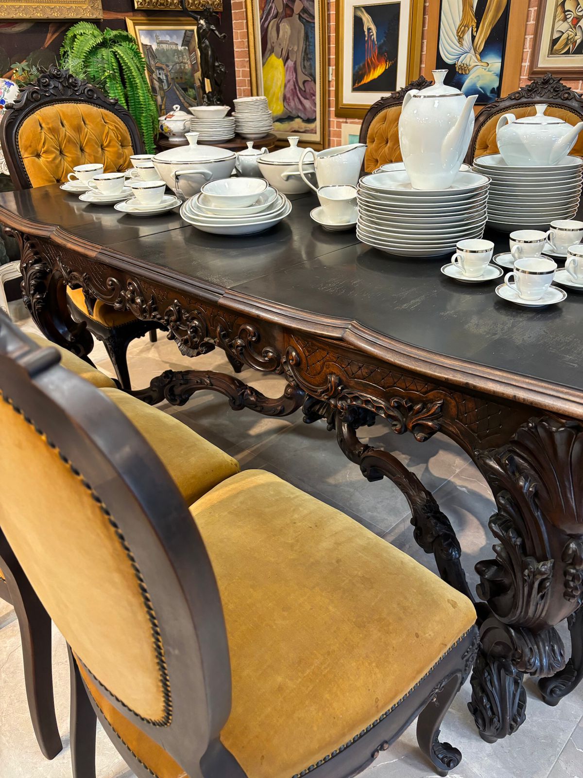 Magnífico jogo de jantar antigo, confeccionado em imbuia maciça entalhada, madeira nobre amplamente reconhecida por sua durabilidade, beleza natural e valor histórico.