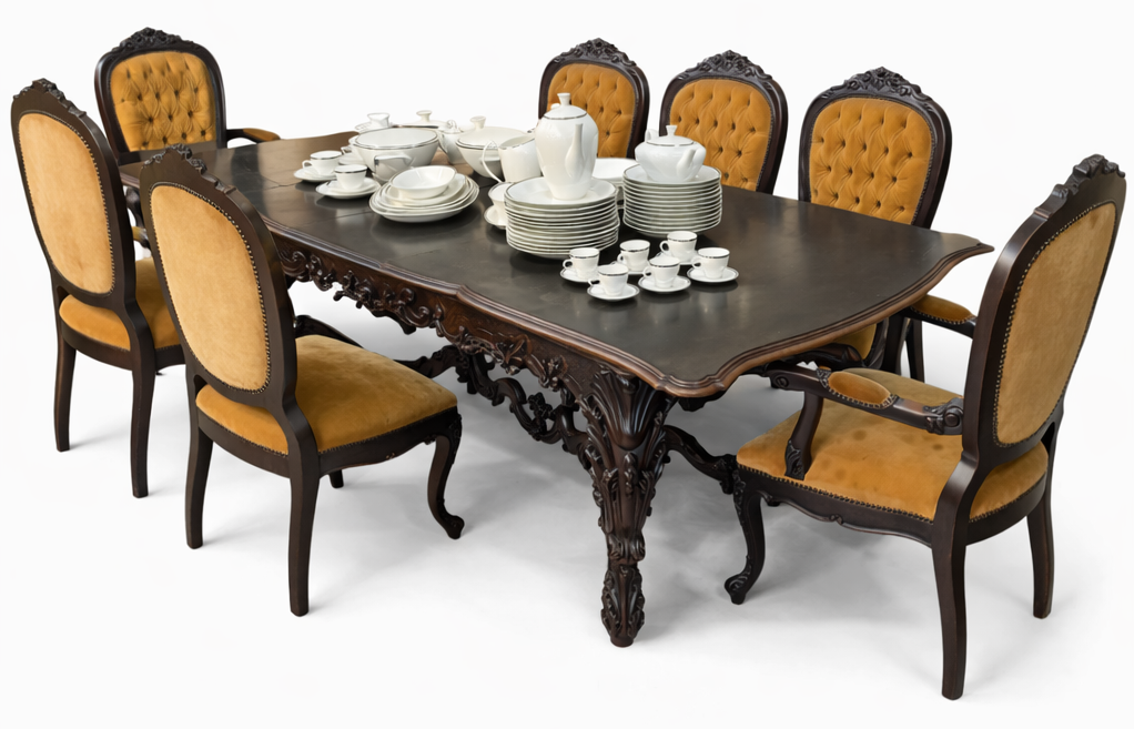A mesa apresenta entalhes ricos e bem definidos, evidenciando o trabalho artesanal da época. O conjunto é composto por 6 cadeiras e 2 poltronas, todas com estrutura robusta e design clássico, que oferecem conforto aliado à imponência estética.