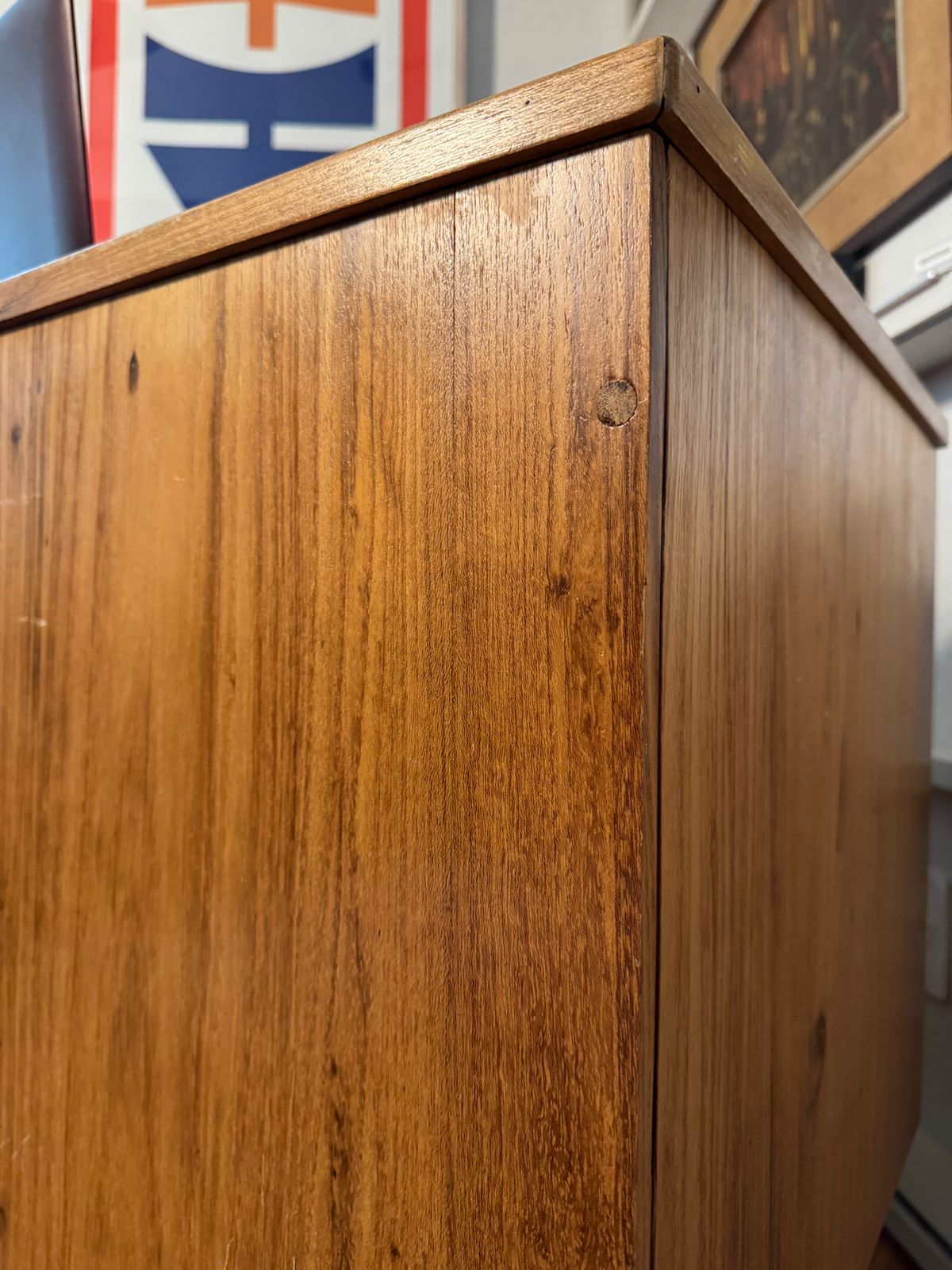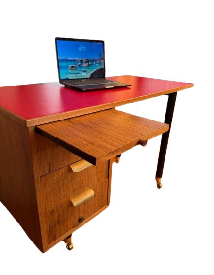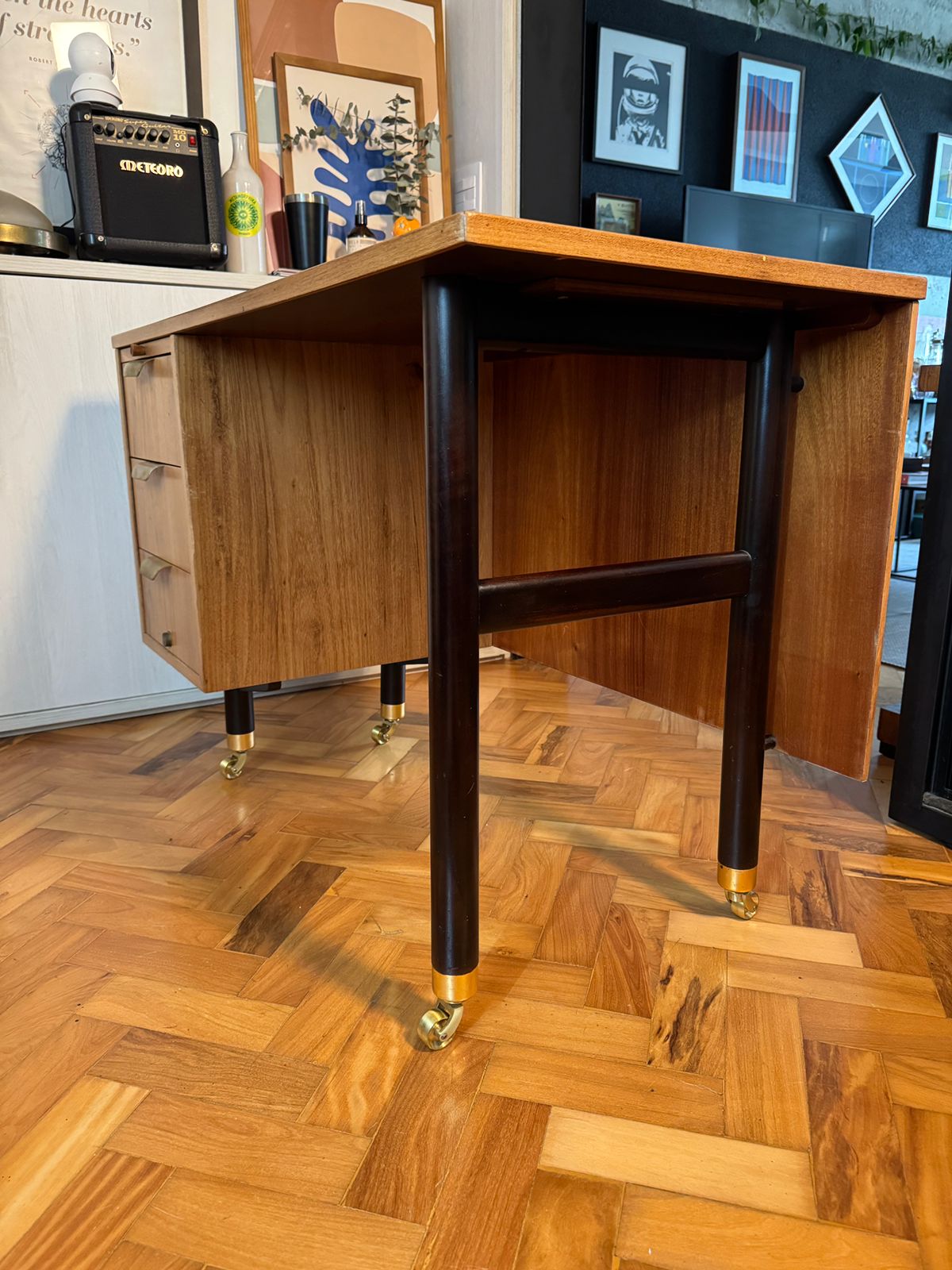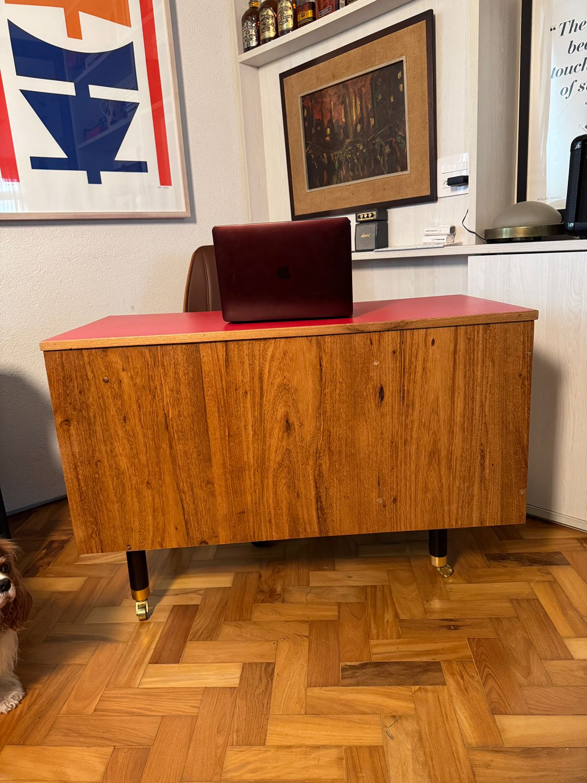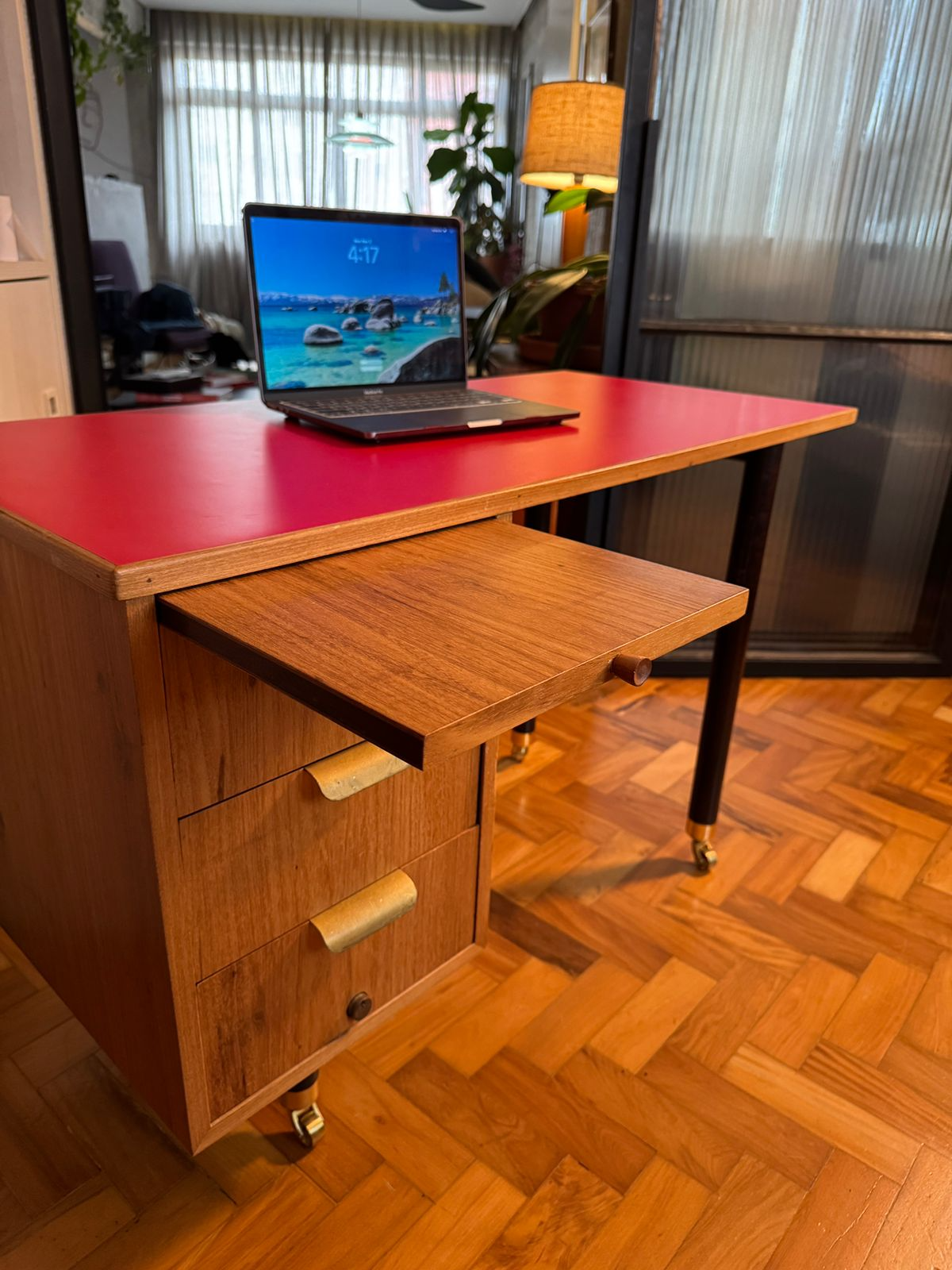 Comprada e restaurada em 2019, quando o tampo foi revestido em vermelho e adicionamos as rodinhas. Ambos, facilmente reversíveis.