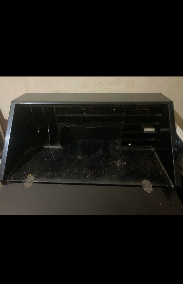 O tampo rebatível funciona perfeitamente, revelando o rico e intacto compartimento interno (papeleira com nichos