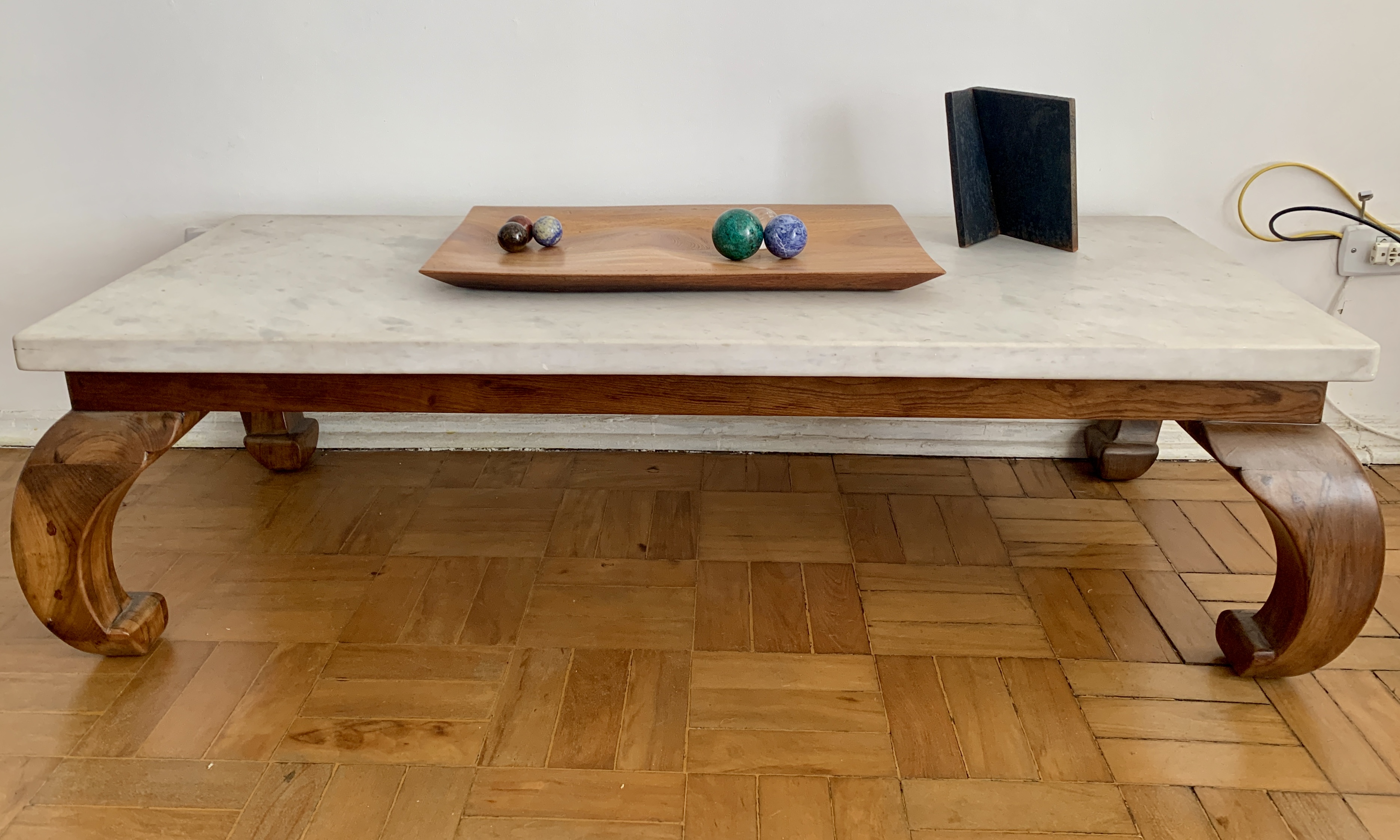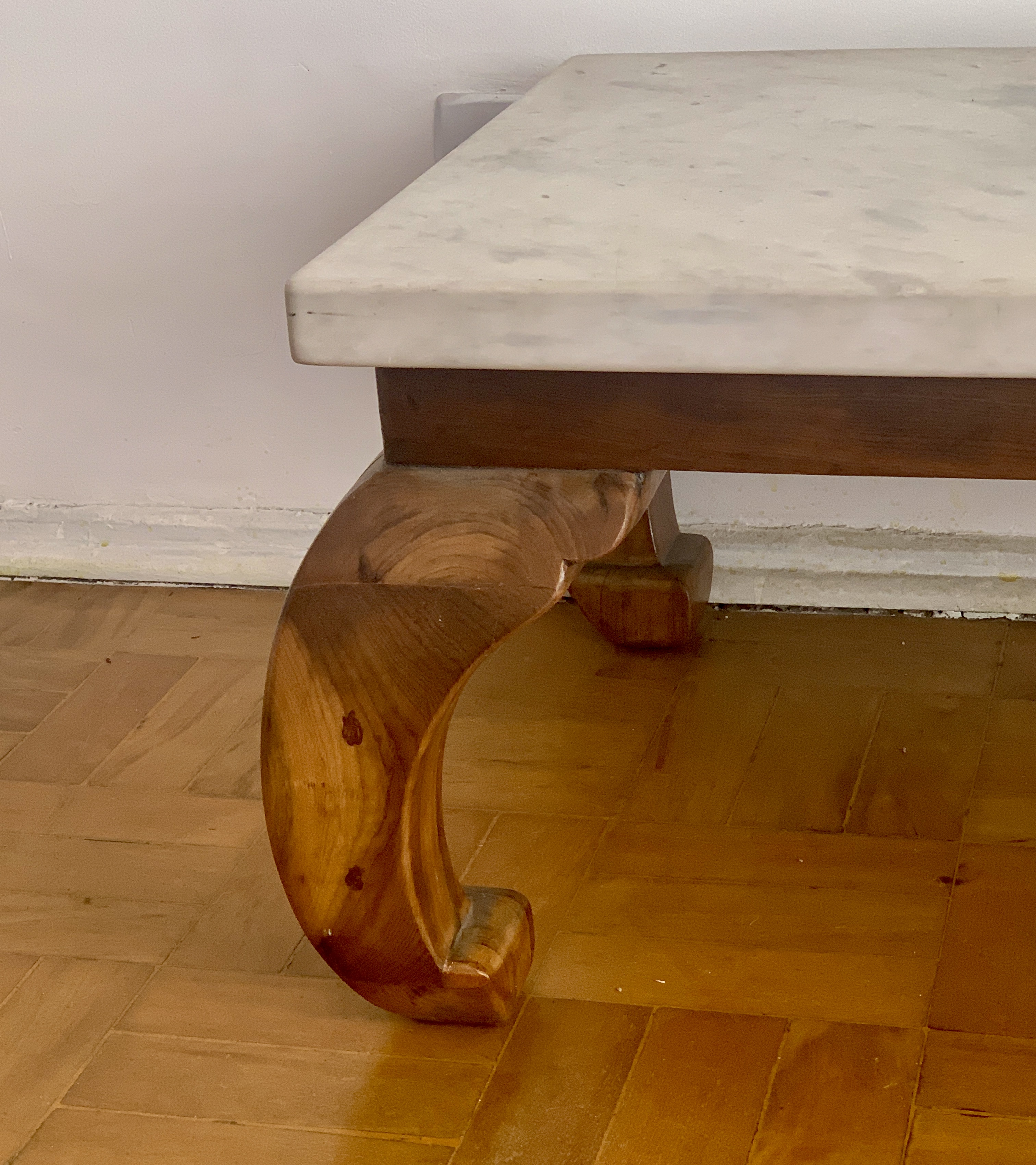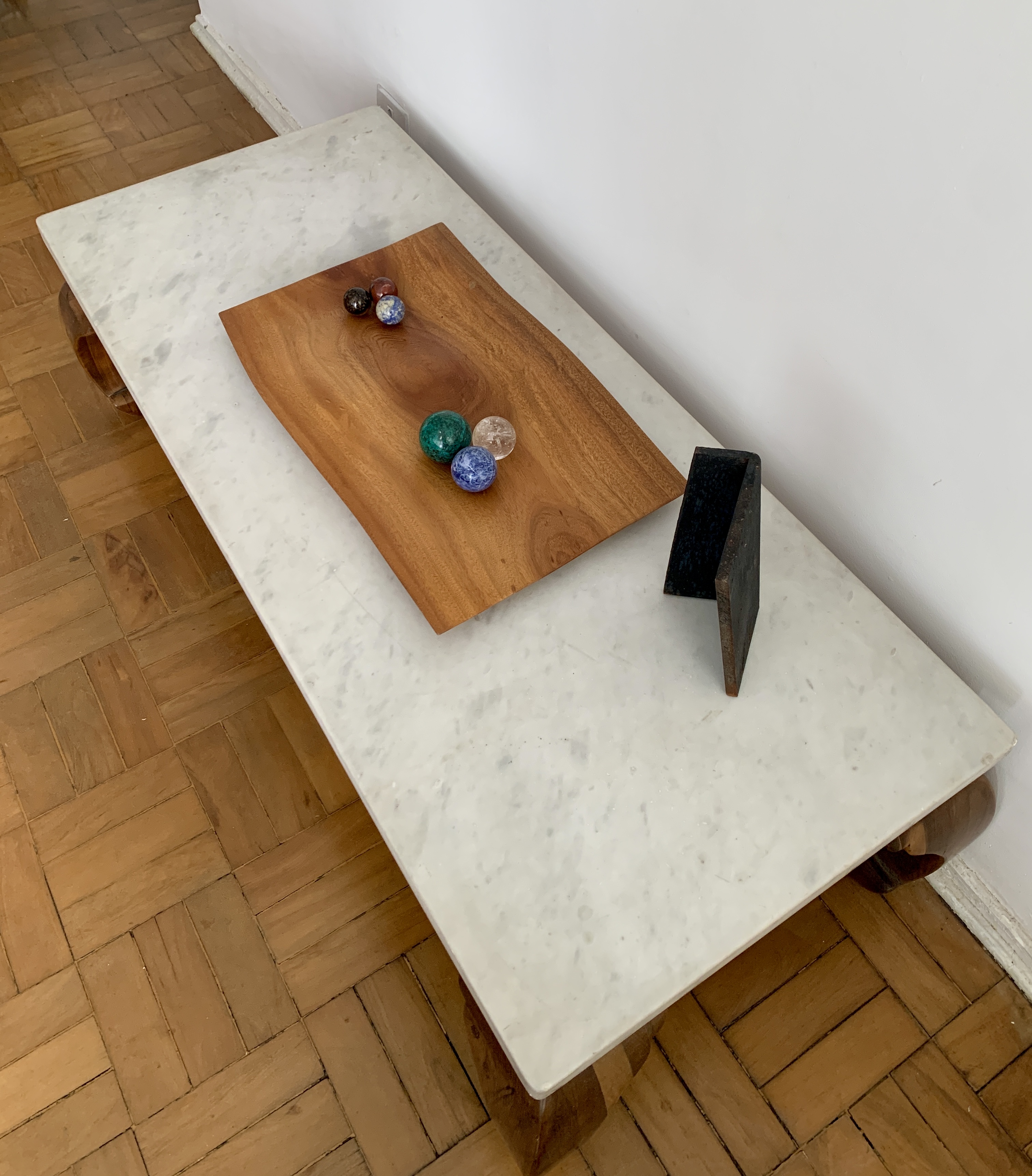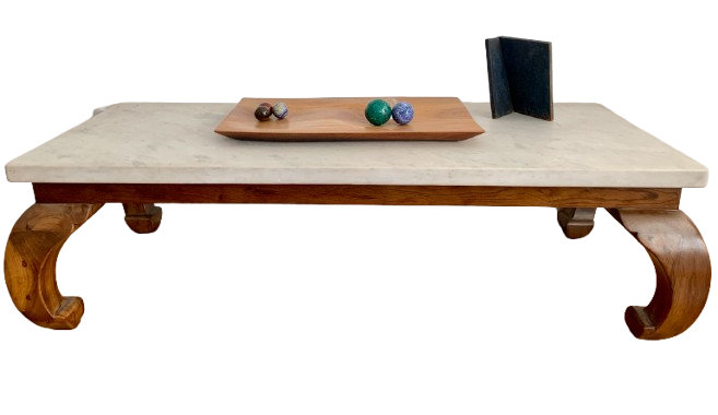 Vistosa mesa de centro anos 60 em imbúia com pés torneados e tampo em mármore maciço branco de 4cm de espessura medindo 1,40 C x 60 L x 41A.