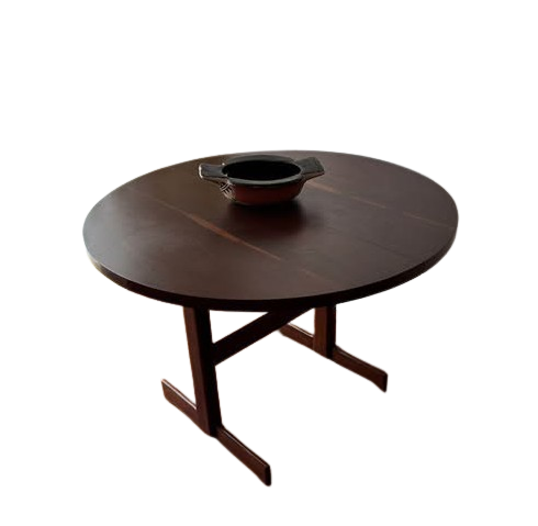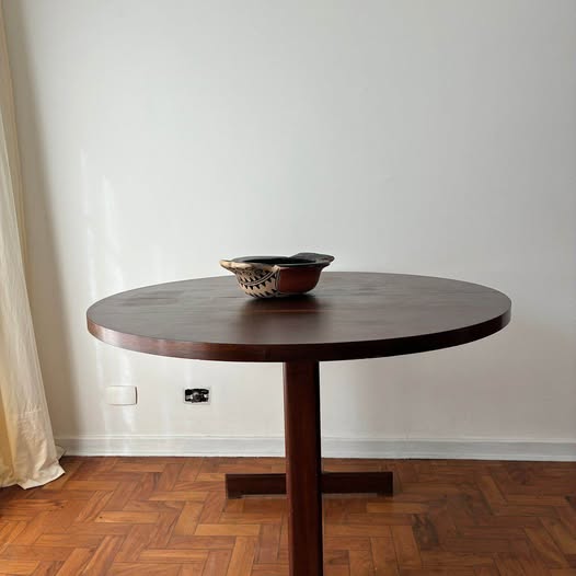 Mesa em madeira nobre com 120 cm de diâmetro. 156cm aberta.