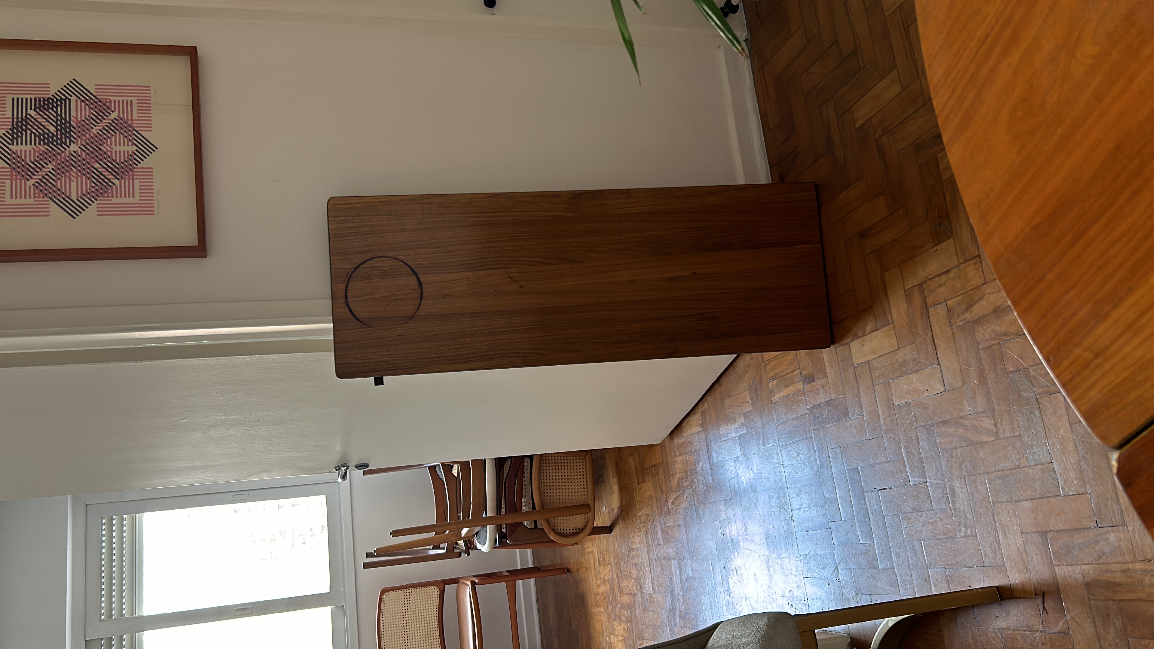 - Tábua extensora de madeira original inclusa, carrega uma marca de uso — rastro do tempo em que essa mesa foi vivida de verdade