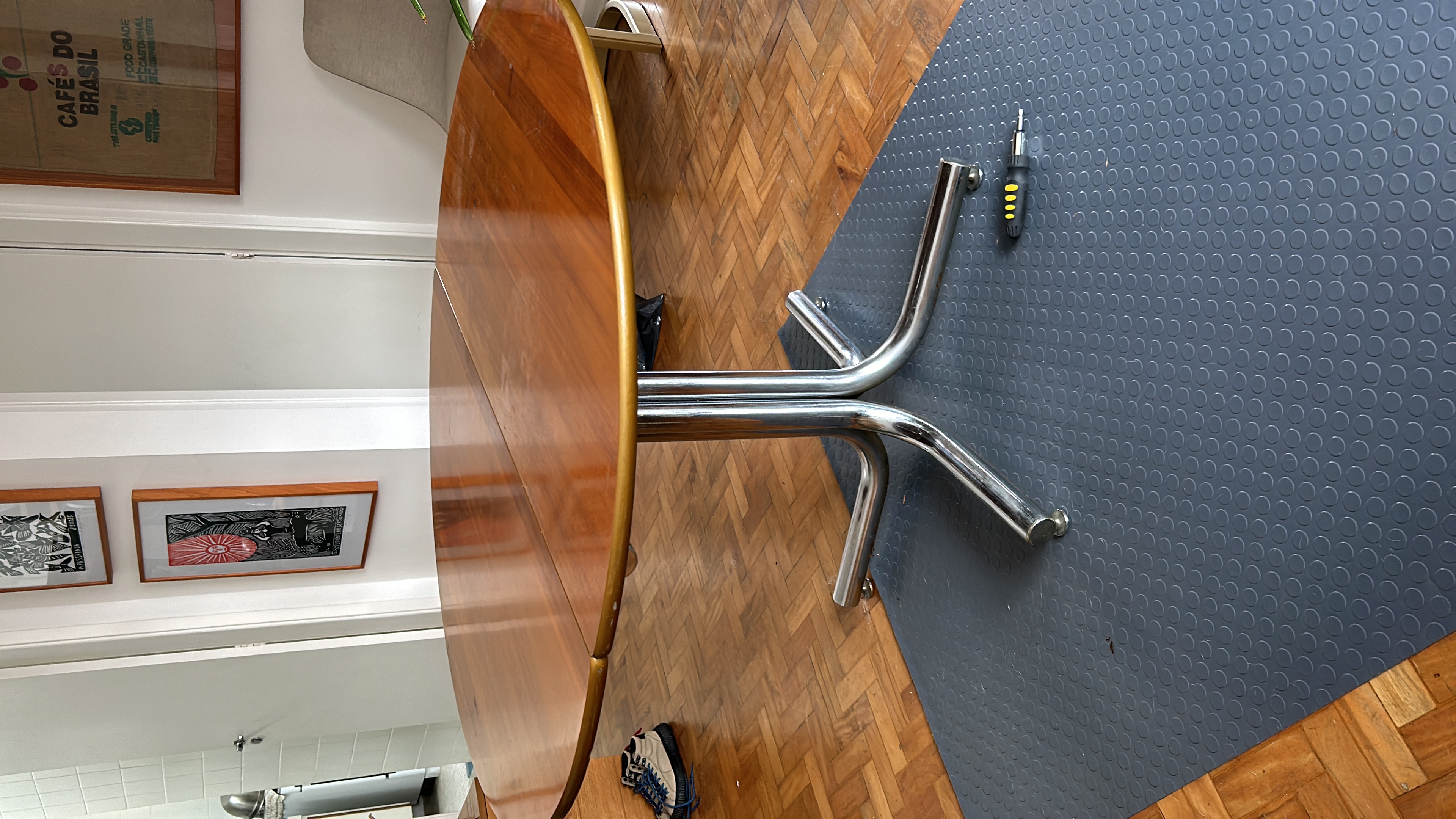 A peça acompanha a tábua extensora de madeira original, que permite ampliar a mesa de redonda para formato oval, comportando mais lugares à mesa. Acompanha também 3 das 4 abraçadeiras metálicas originais de fixação — detalhe que qualquer marceneiro resolve com facilidade.