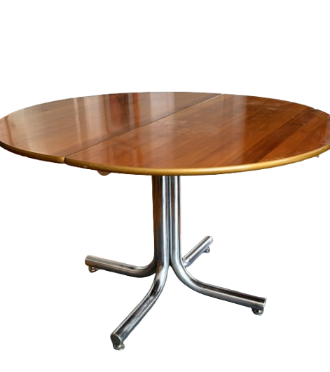 Mesa de jantar redonda extensível design Geraldo de Barros para Hobjeto, produzida na década de 1970. Garimpada em leilão e submetida a restauro cuidadoso: o tampo em madeira nobre foi tratado e voltou a brilhar, e a base em metal tubular cromado — marca registrada da Hobjeto está impecável (mas ainda há marcas dos anos).