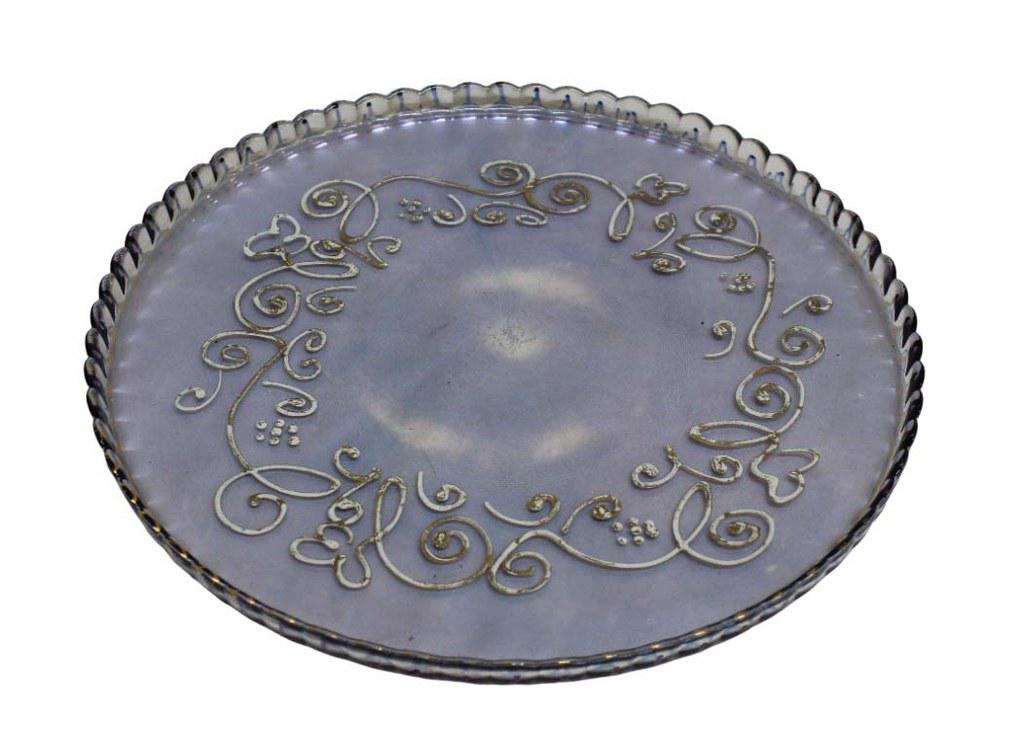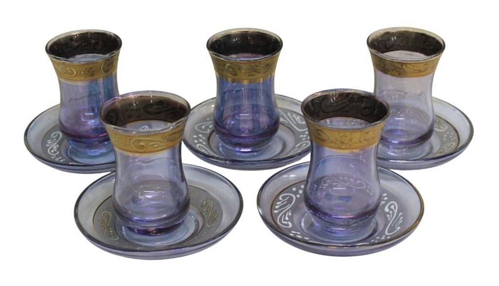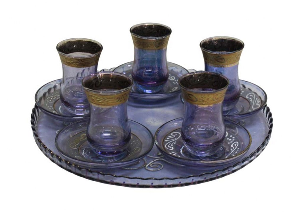 Conjunto para chá em vidro na tonalidade lilás, acompanha bandeja redonda com decoração em arabescos dourados e 5 copos com seus respectivos pires.