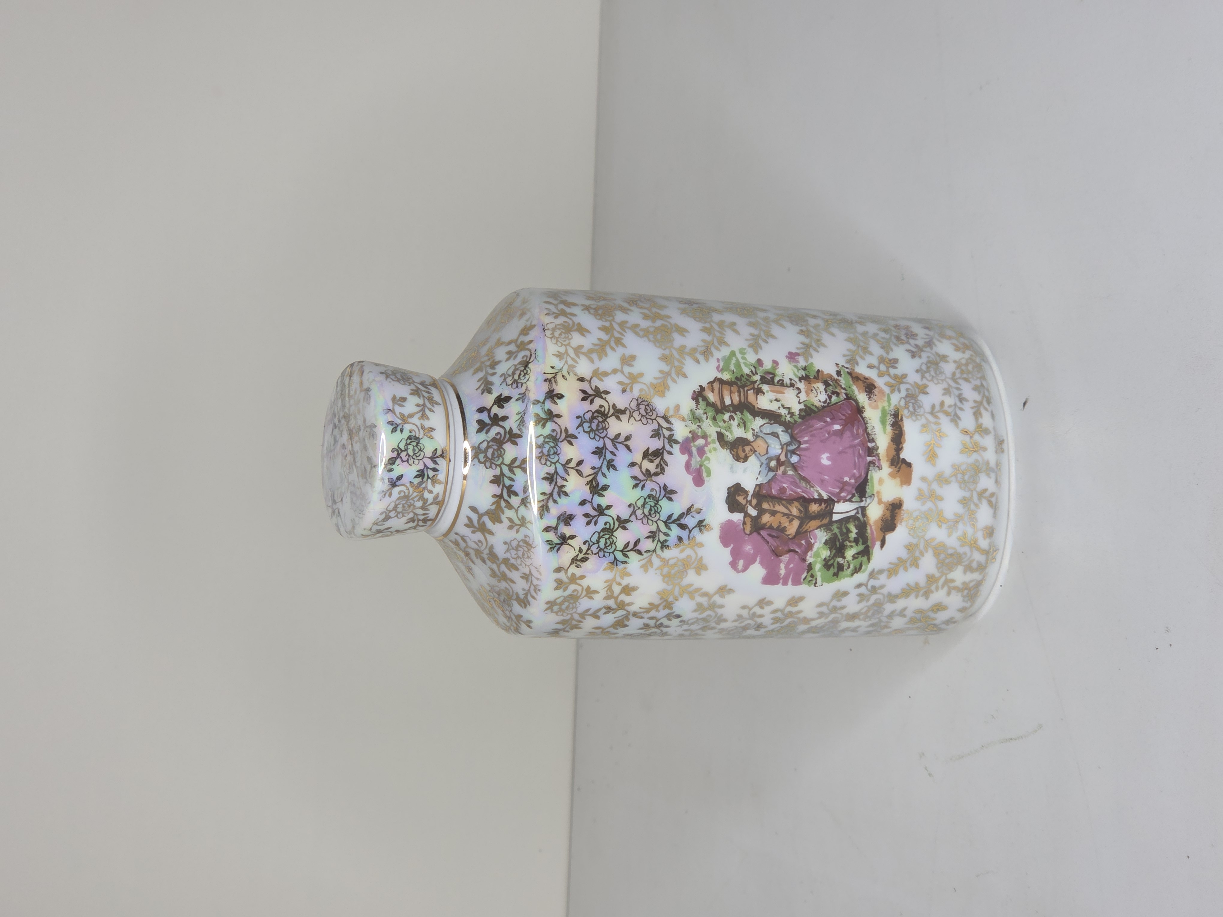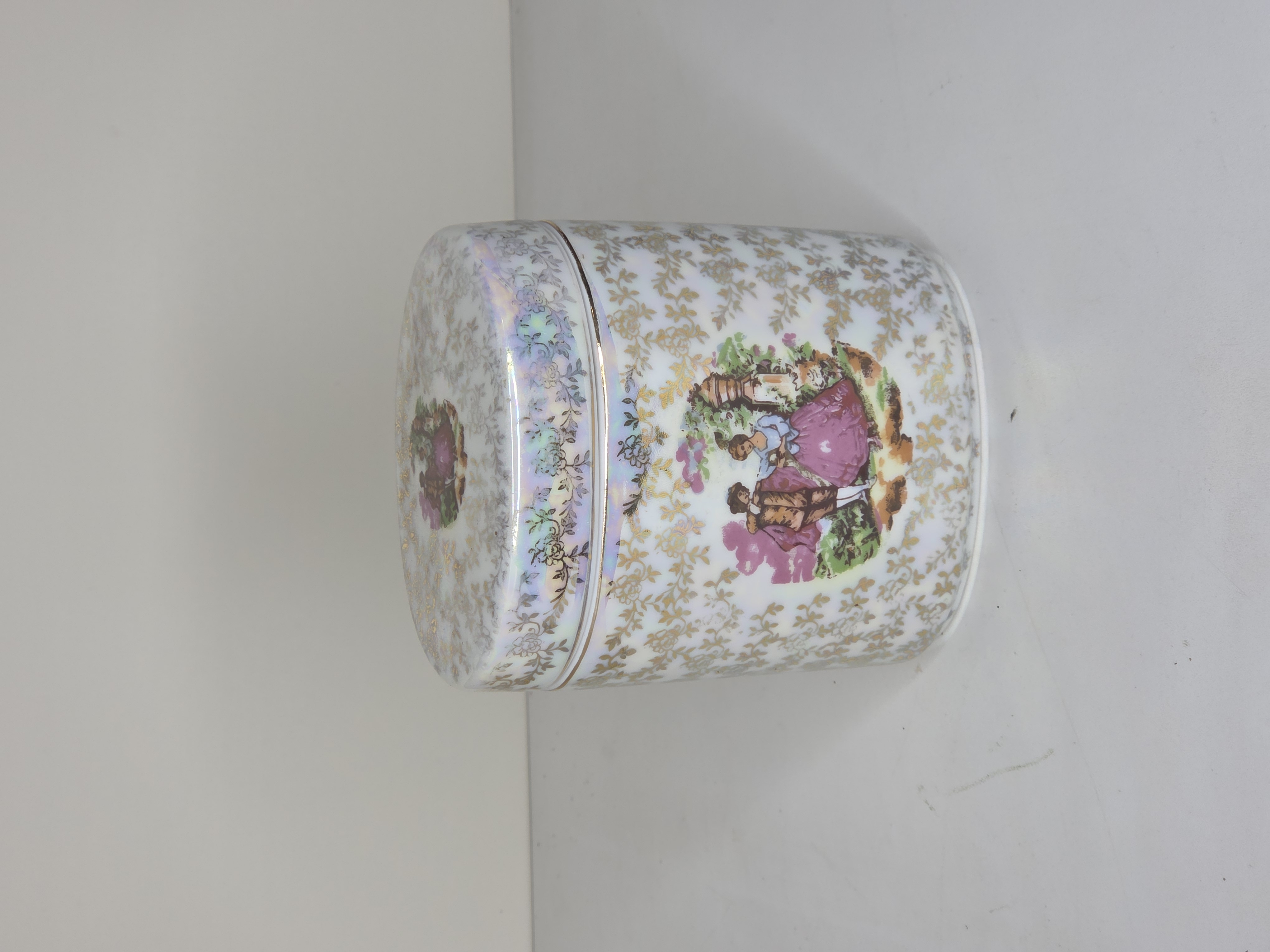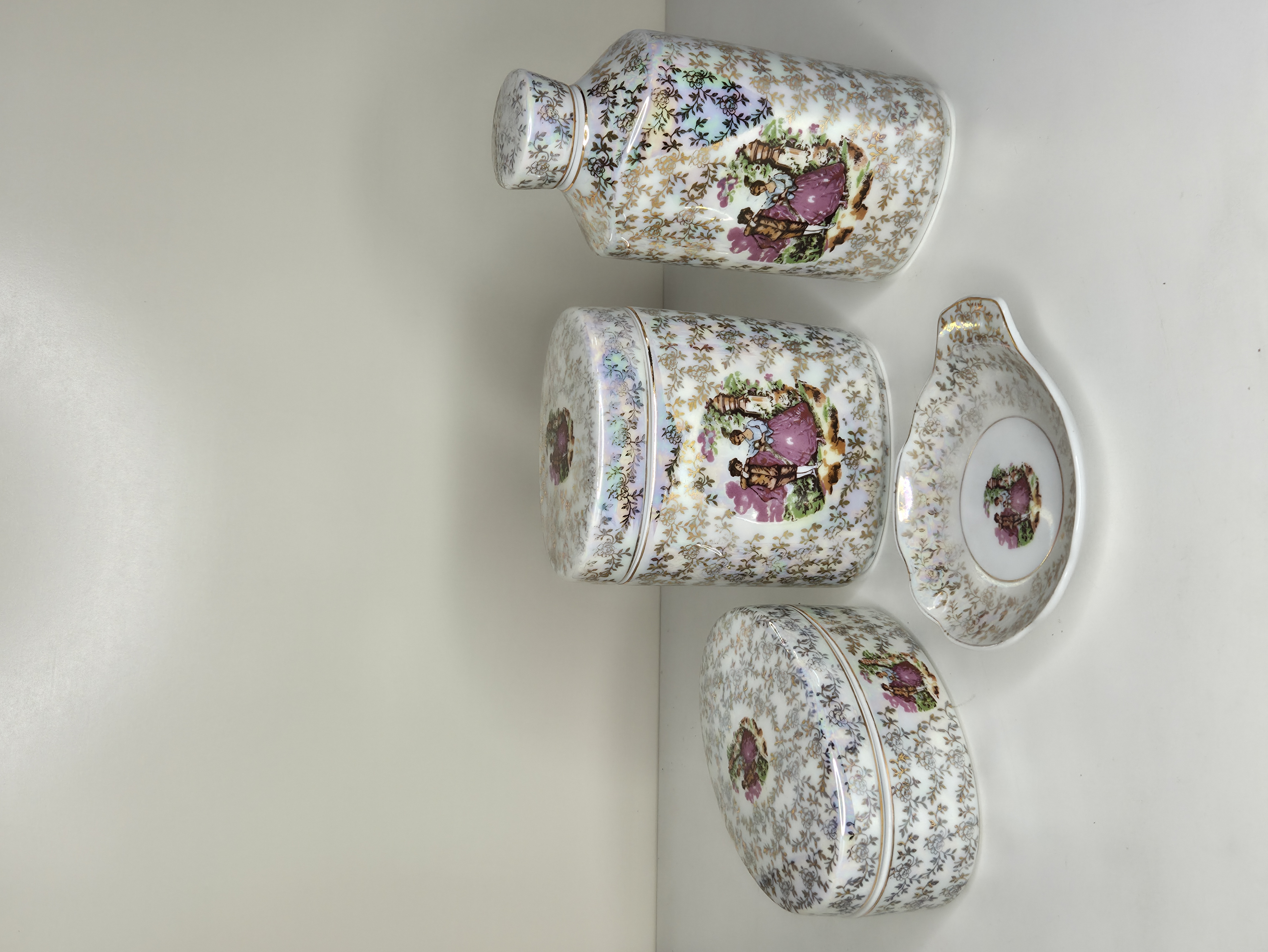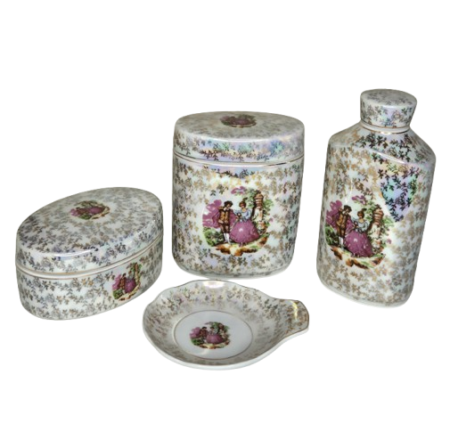 Adicione um toque de nobreza ao seu lavabo com este requintado kit em porcelana esmaltada. Decorado com delicadas cenas galantes que evocam o romantismo, cada peça apresenta um acabamento vitrificado impecável e detalhes minuciosos. Uma verdadeira joia funcional que transforma o ambiente em um espaço de pura elegância clássica.