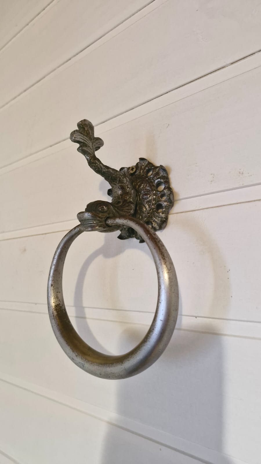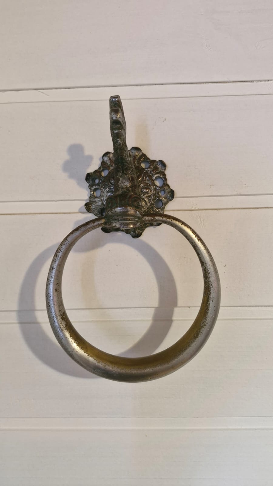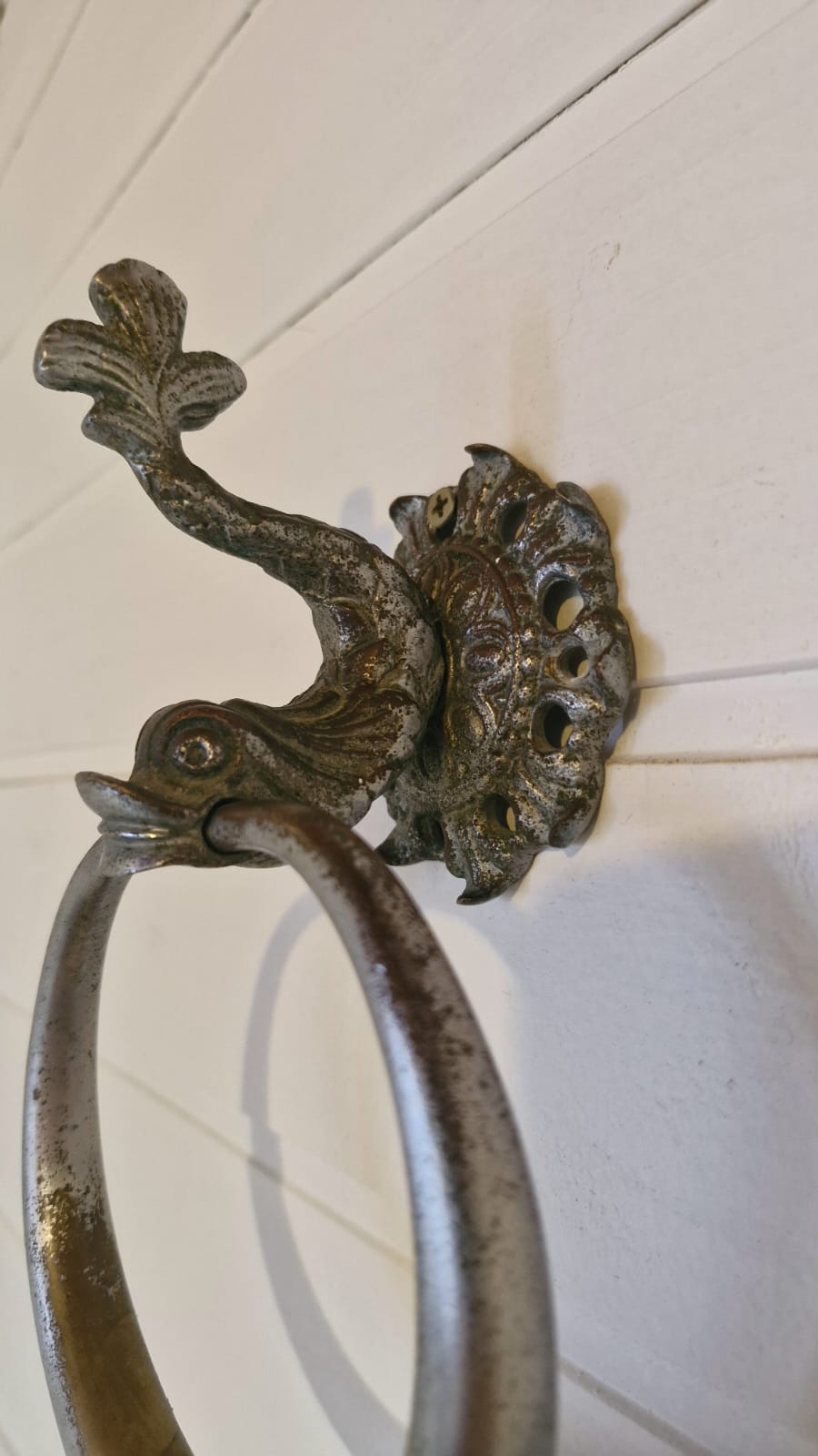 Belíssimo porta-toalha de parede em estilo clássico, apresentando um design ornamental e vintage que remete a artigos de luxo de décadas passadas.