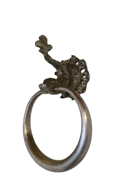 - Motivo Central: A peça é esculpida no formato de uma carpa. Esse elemento curvo serve de suporte para a argola e apresenta detalhes minuciosos de escamas e barbatanas.