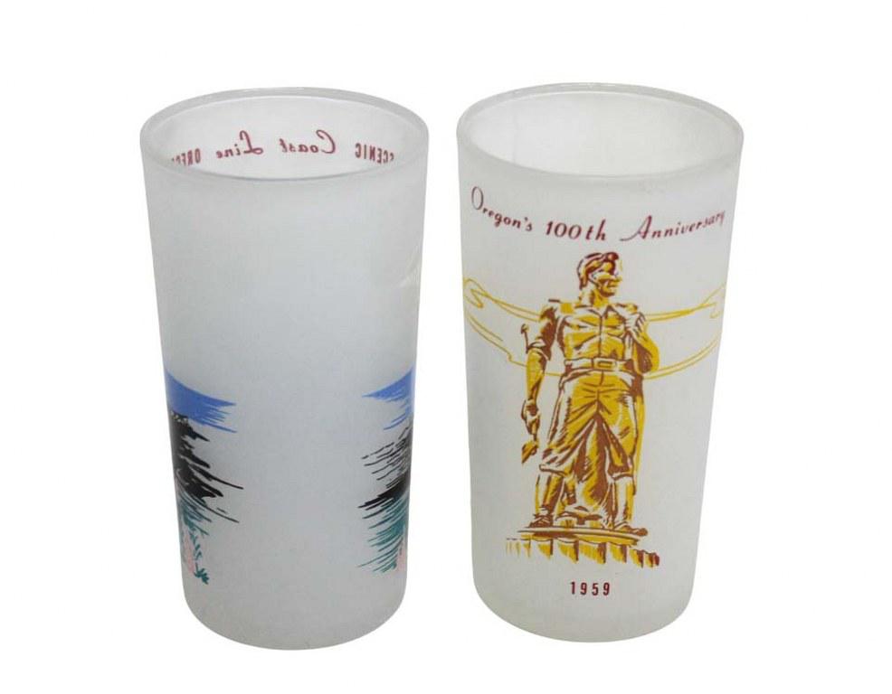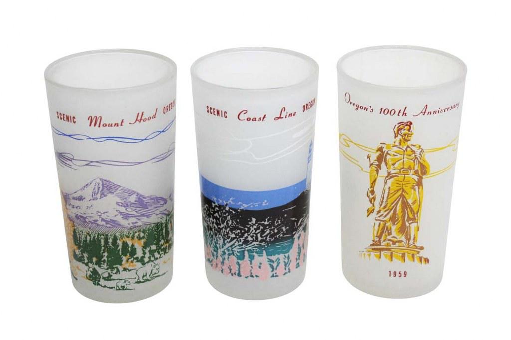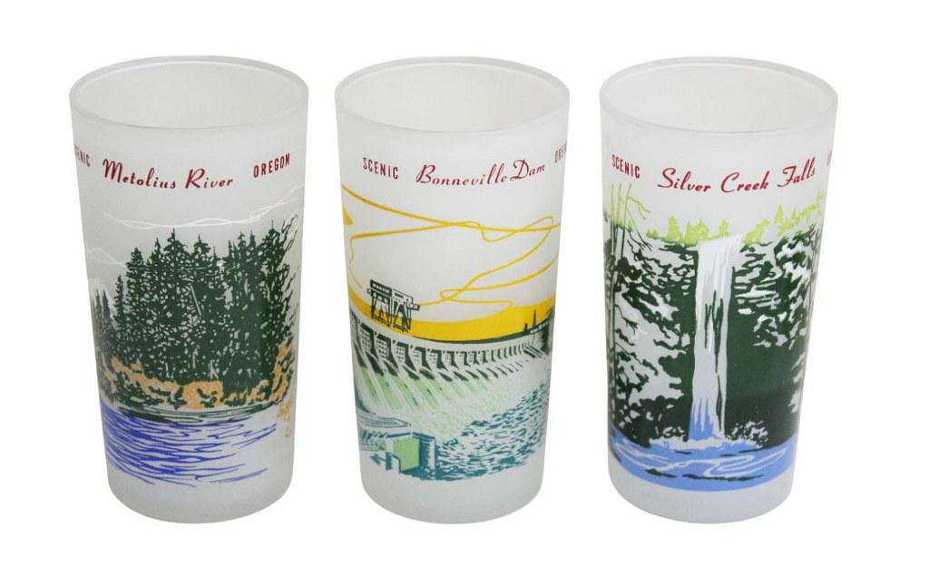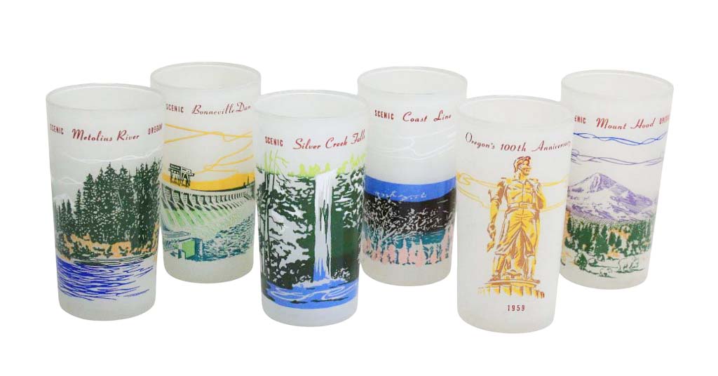 Conjunto de 6 Copos Foscos Retrô de 1959 - Centenário do Oregon - São uma seleção de um conjunto produzido em 1959 para o centenário do Oregon. Cinco dos copos são do conjunto original, enquanto o copo "Oregon's 100th Anniversary" foi produzido um ano depois e fazia parte de um lote com a palavra "Anniverse" escrita incorretamente. Todos os copos apresentam relevo colorido com fantásticas imagens retrô de alguns dos locais mais icônicos do Oregon. A inscrição vermelha "SCENIC OREGON" contorna o nome do local em cada copo. Este lote inclui: - Coast line - Mount Hood - Silver Creek Falls - Boneville Dam - Metolius River e Oregon 100th.