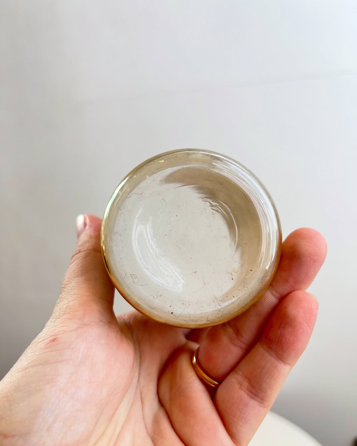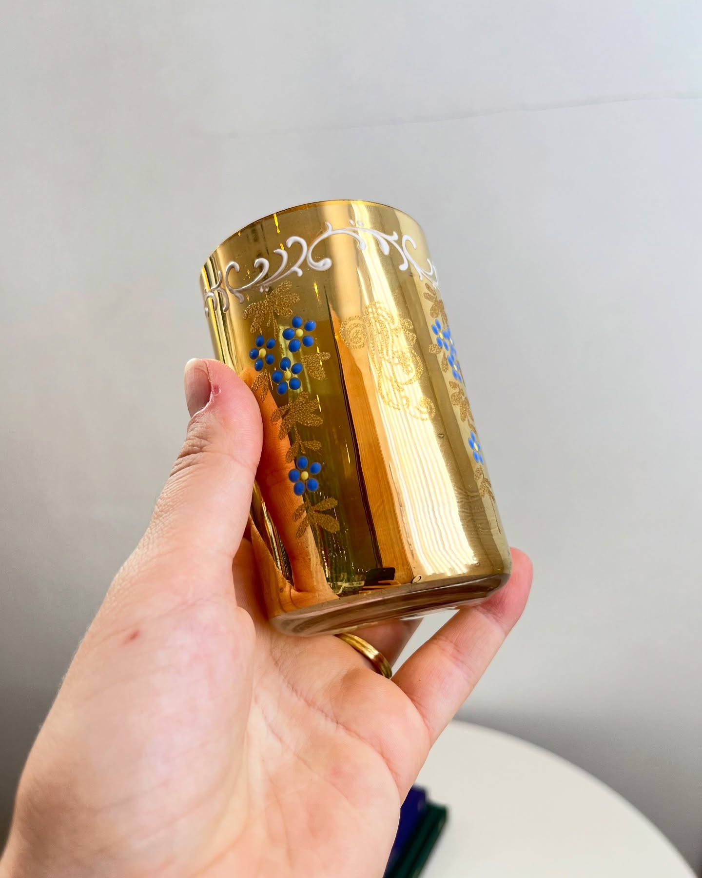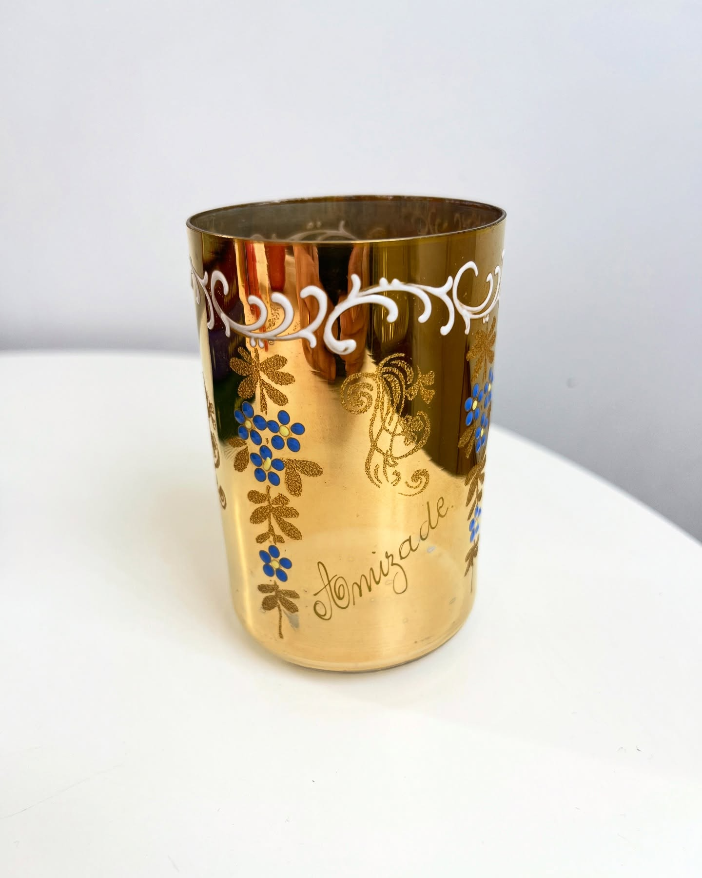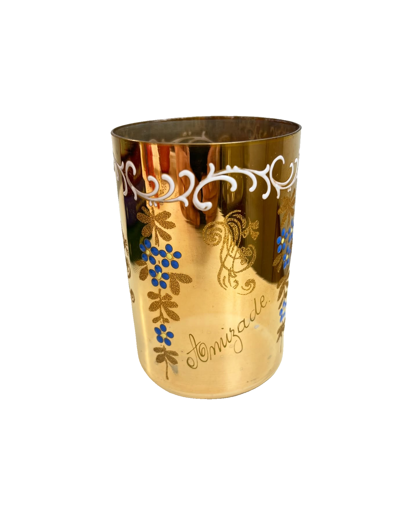 Copo em fino vidro furta cor com pinturas a mão em alto relevo e douração no fundo. Década de 40/50. Apresenta leves desgastes na pintura como mostrado nas fotos.