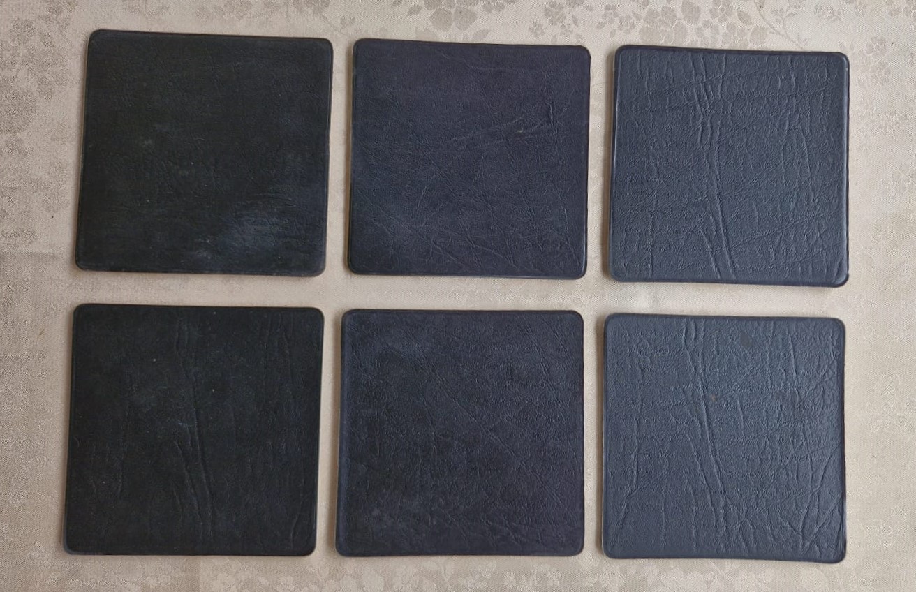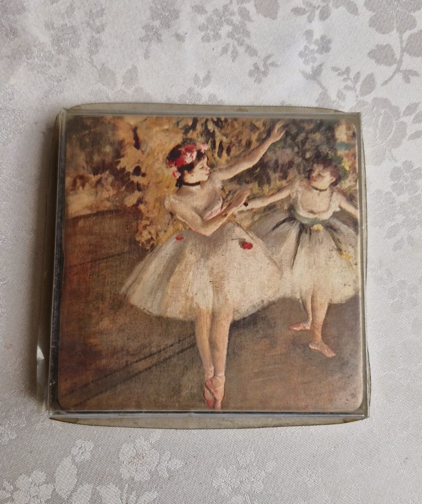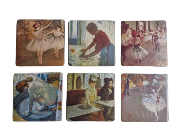 Lindo conjunto de 6 porta-copos em couro, representando pinturas do artista francês Edgar Degas, um impressionista do século XIX.